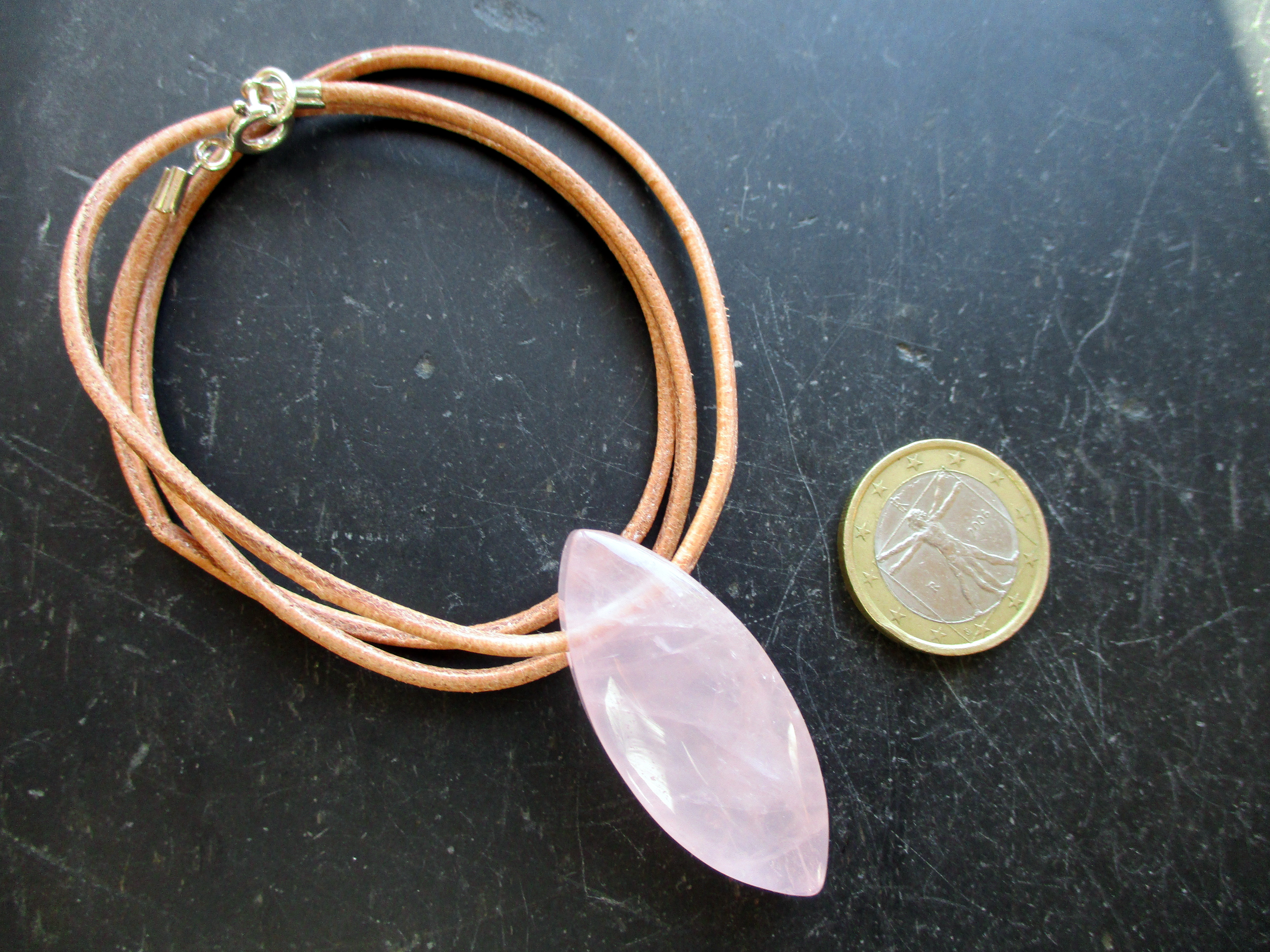 Material: Rosenquarz, Leder, Silber
