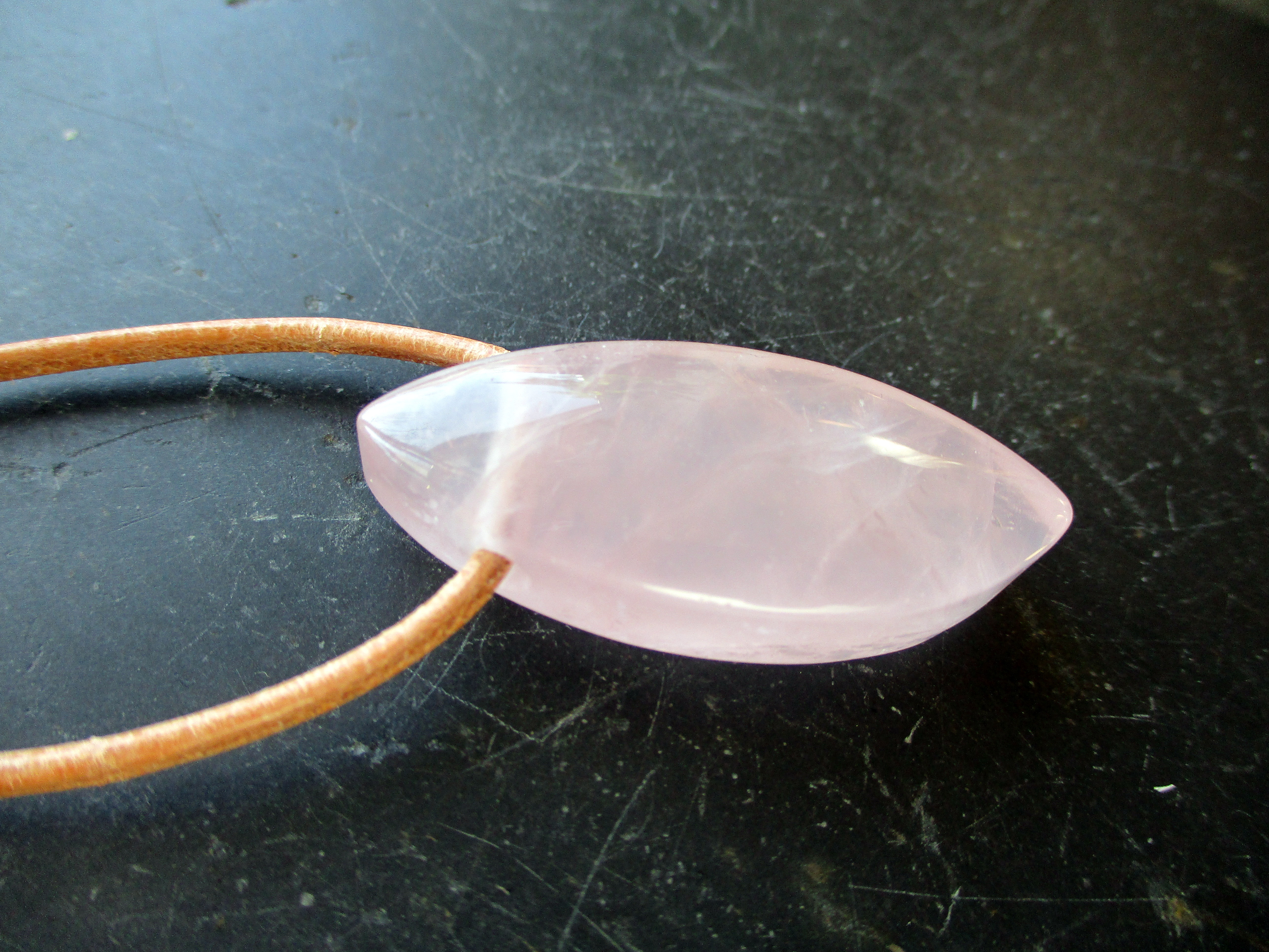 Sehr klar ist dieser Anhänger aus Rosenquarz in Navette Form.