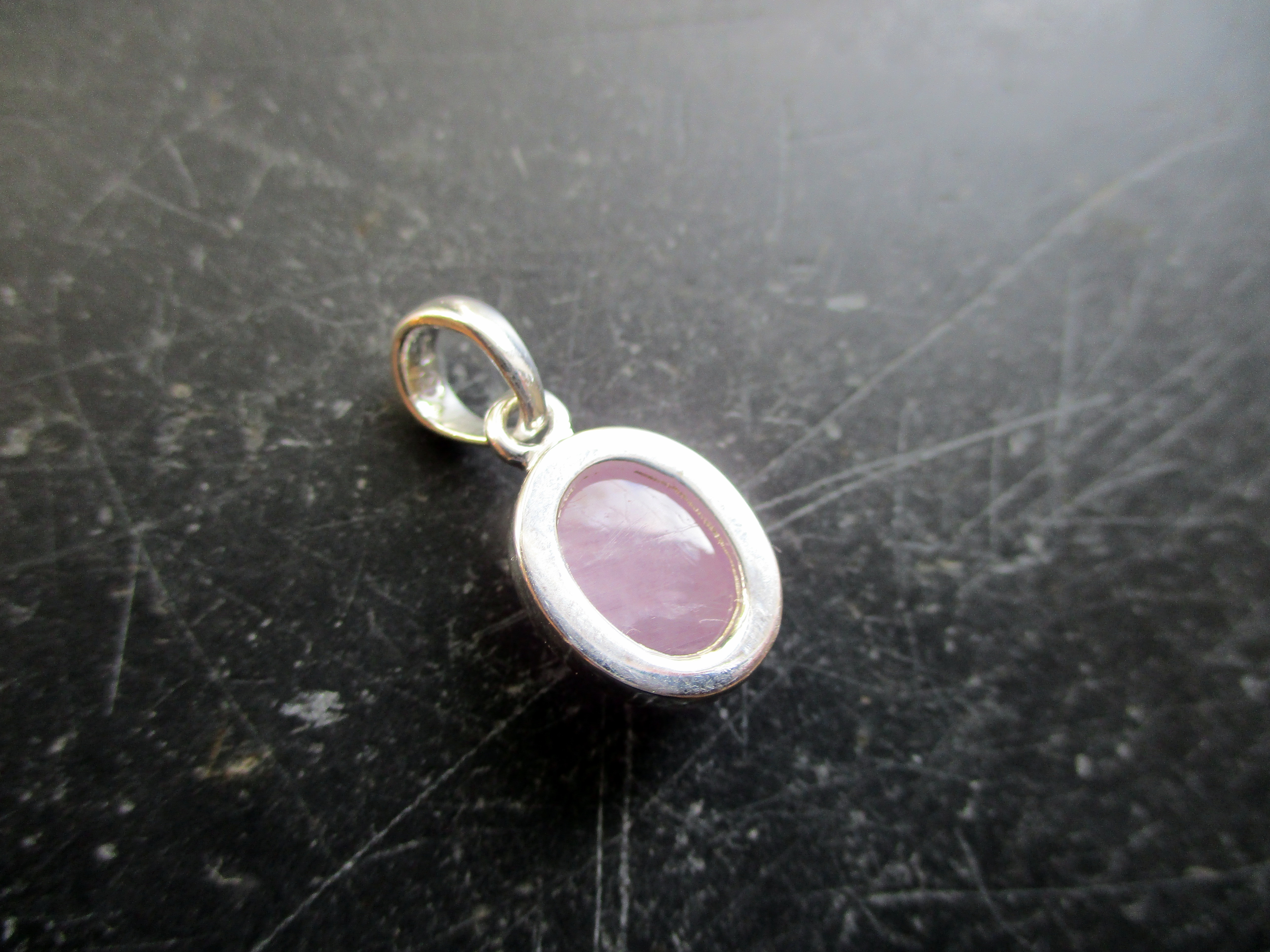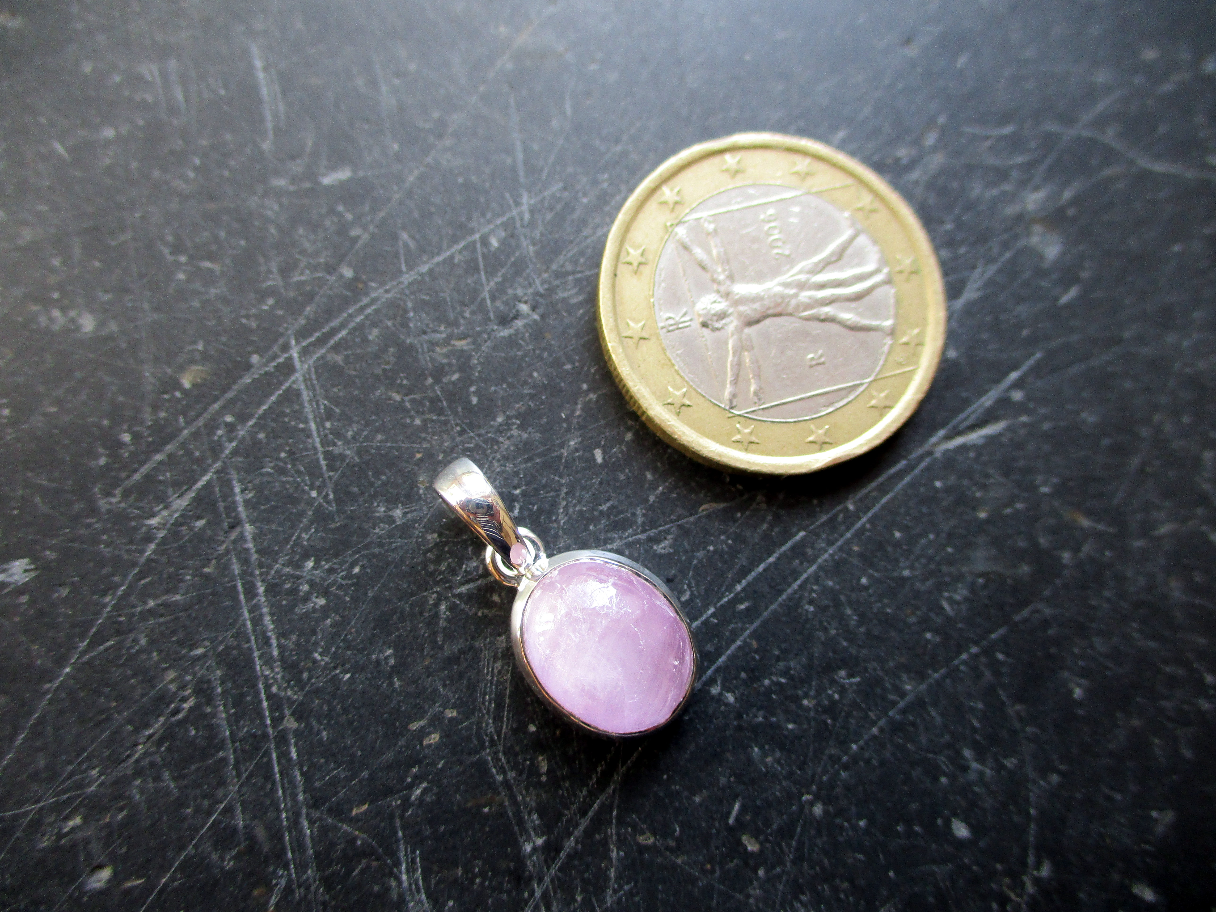 Dieser Anhänger ist rund, aus rosa Kunzit
