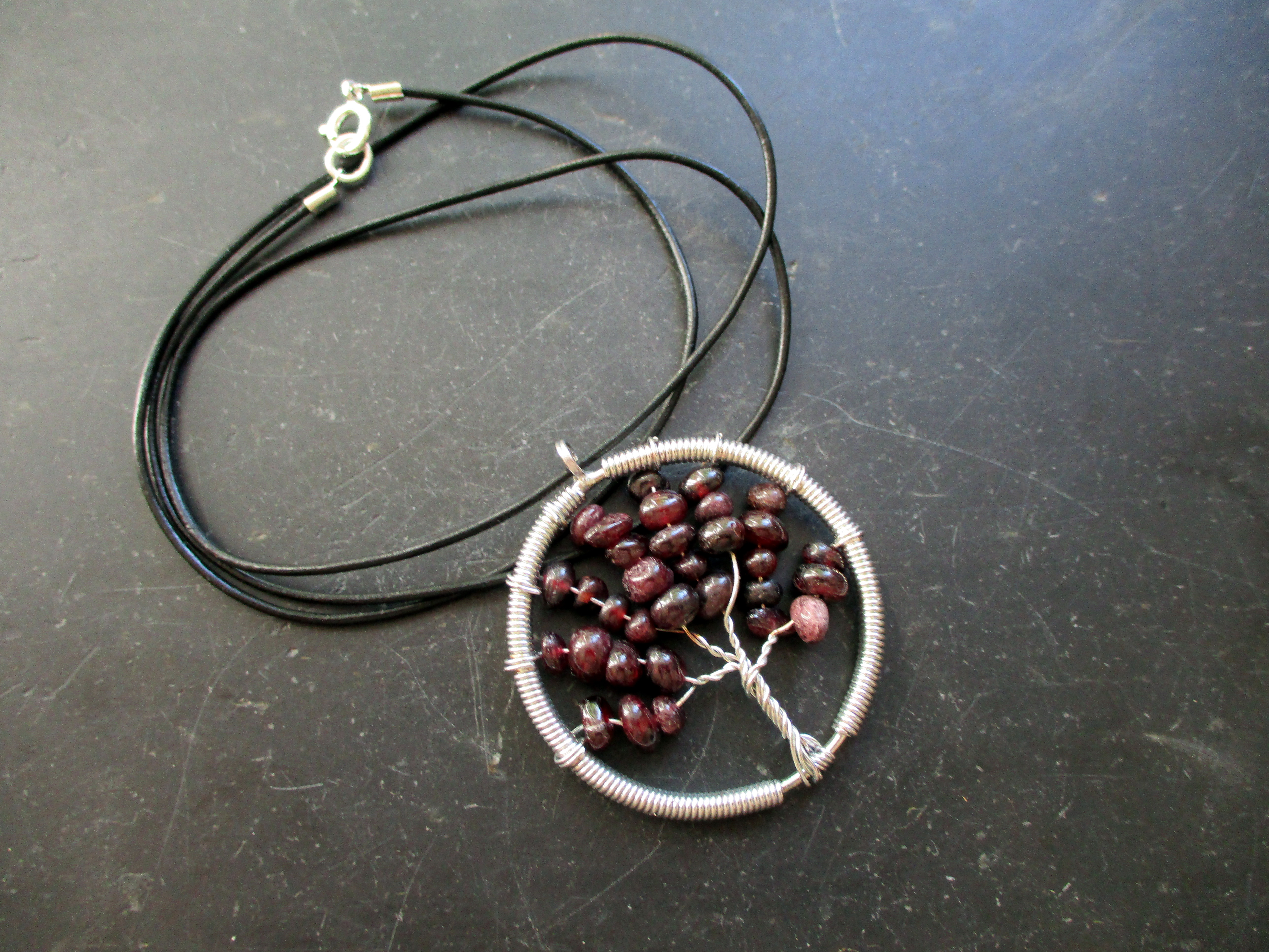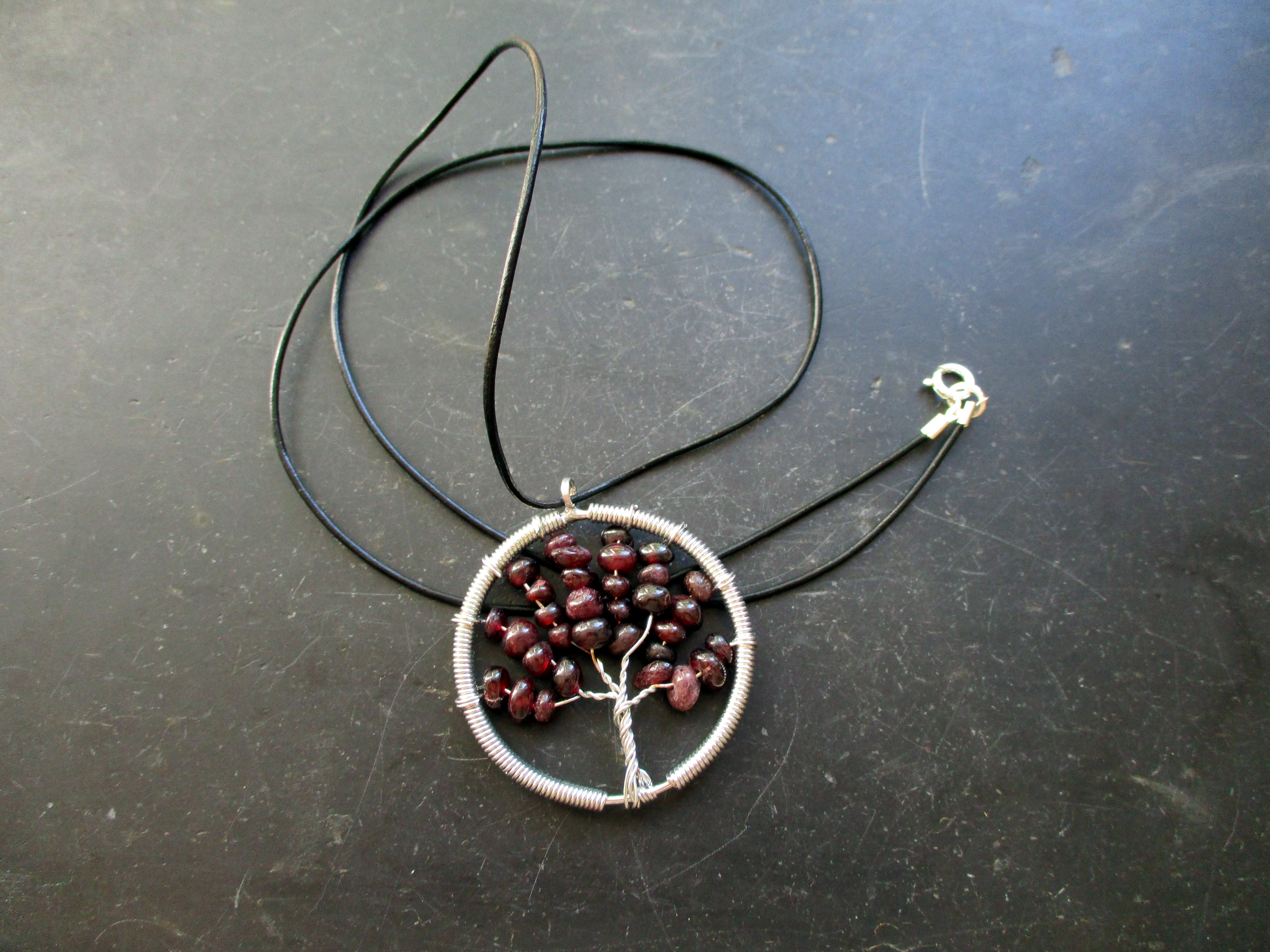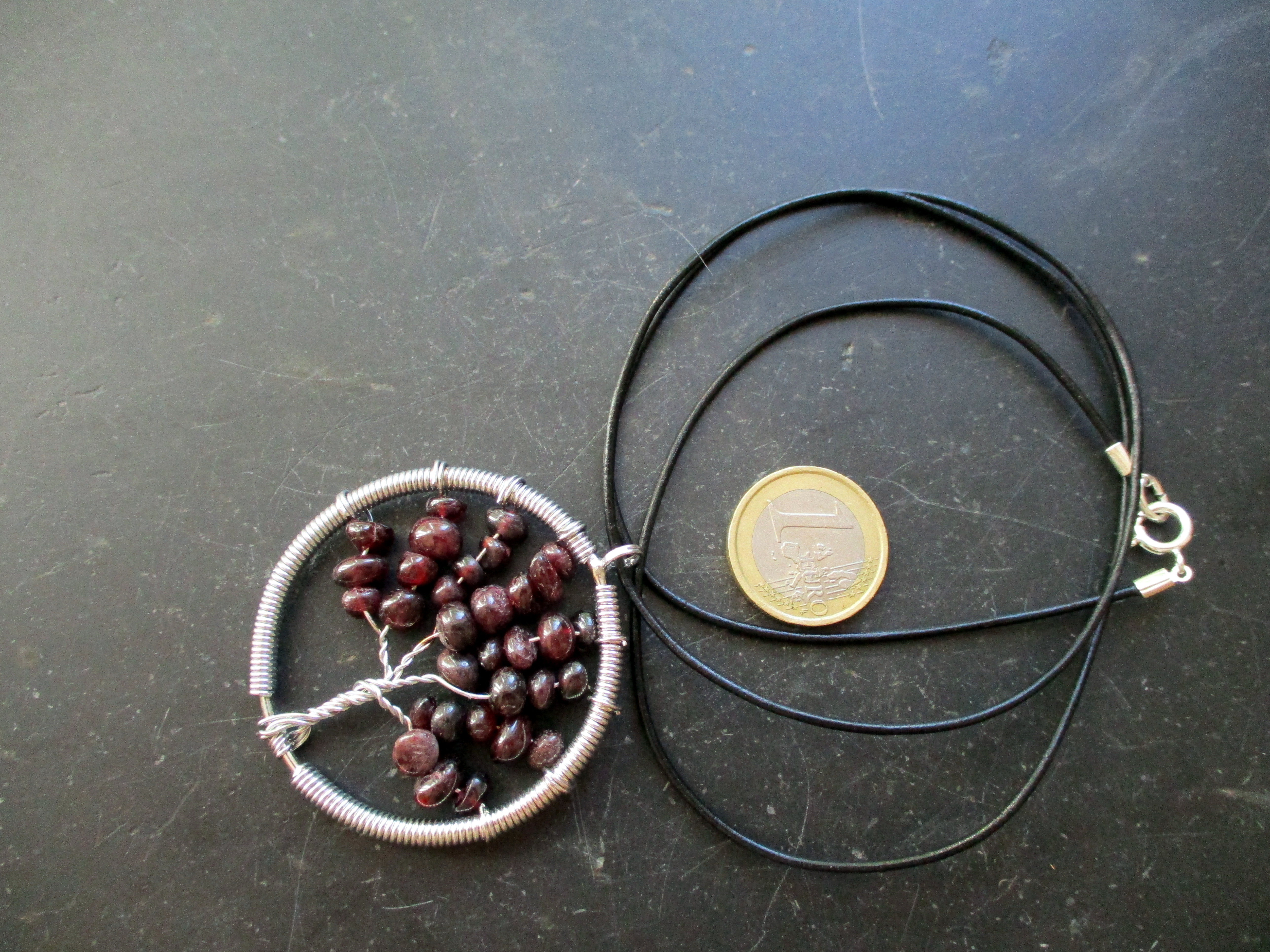 Kette, Anhänger, Baum des Lebens, Granat, Metall, Silber. Lederband, Schmuck