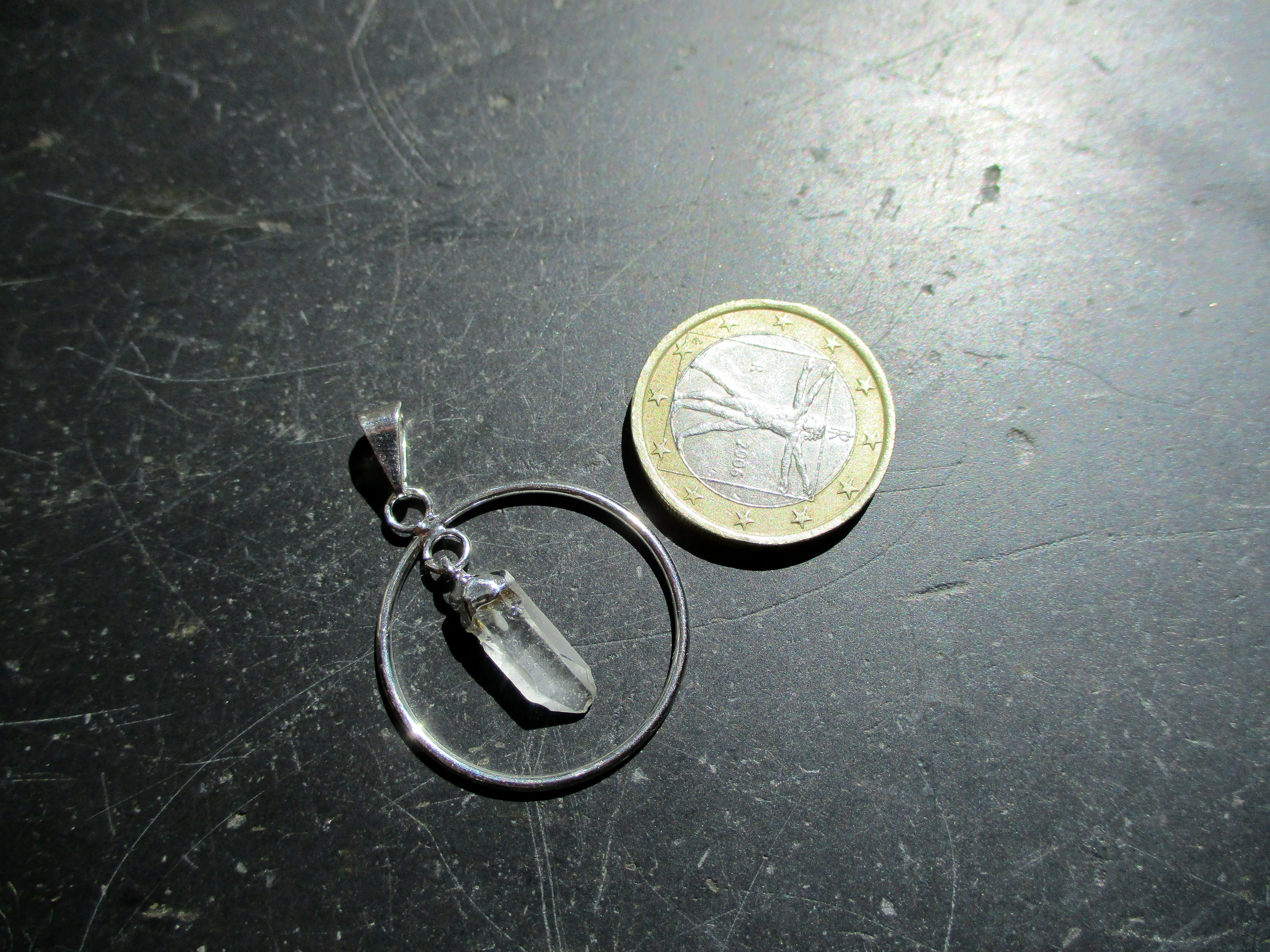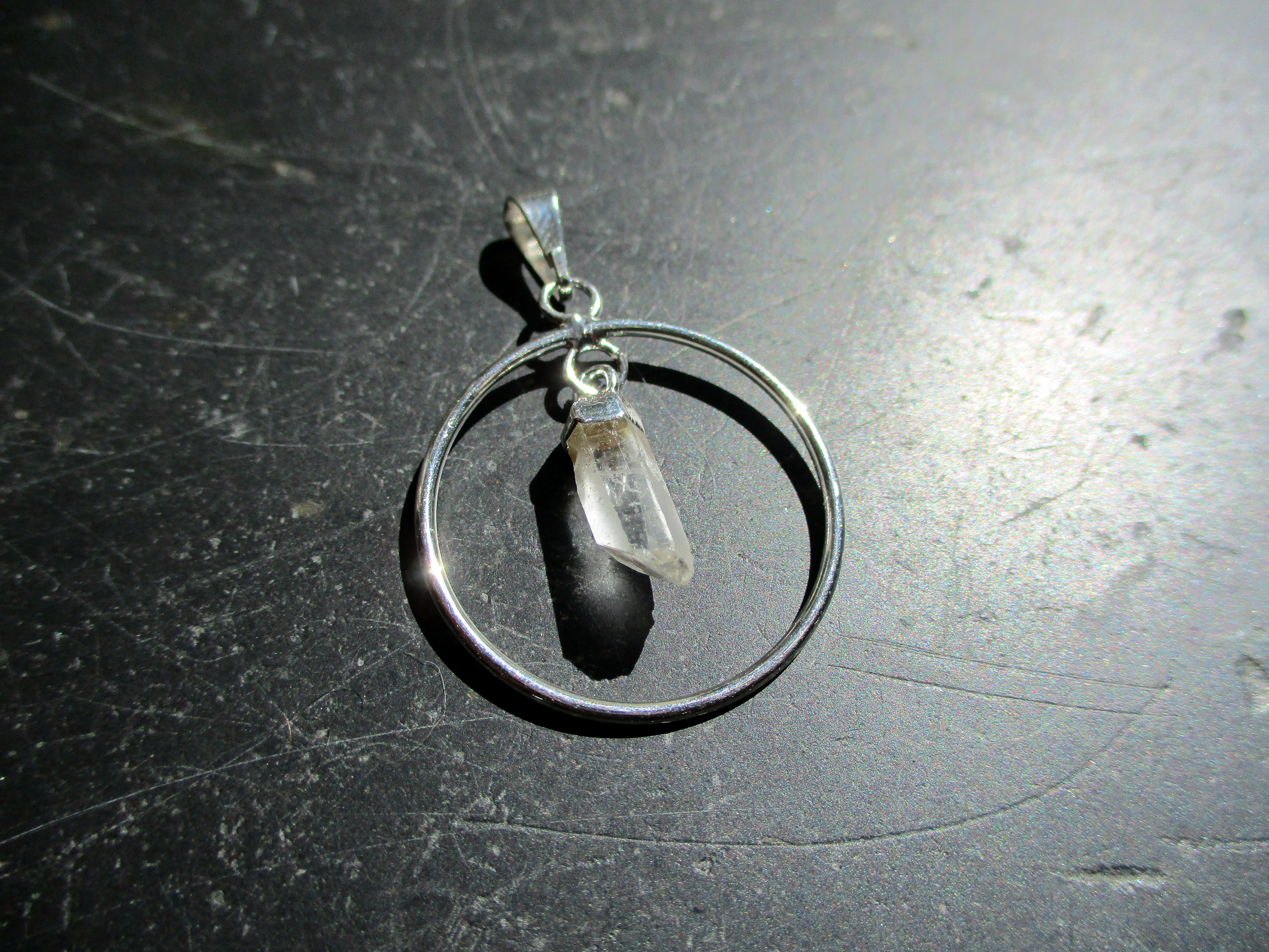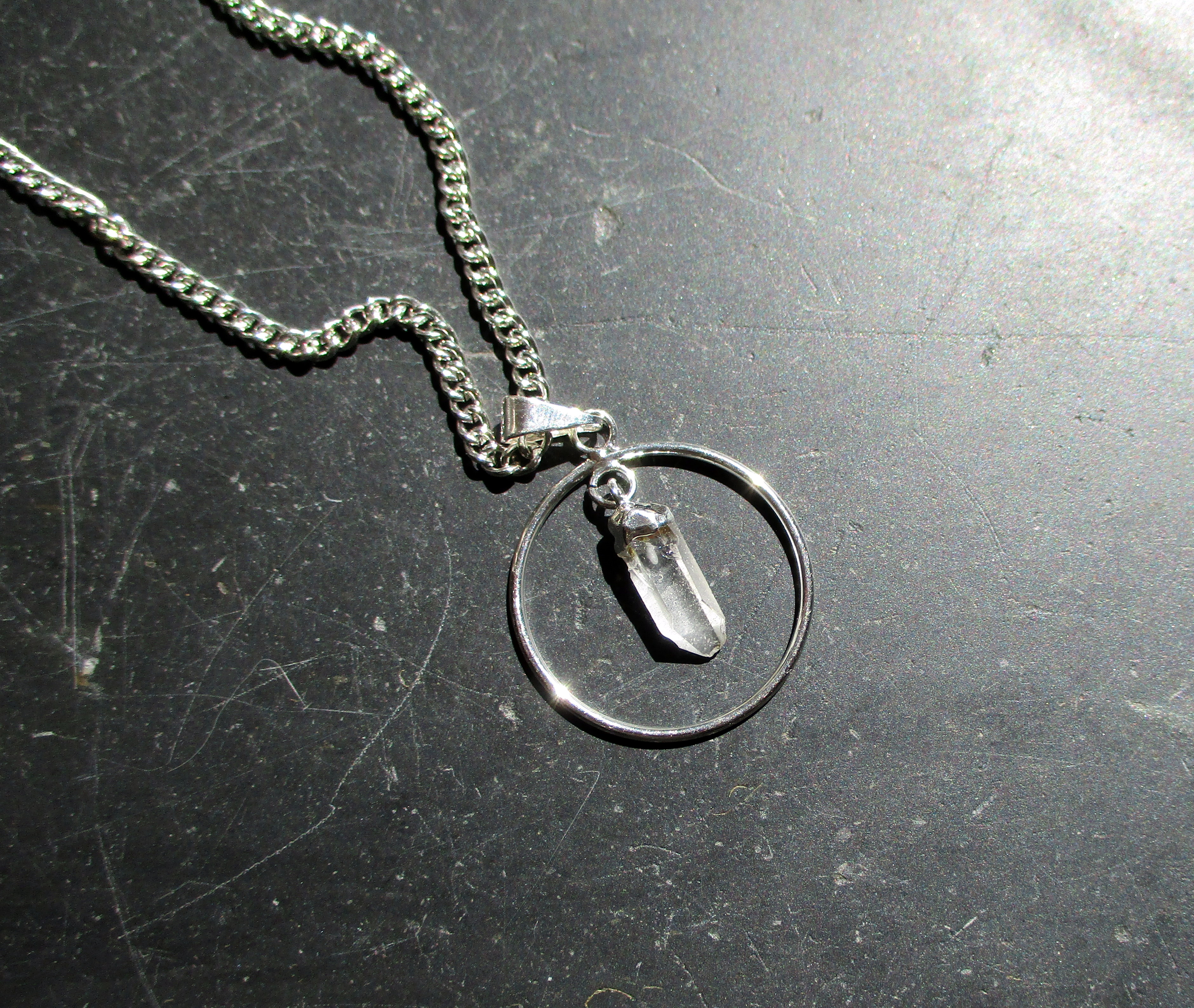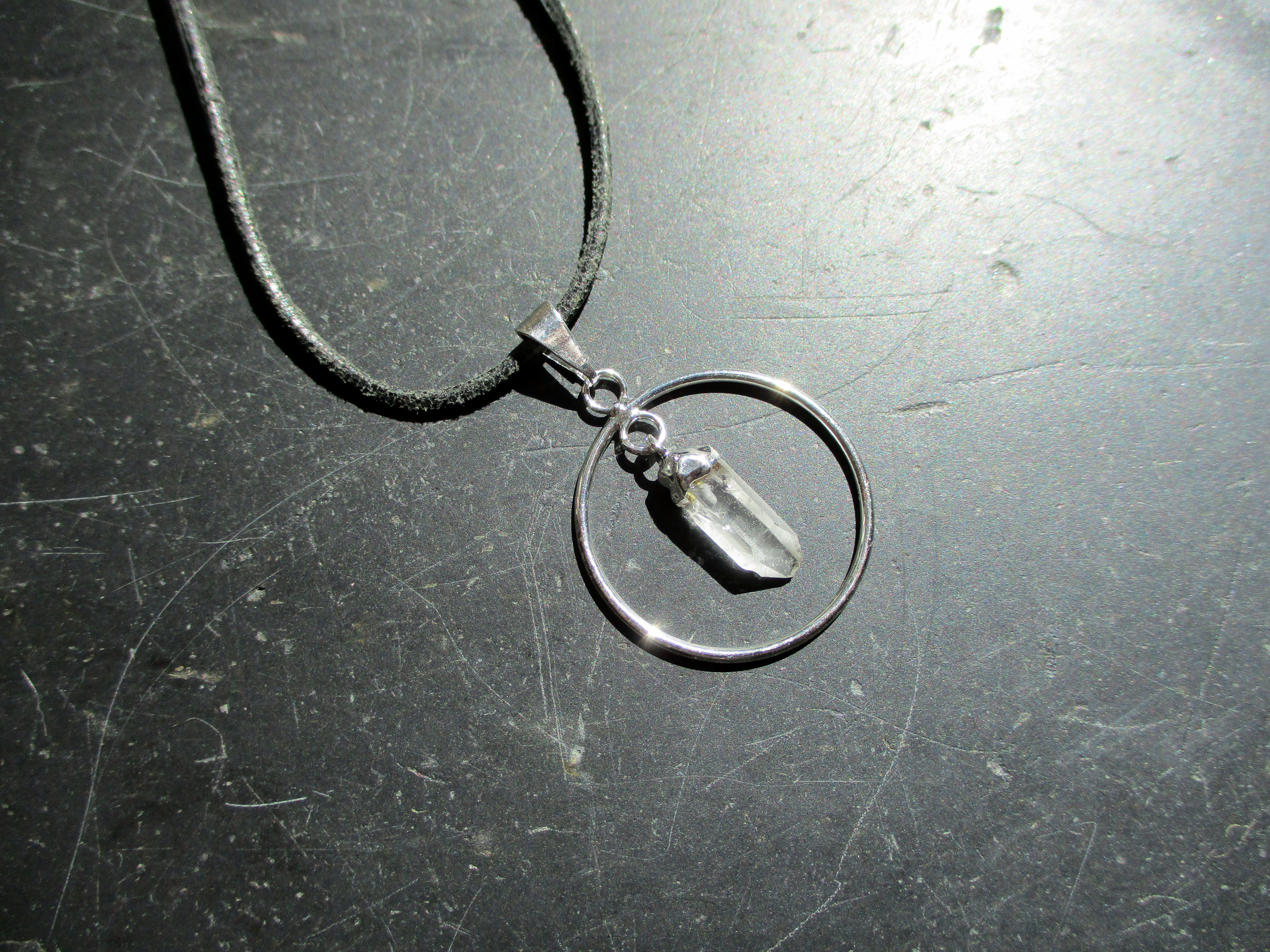 wie an ein Lederband. In dem Kreis befindet sich eine kleine Spitze aus Bergkristall.