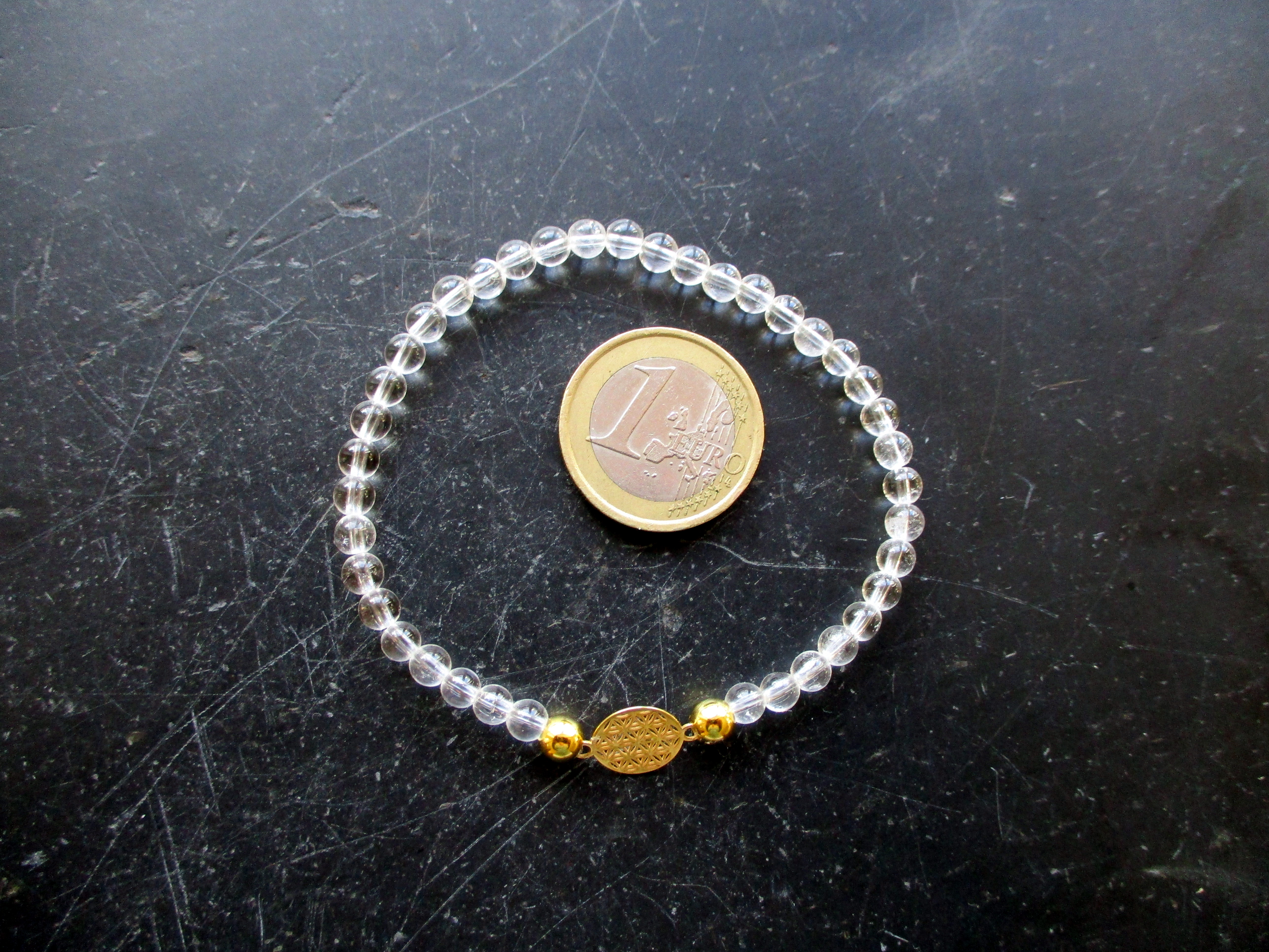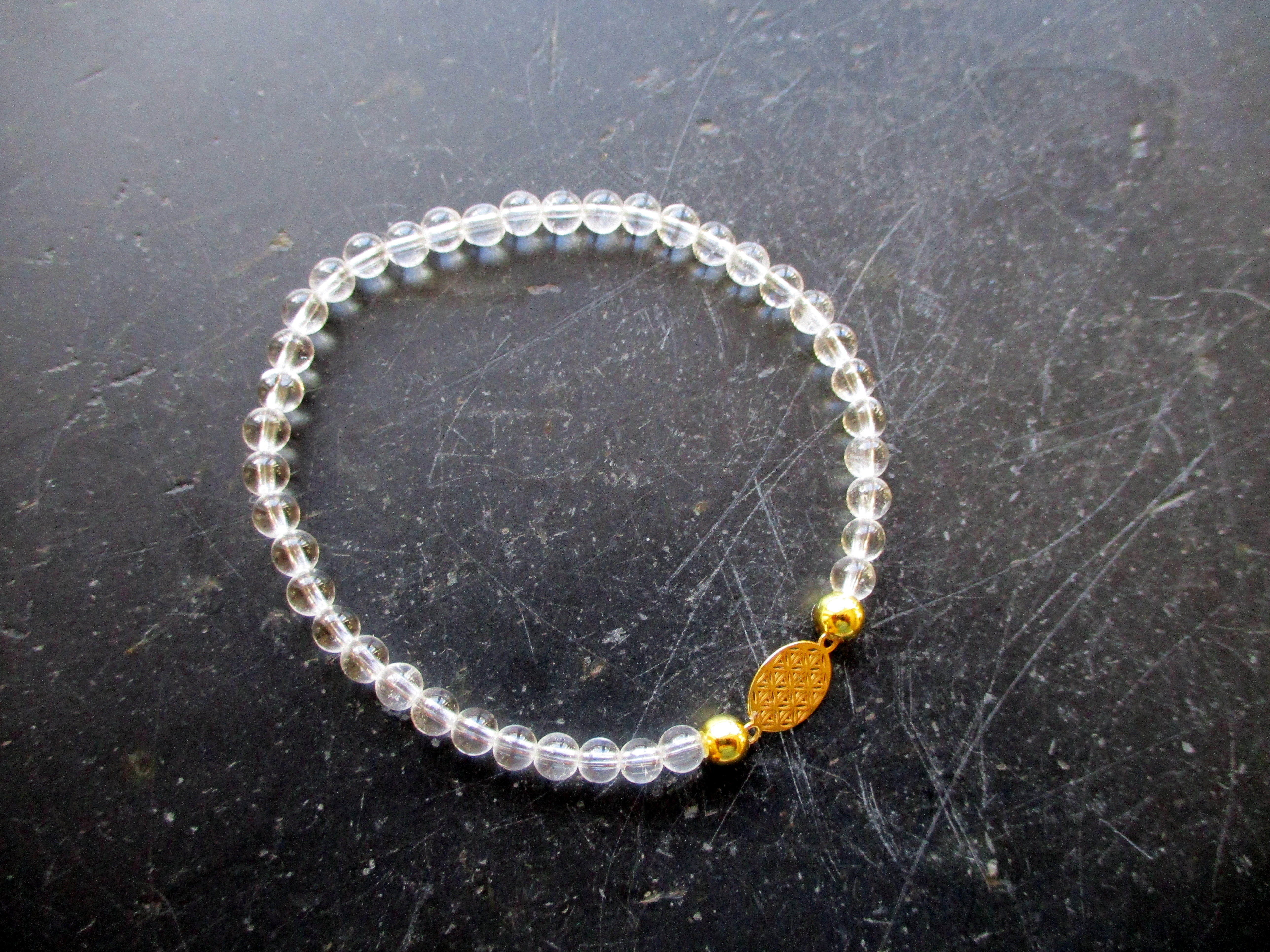 Armband, Symbolarmband, Bergkristall, klar, weiß, Blume des Lebens, Silber, vergoldet