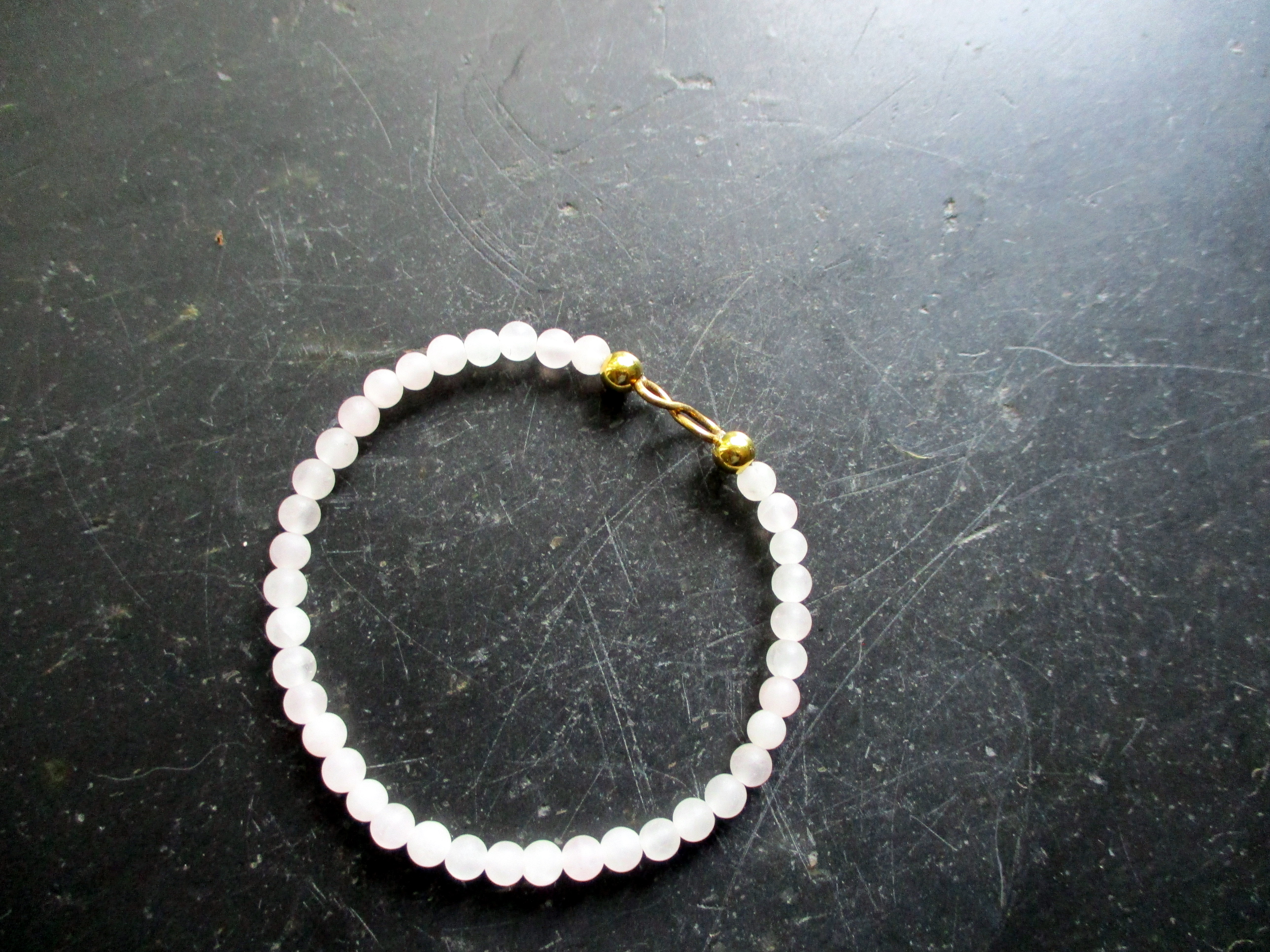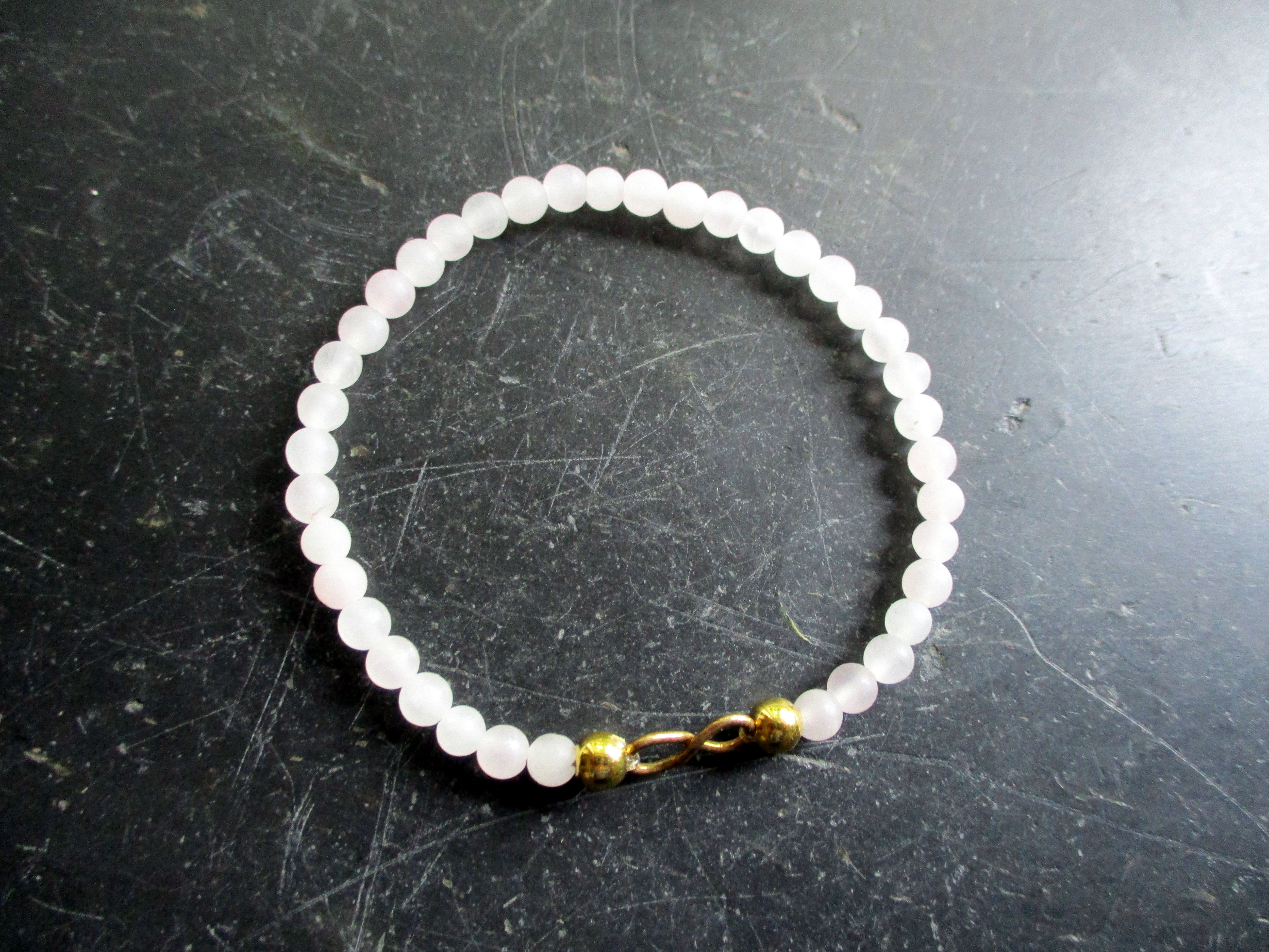aus Rosenquarz. Eingearbeitet in das Armband ist die