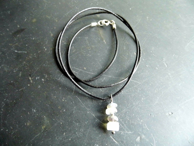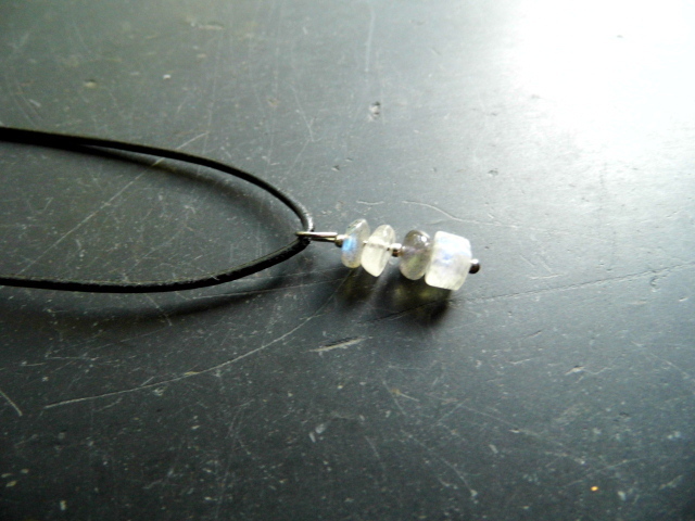 Mondstein und Labradorit hängt an einem Lederband.