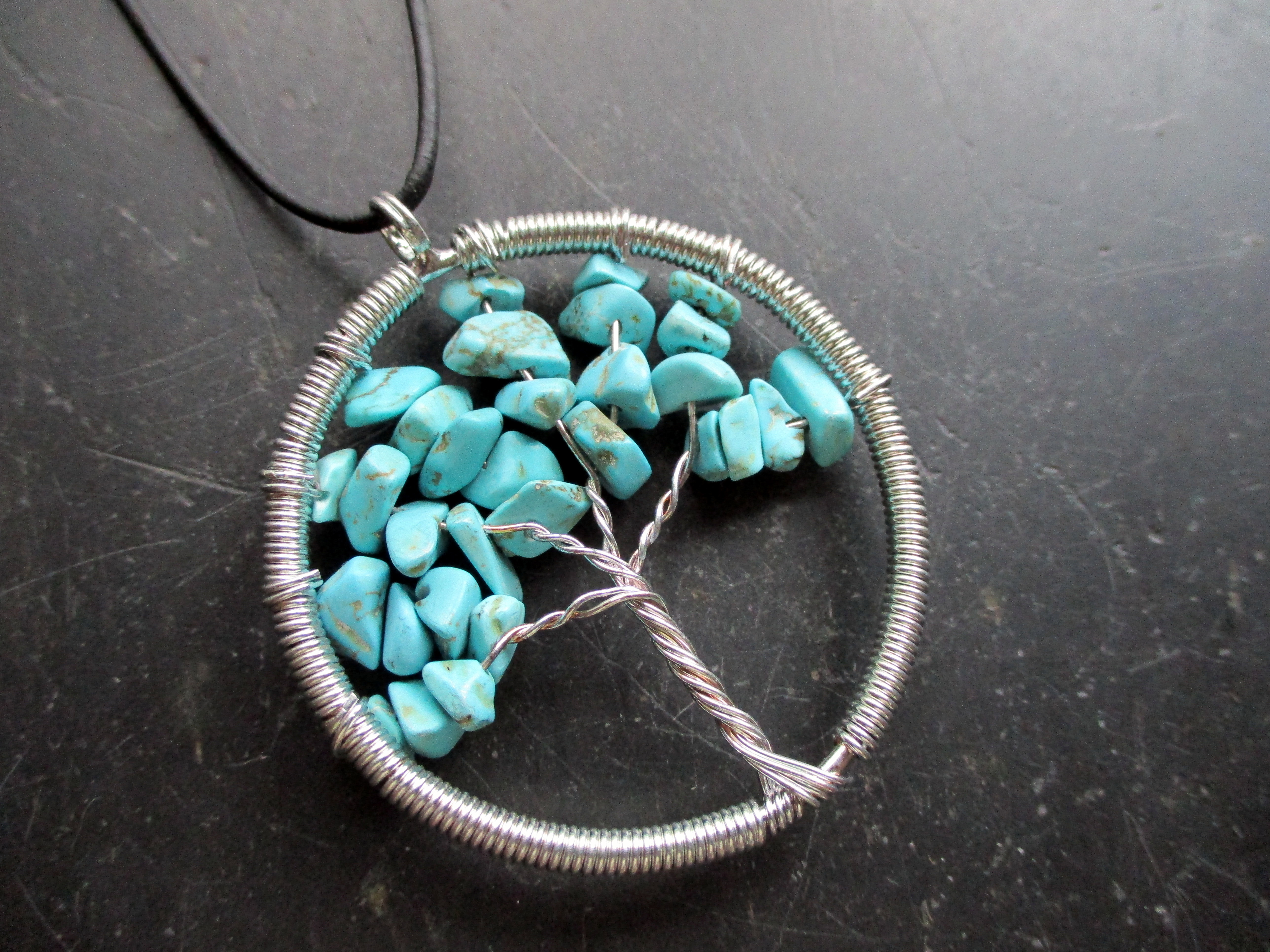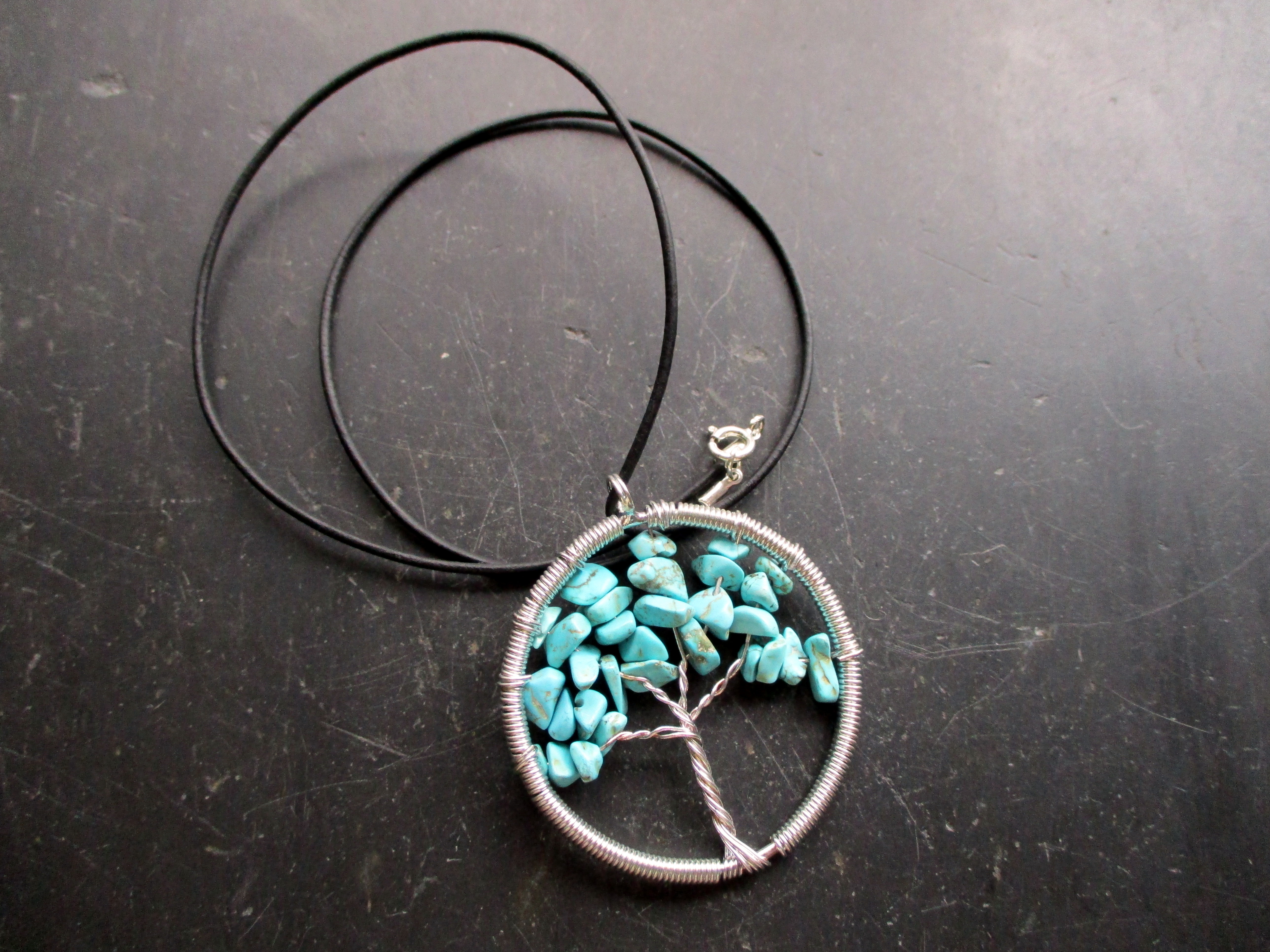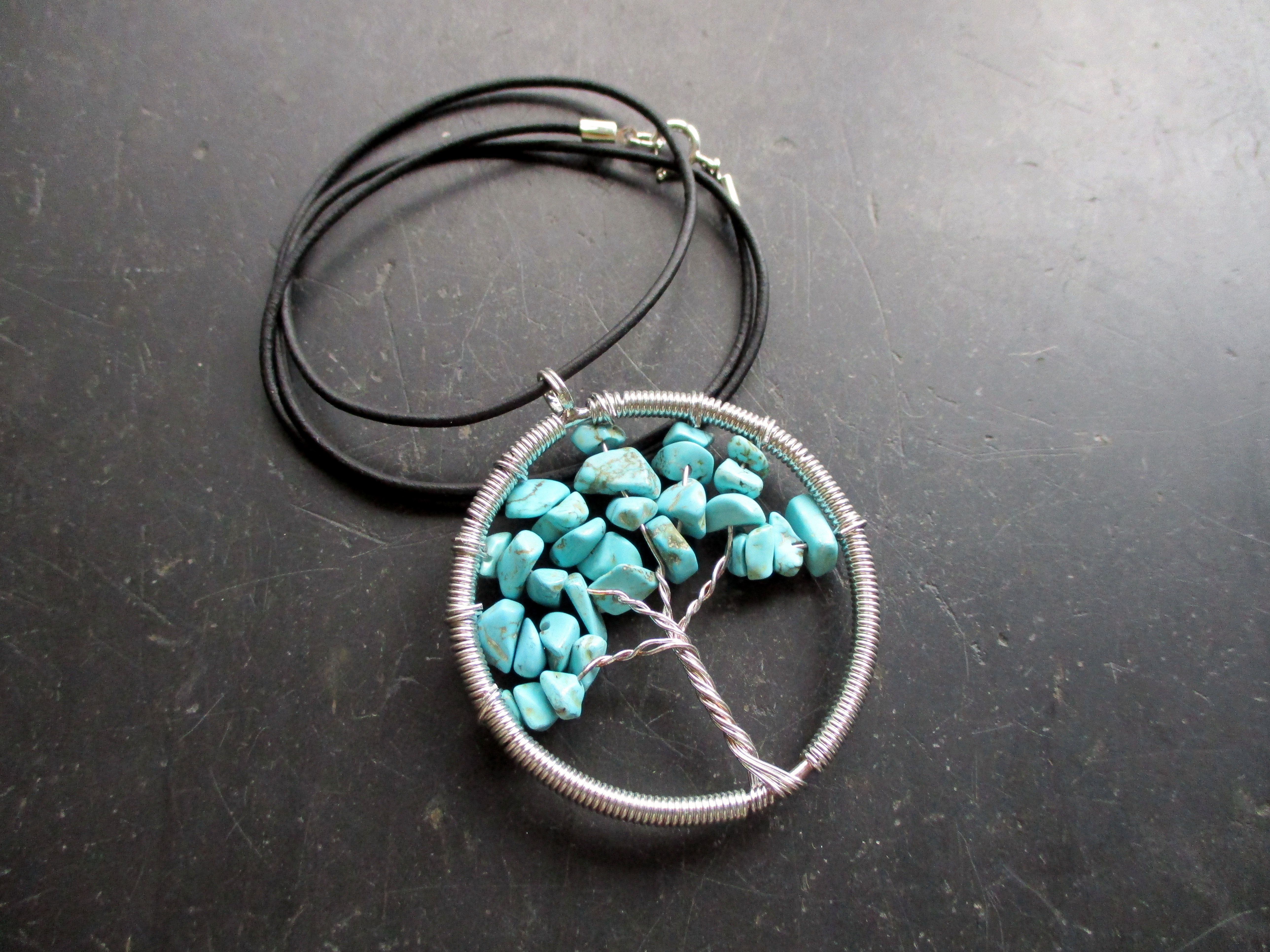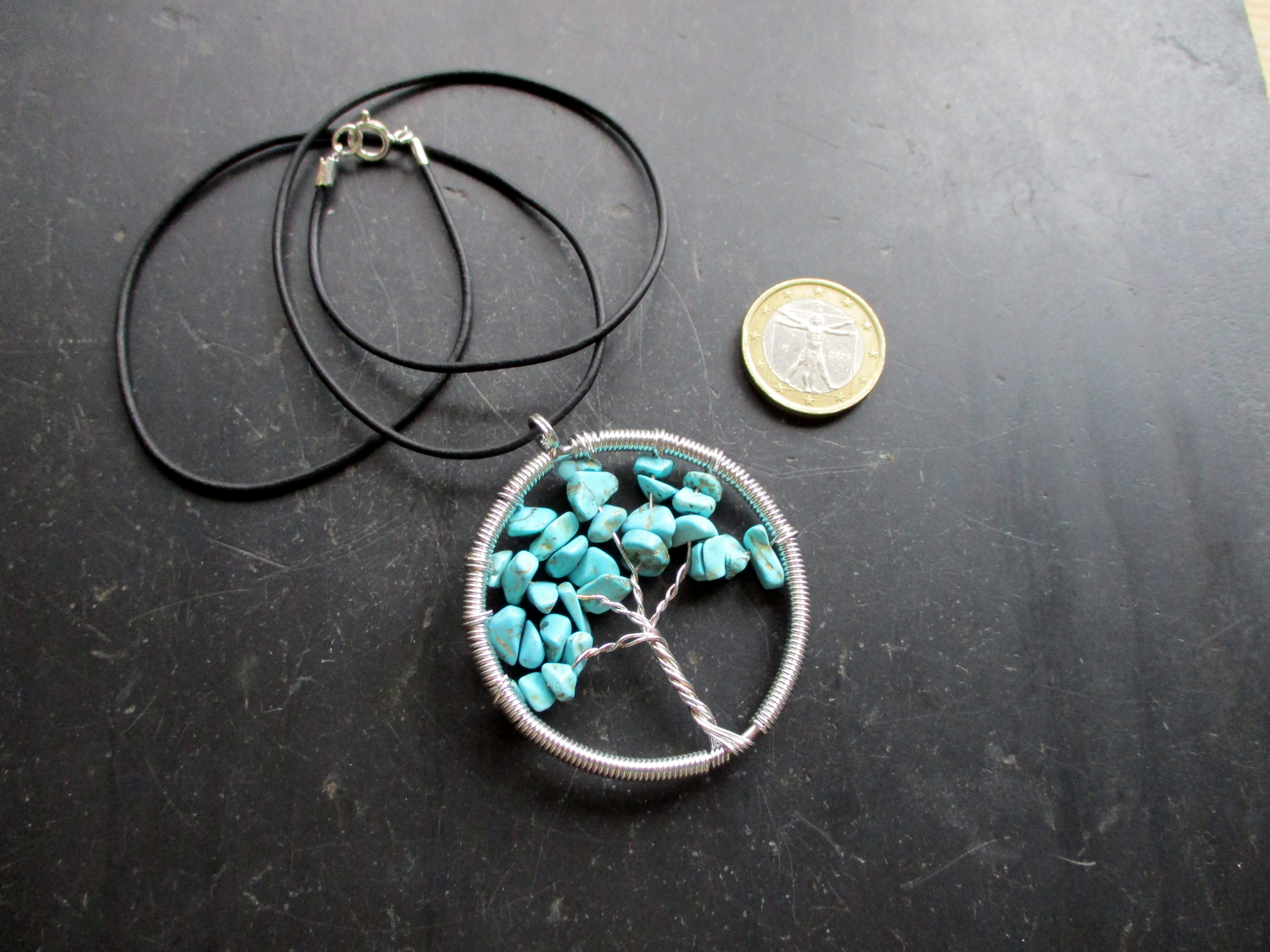 Kette, Lederband, Anhänger, Baum des Lebens, Metall, versilbert, Türkis, blau