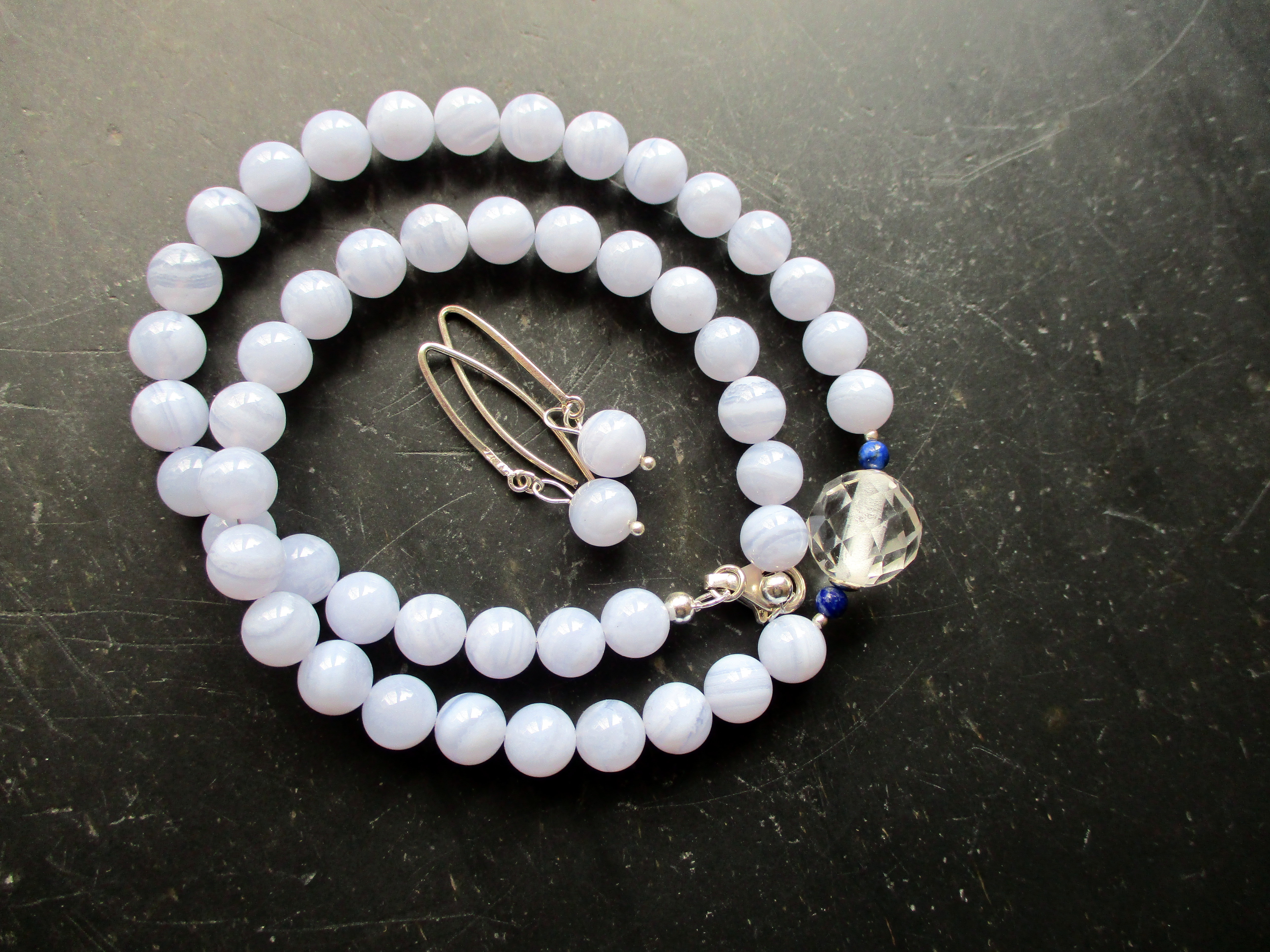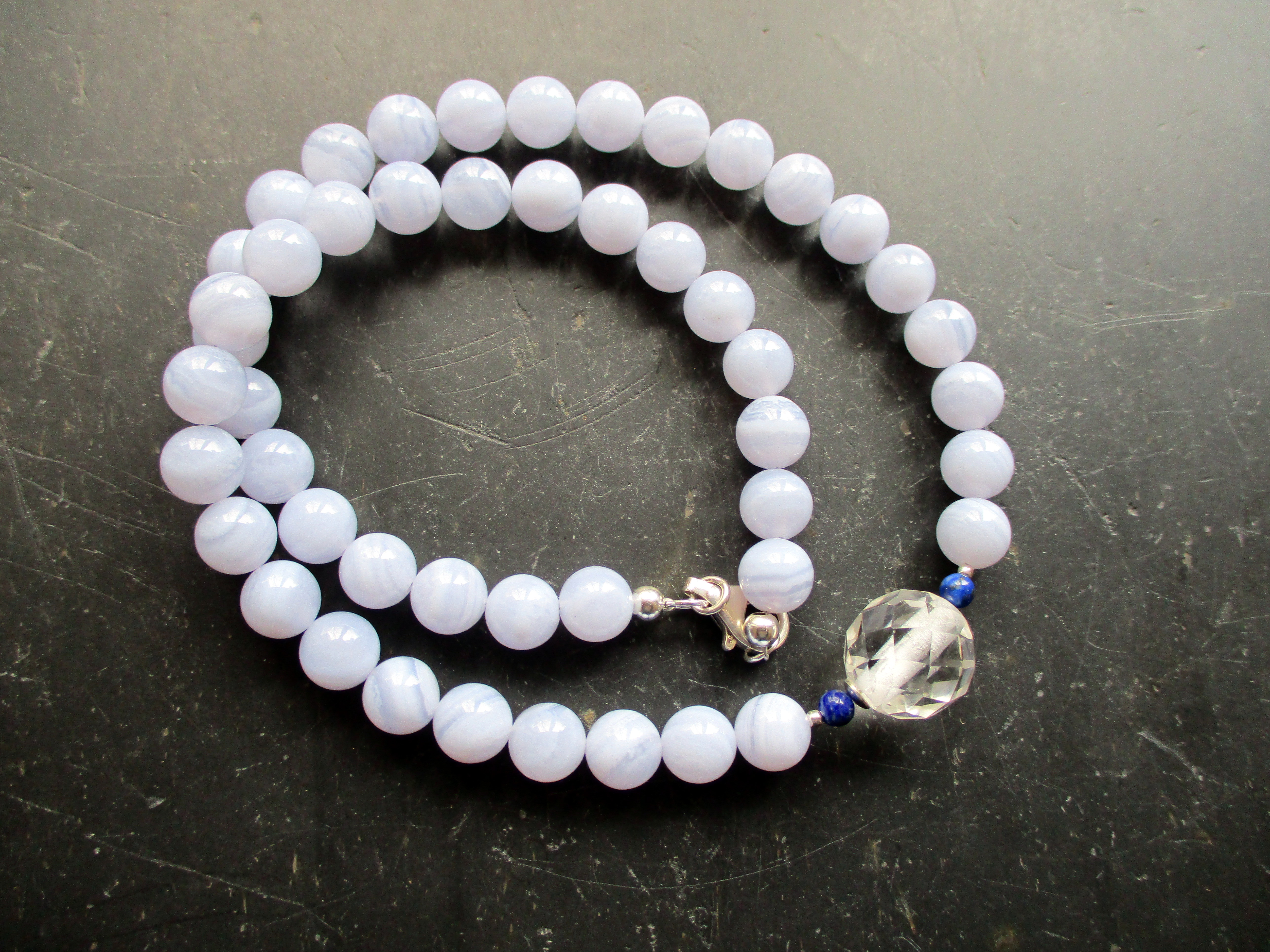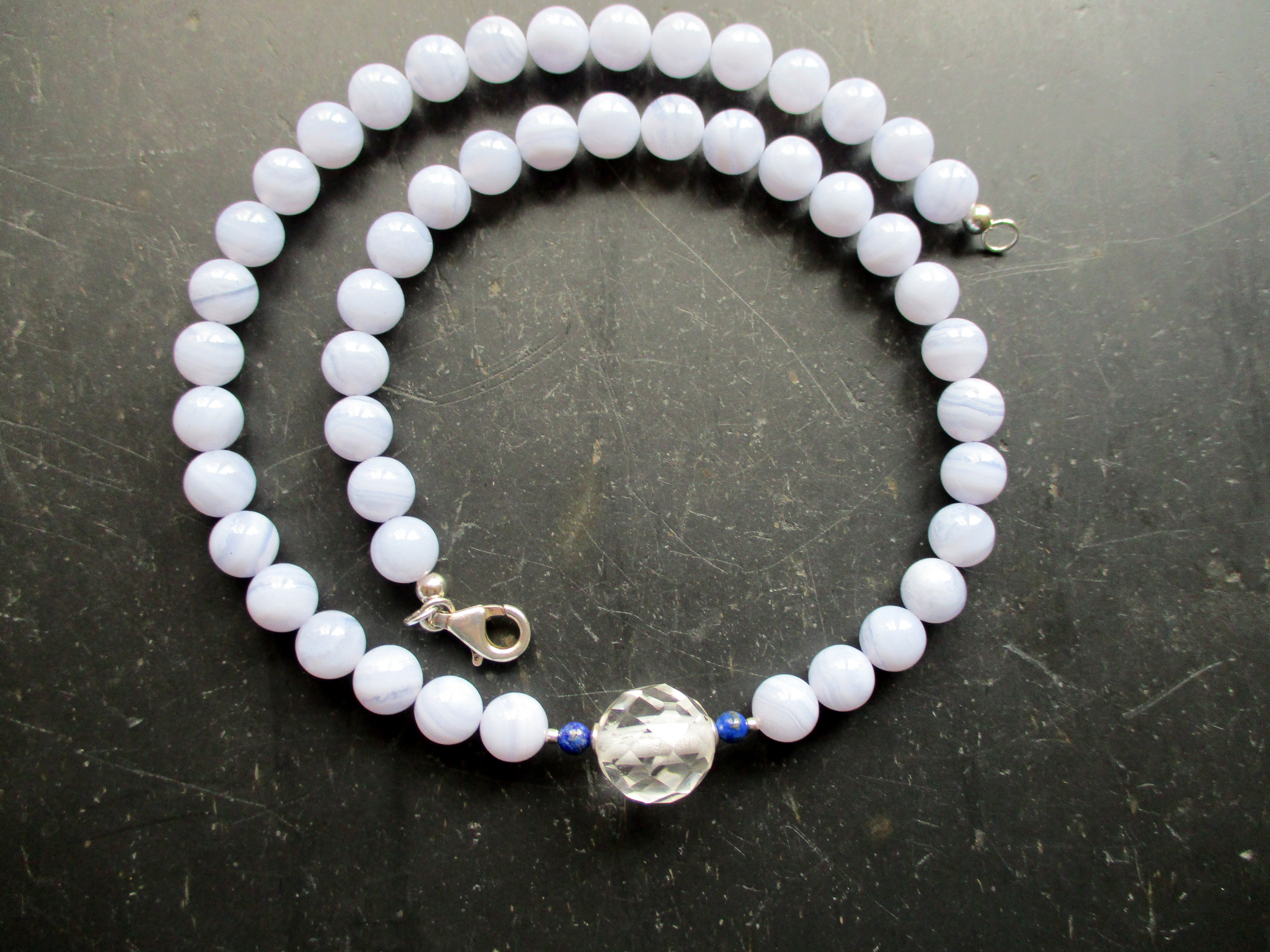 Kette, Edelsteinkette, Chalcedon, hellblau, Perlen, Sterlingsilber, Schmuck, Frauen