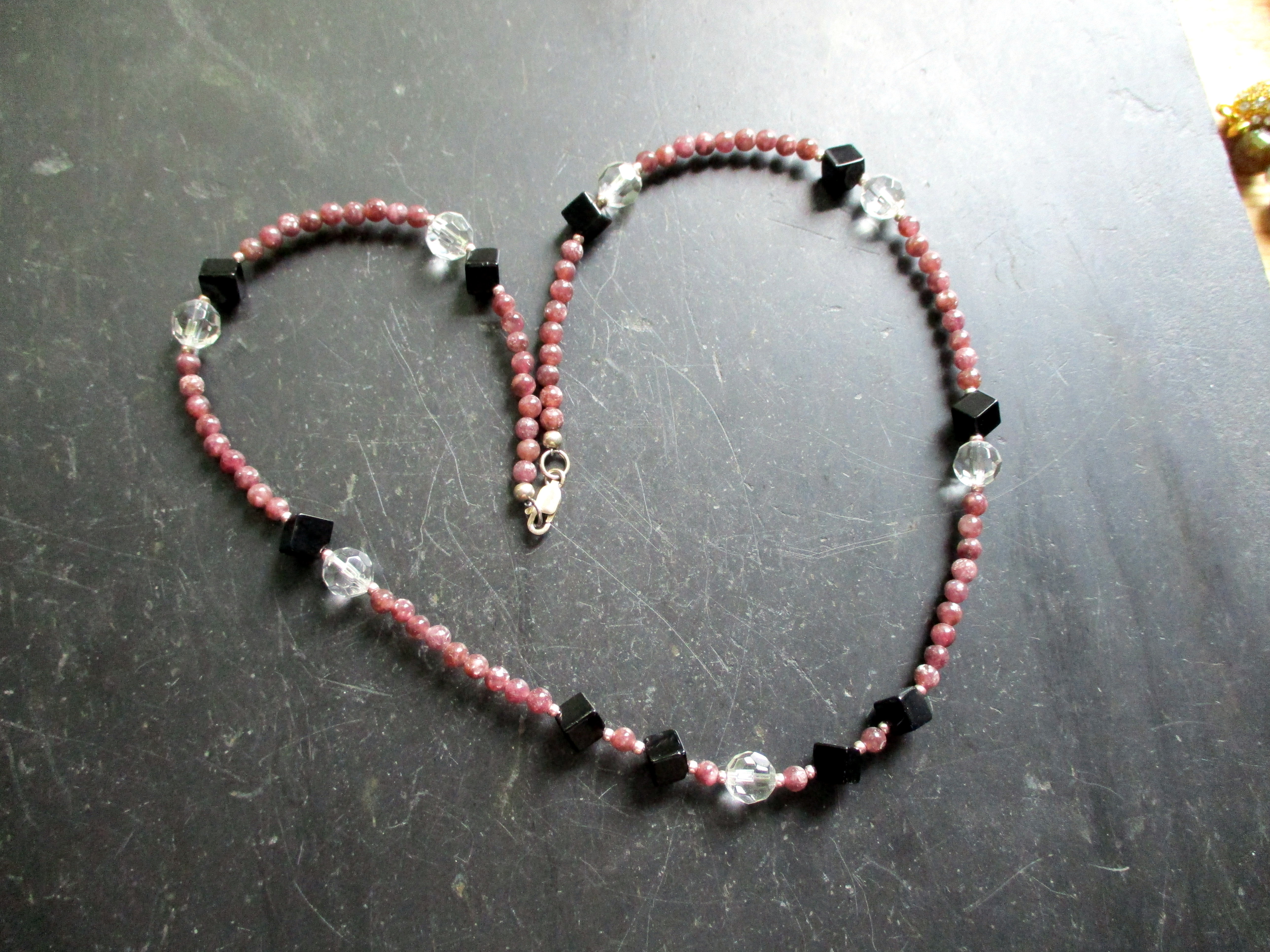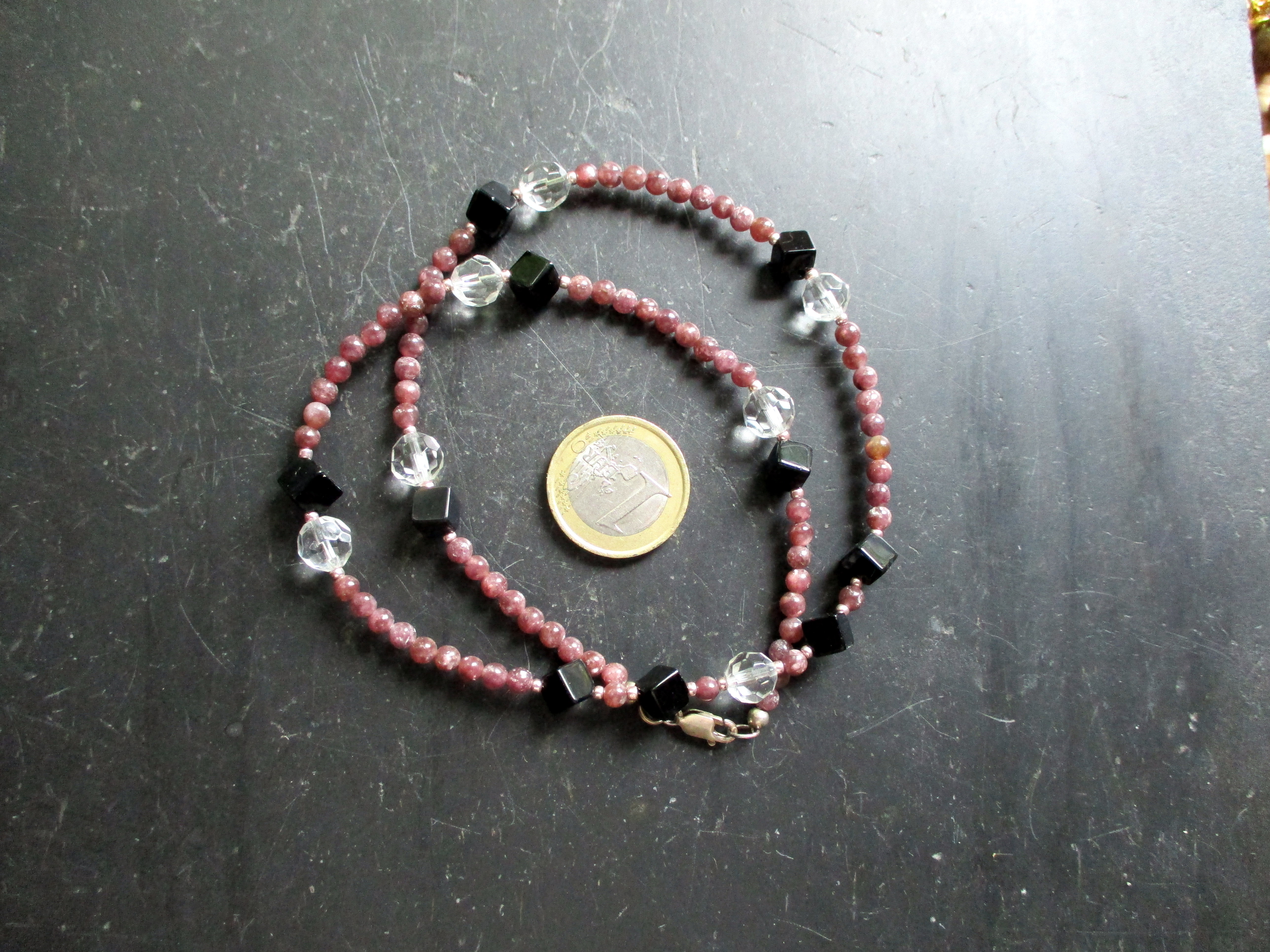 Dunkelrot sind die Perlen von dieser Kette aus Rhodonit.