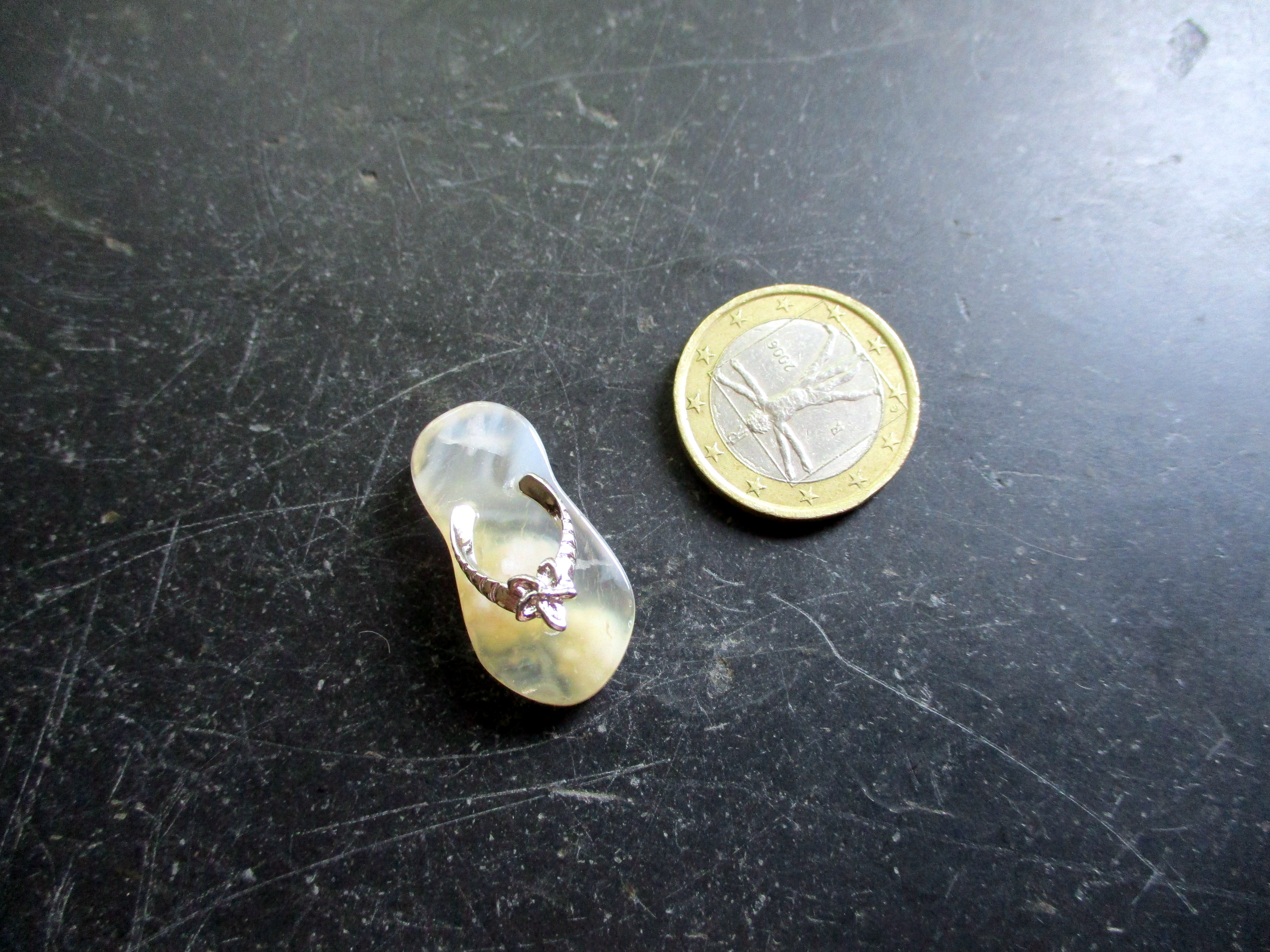 Ein kleiner Schuh, Flip Flop, der an einer Silberkette hängt.