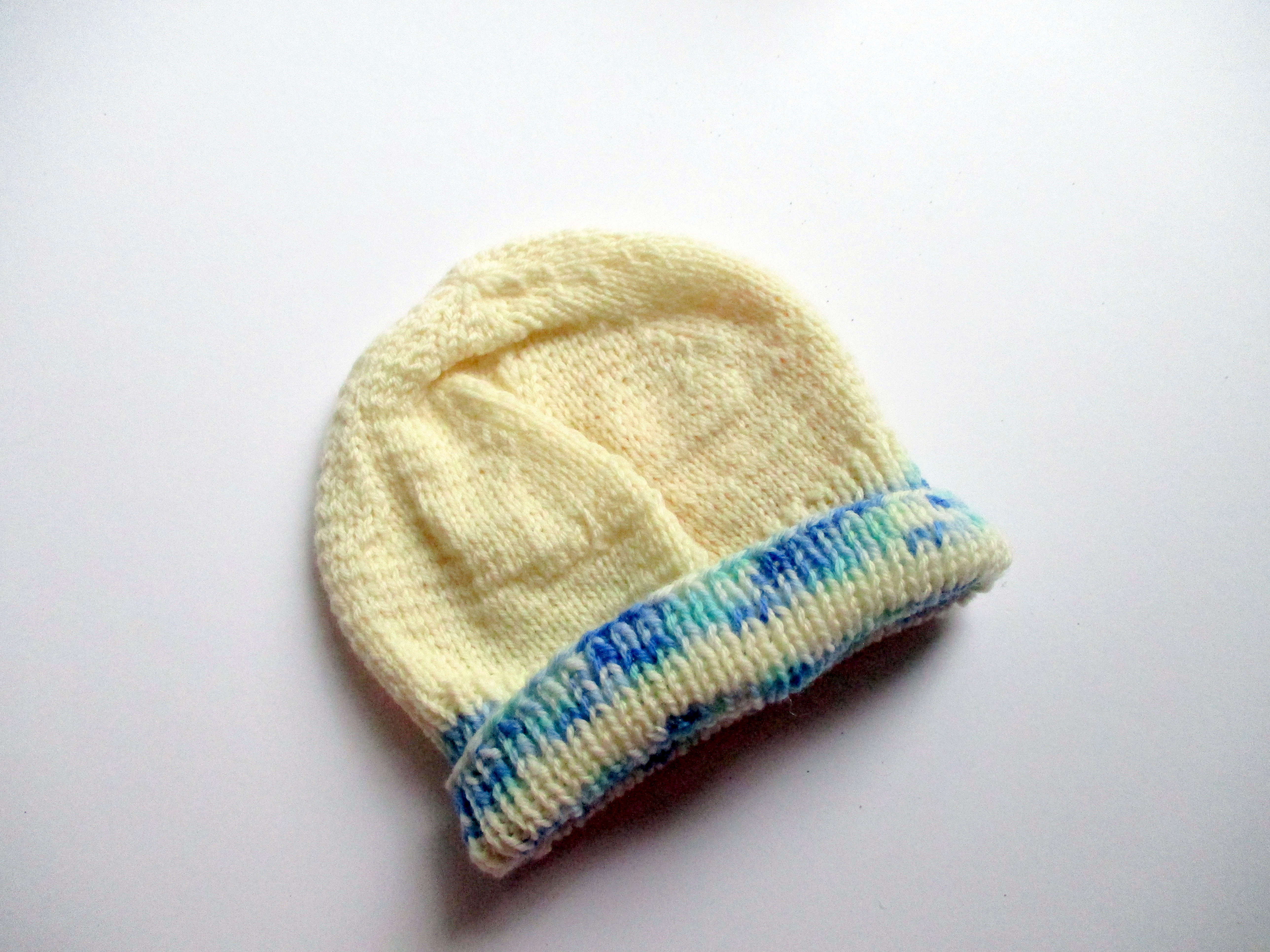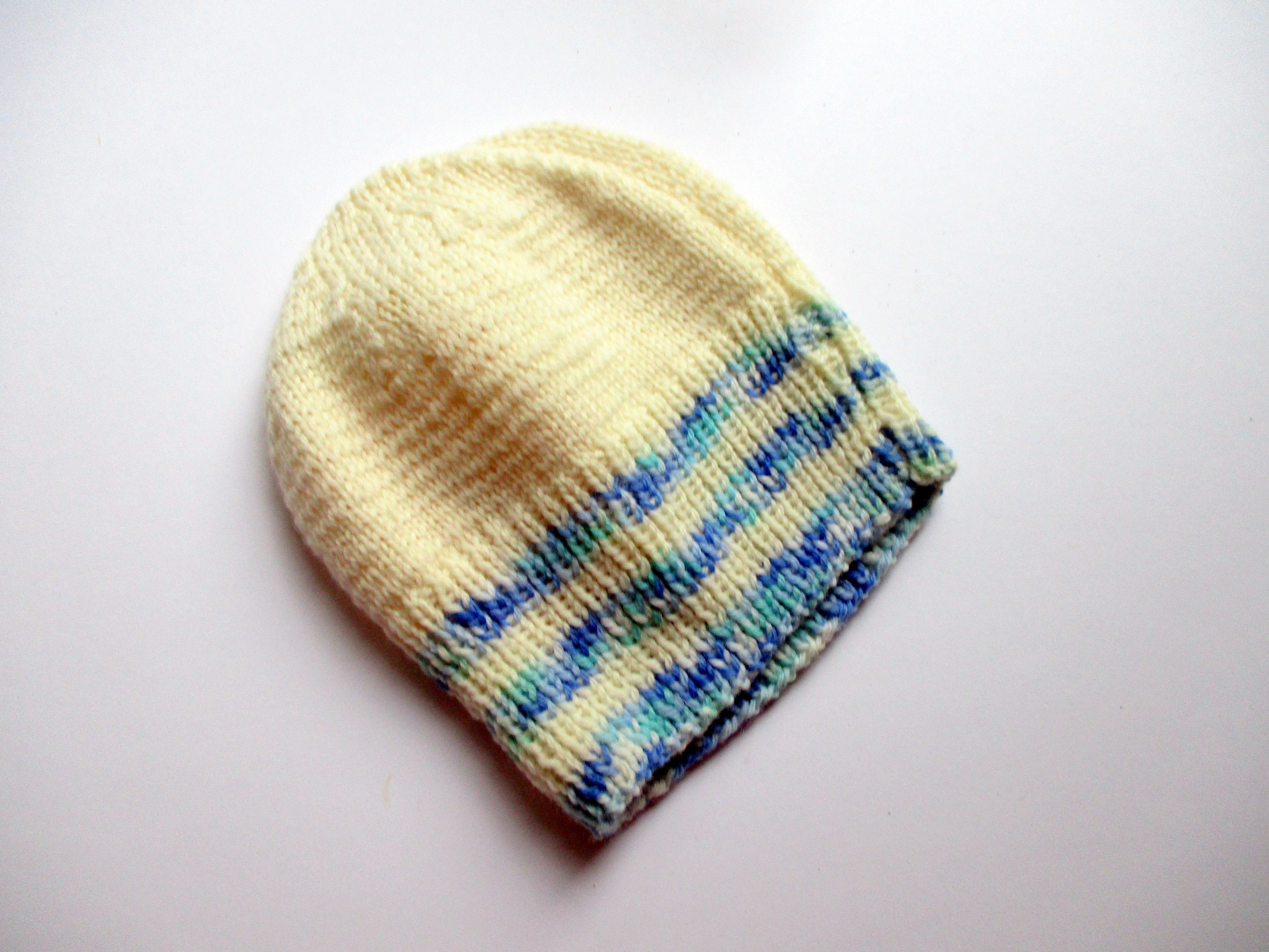 Baby, Mütze, Haube, weiß mit blauen Streifen, Wolle, gestrickt