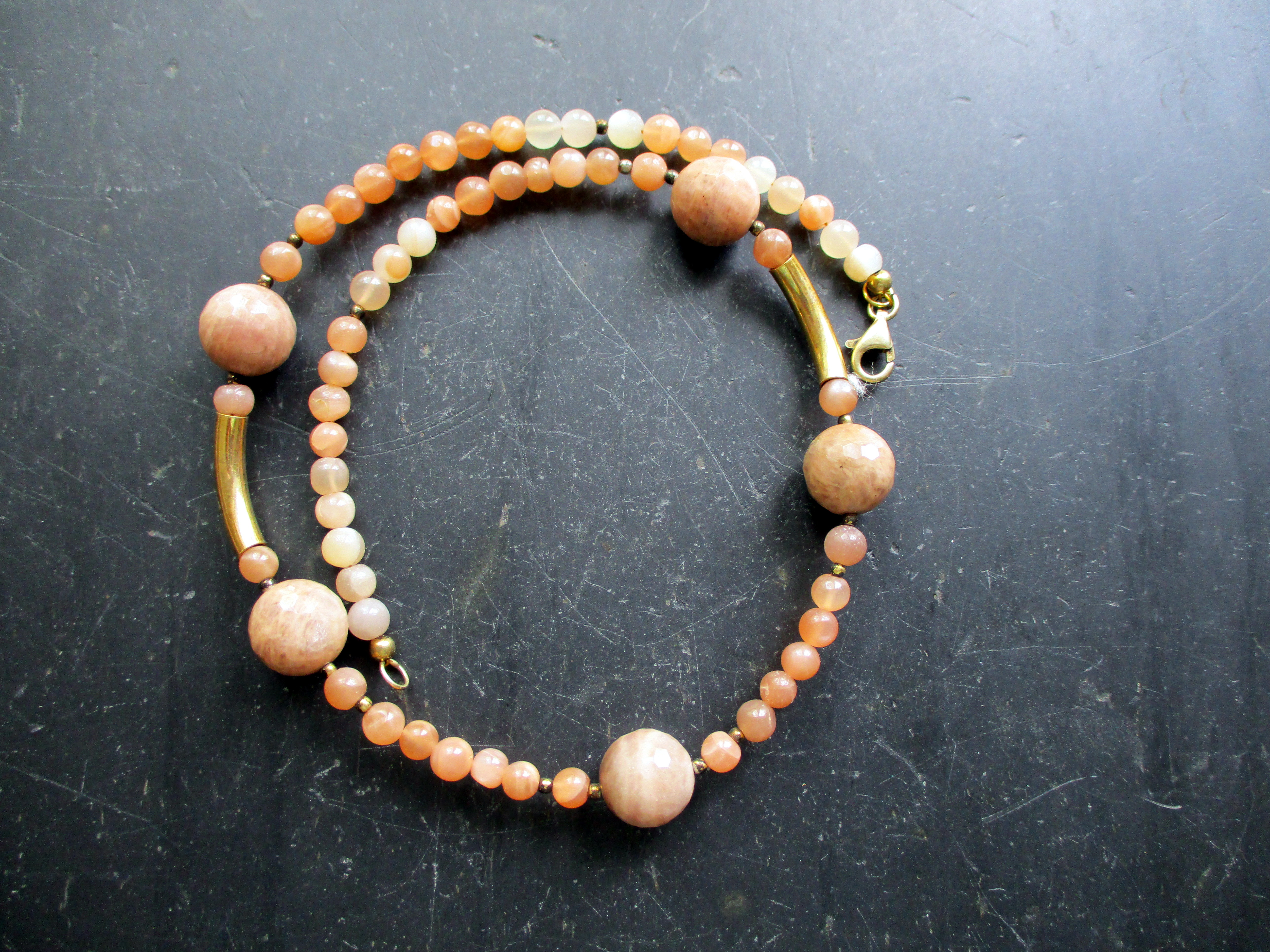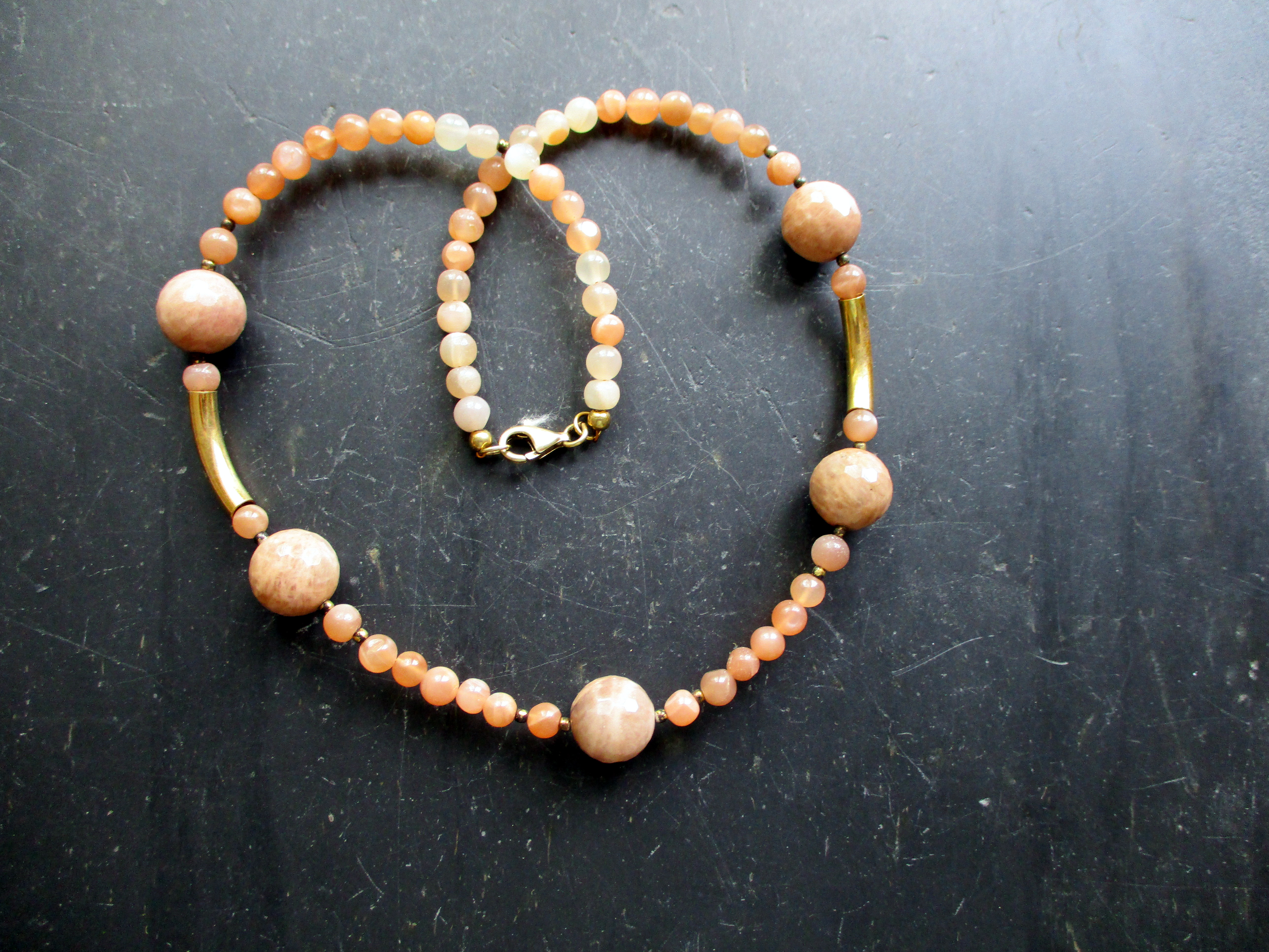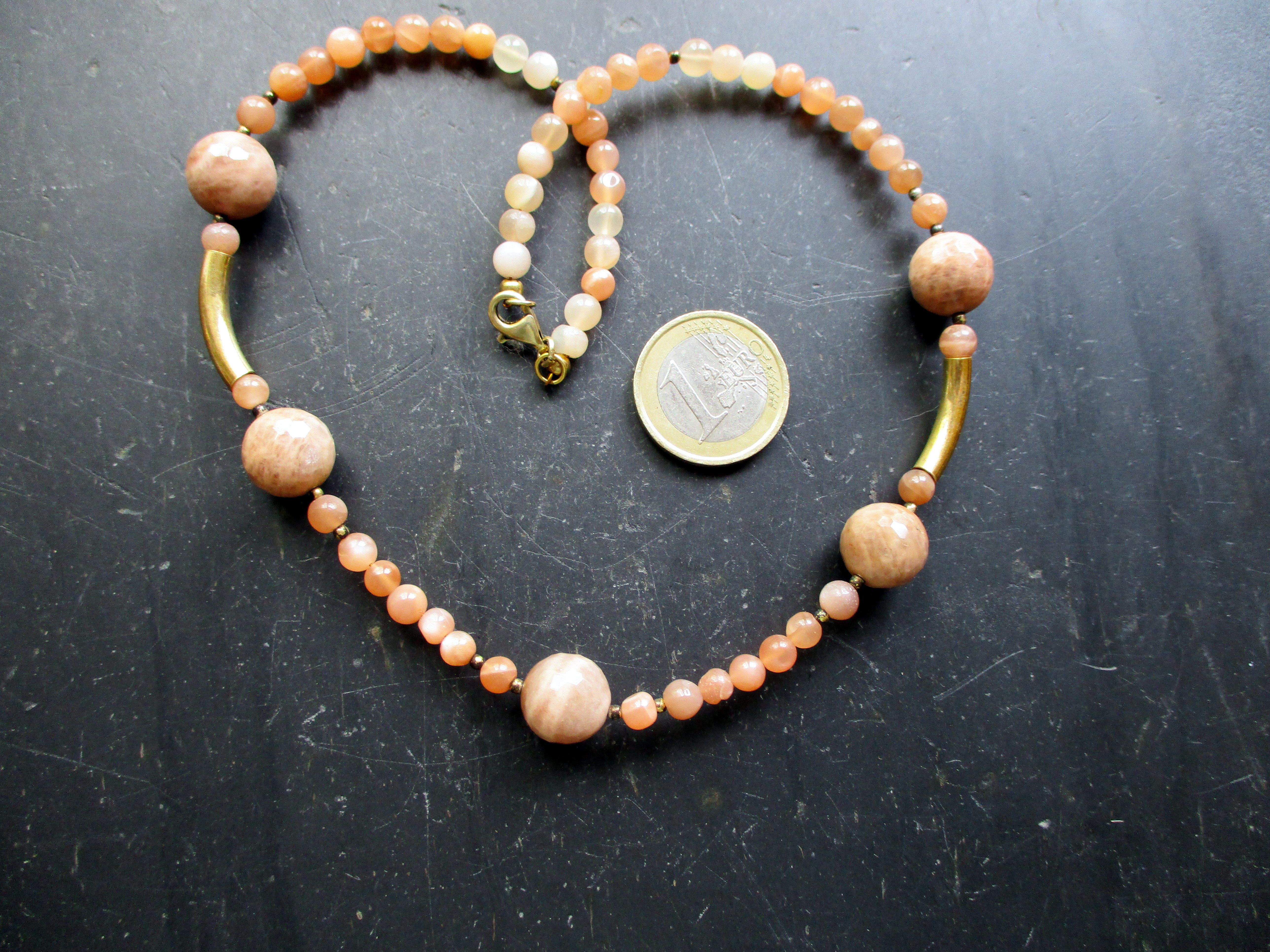 eine Kette aus kleinen beigen Mondsteinkugeln, dazwischen