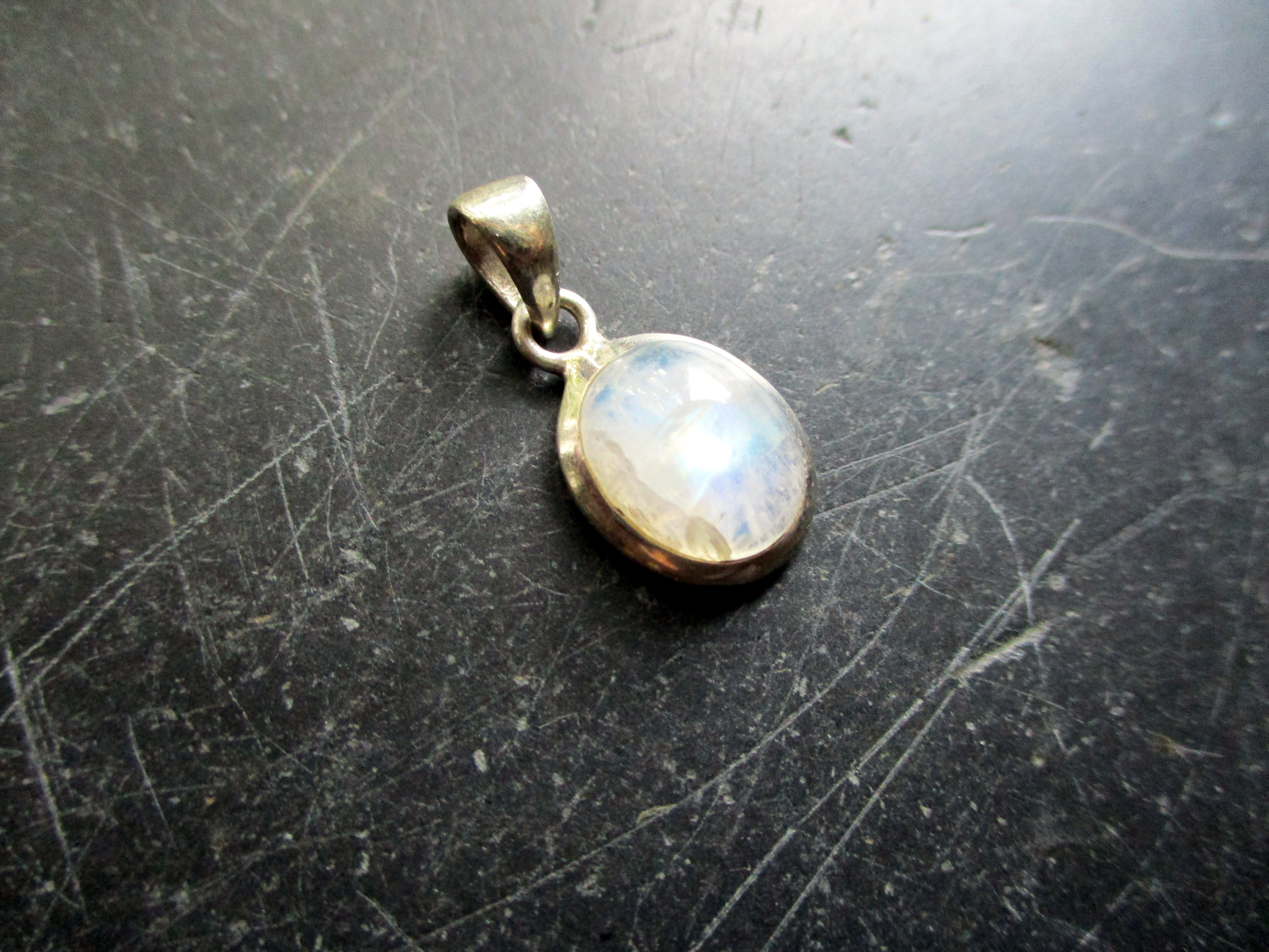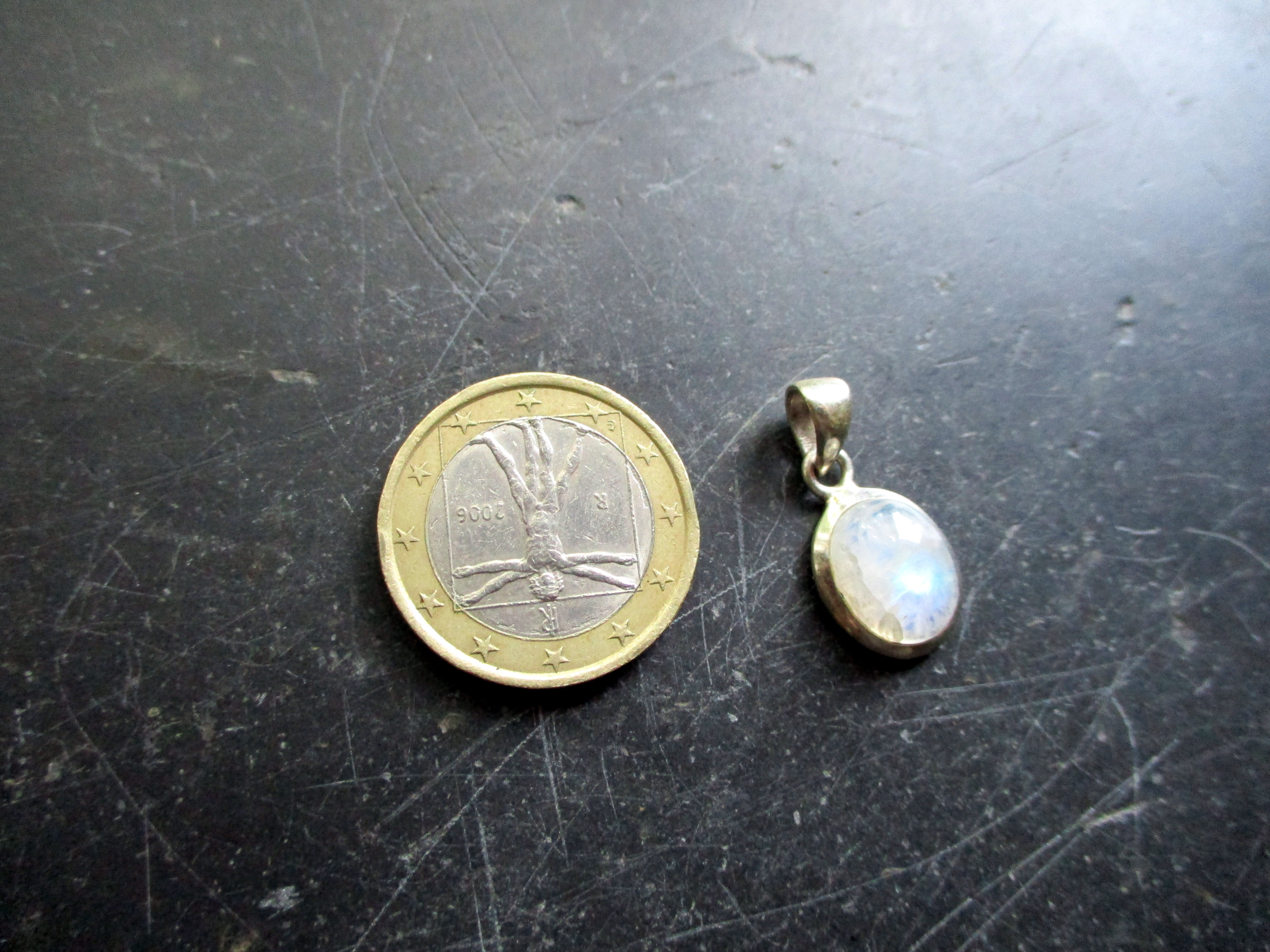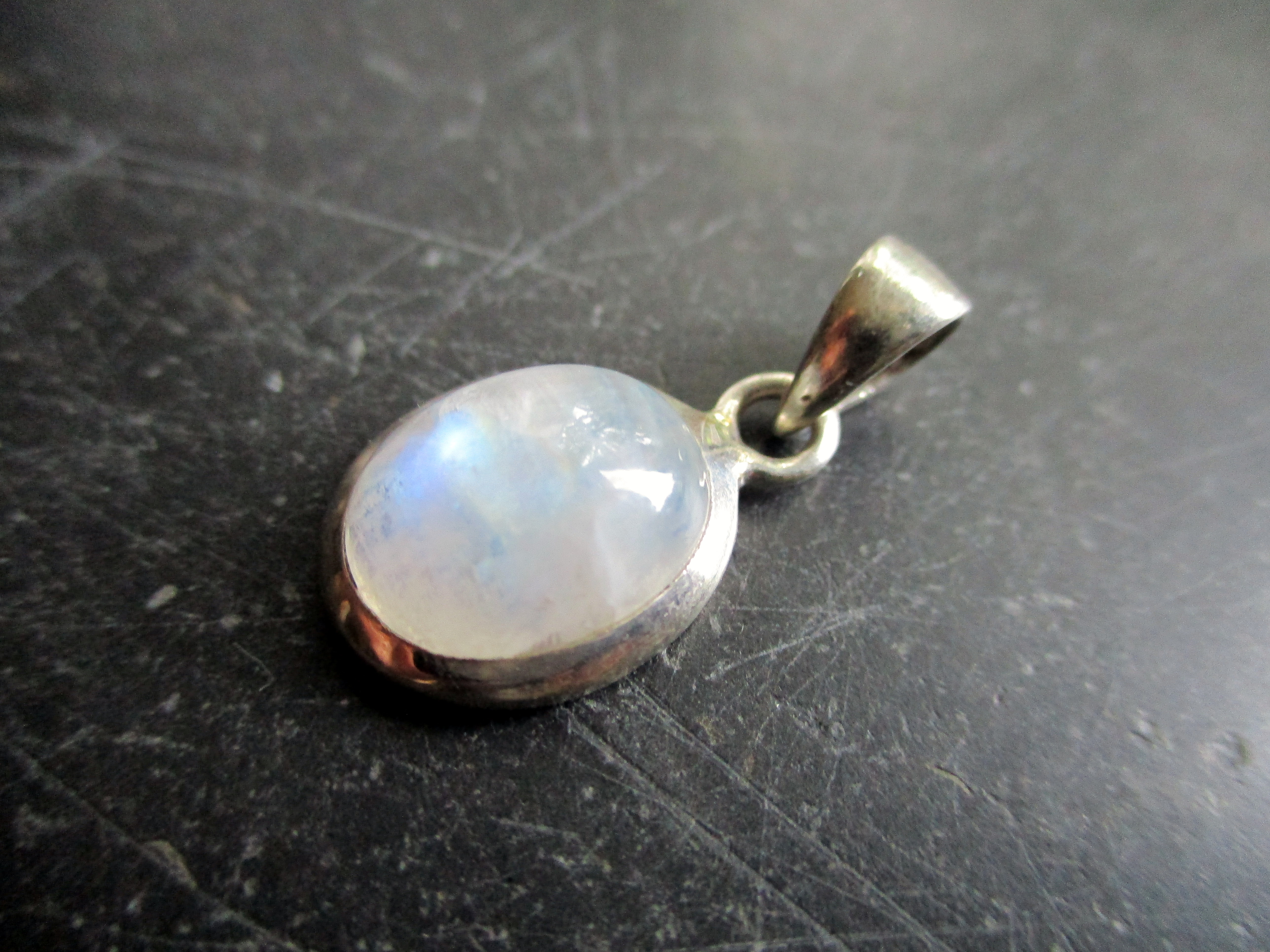 Schön gefasst ist dieser Anhänger aus leuchtendem Mondstein.