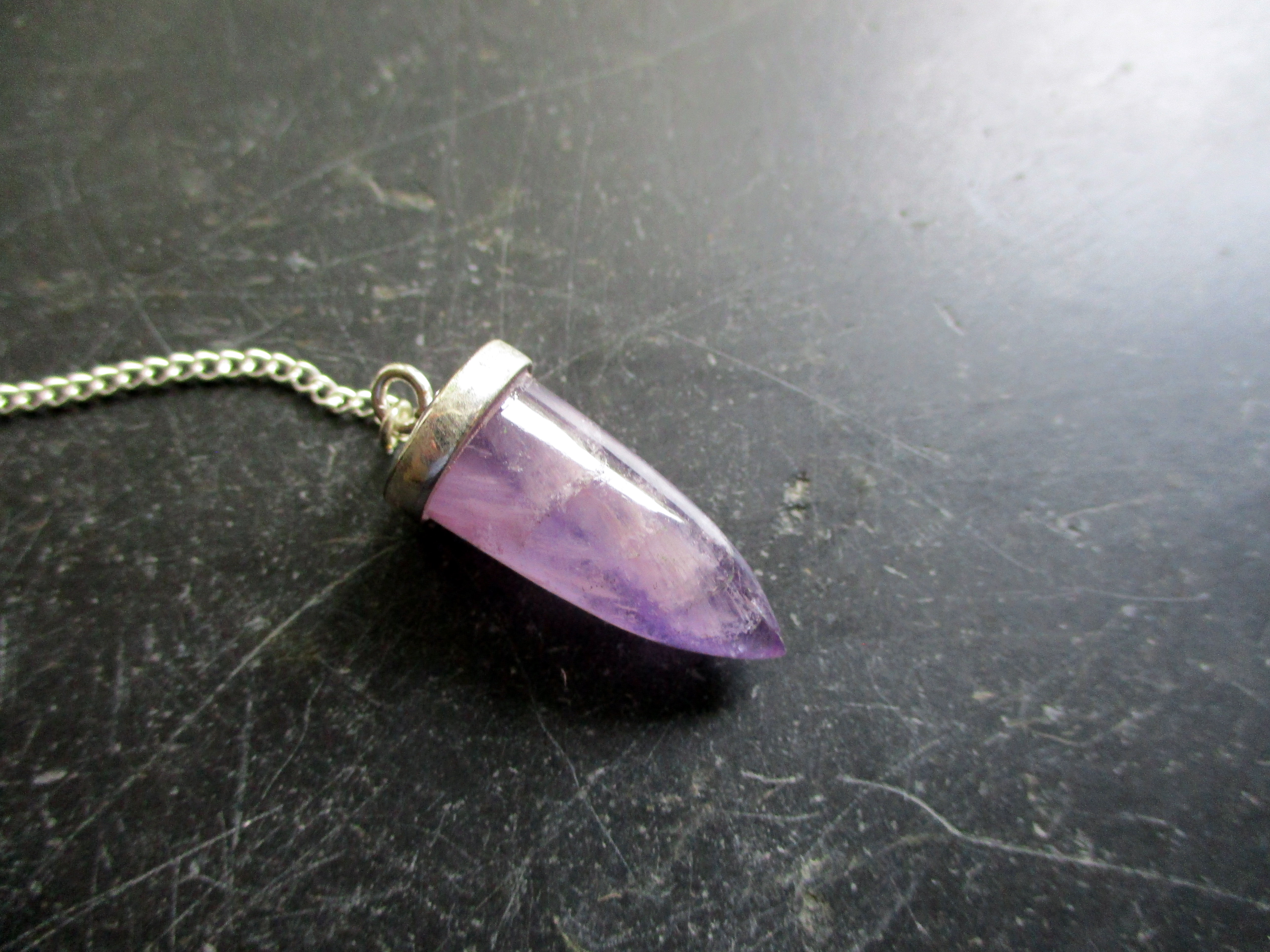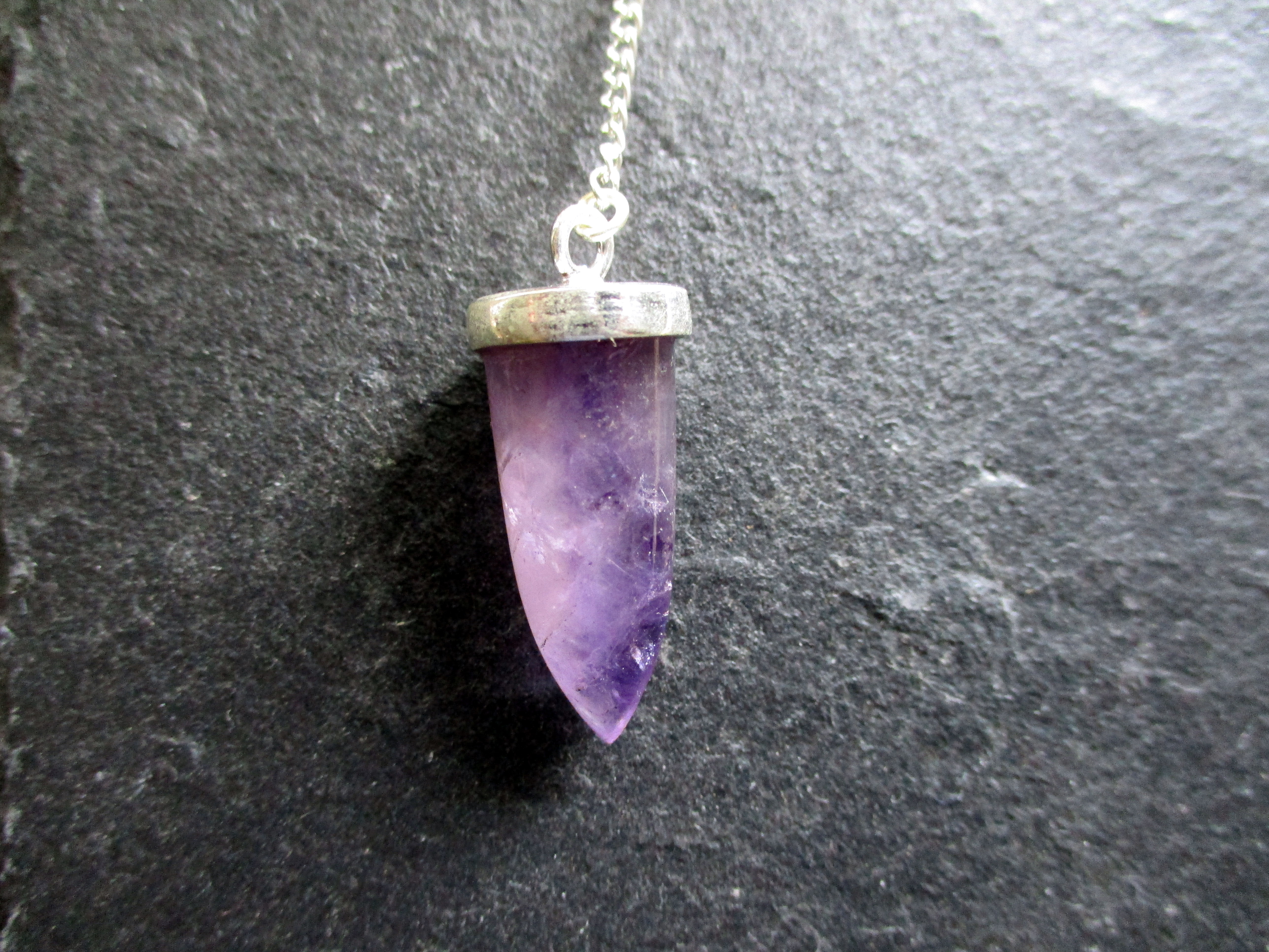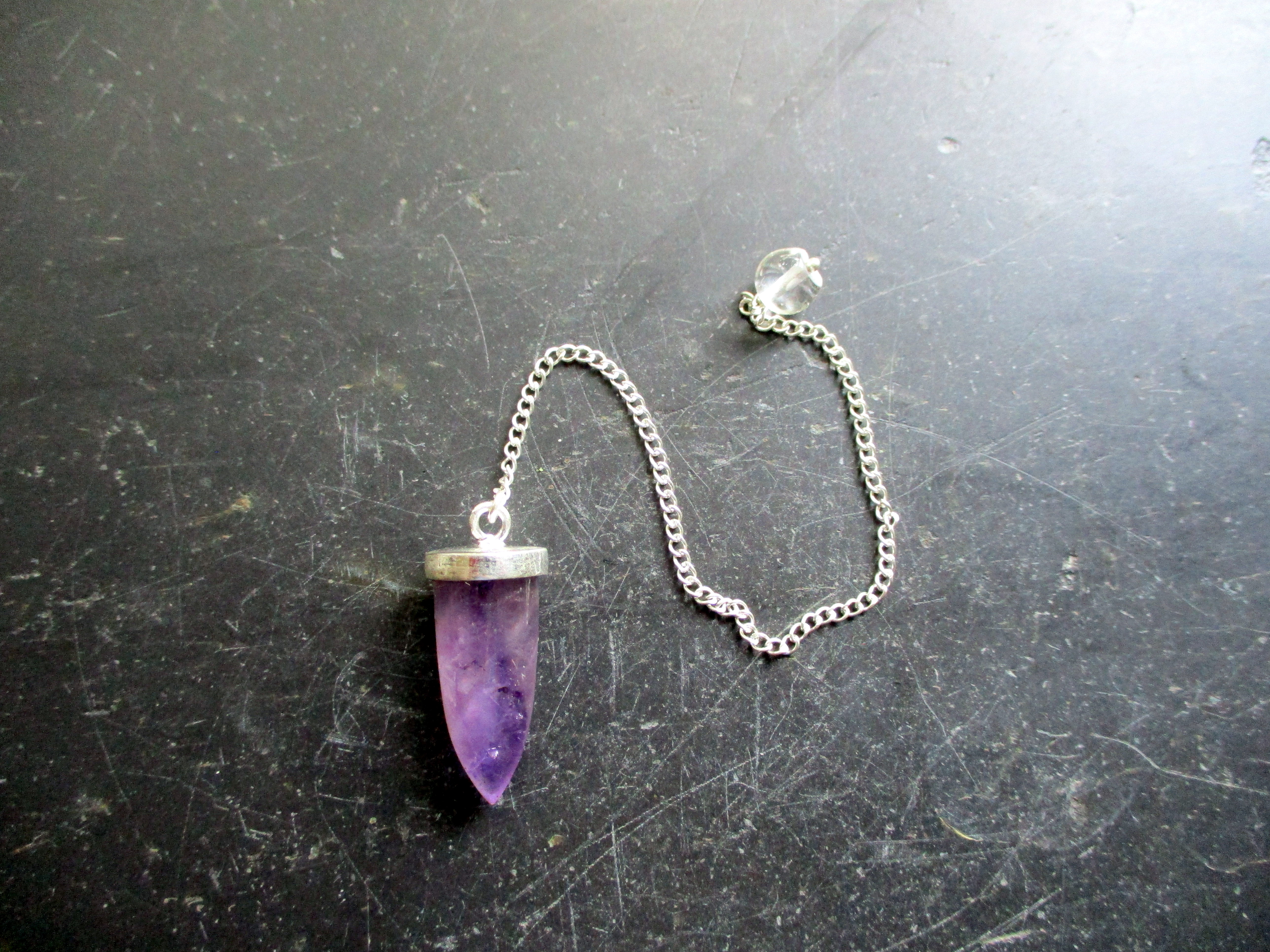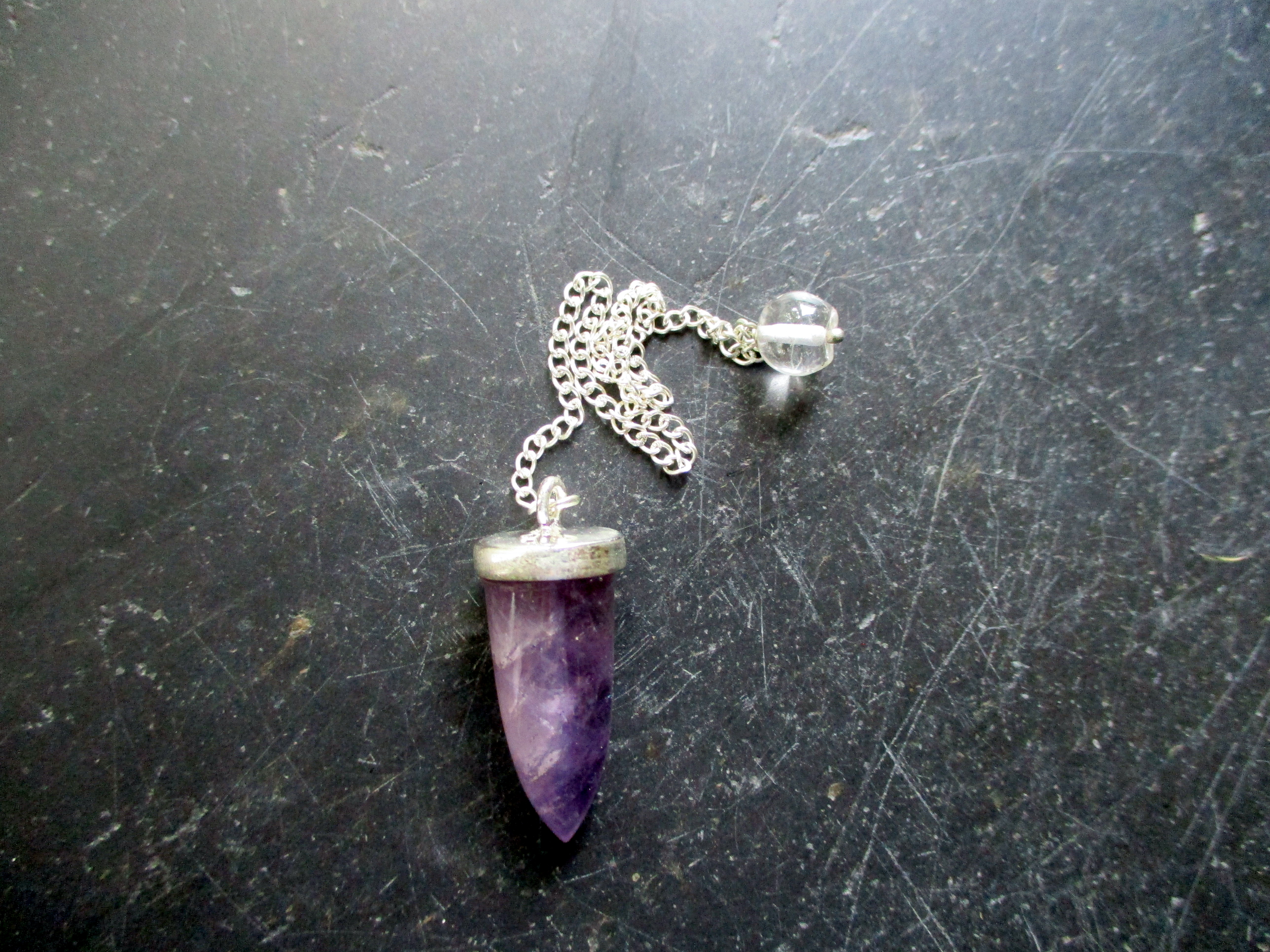 Pendel, Metall, versilbert, Fluorit, lila, Spitzpendel, Wicca, Schamane