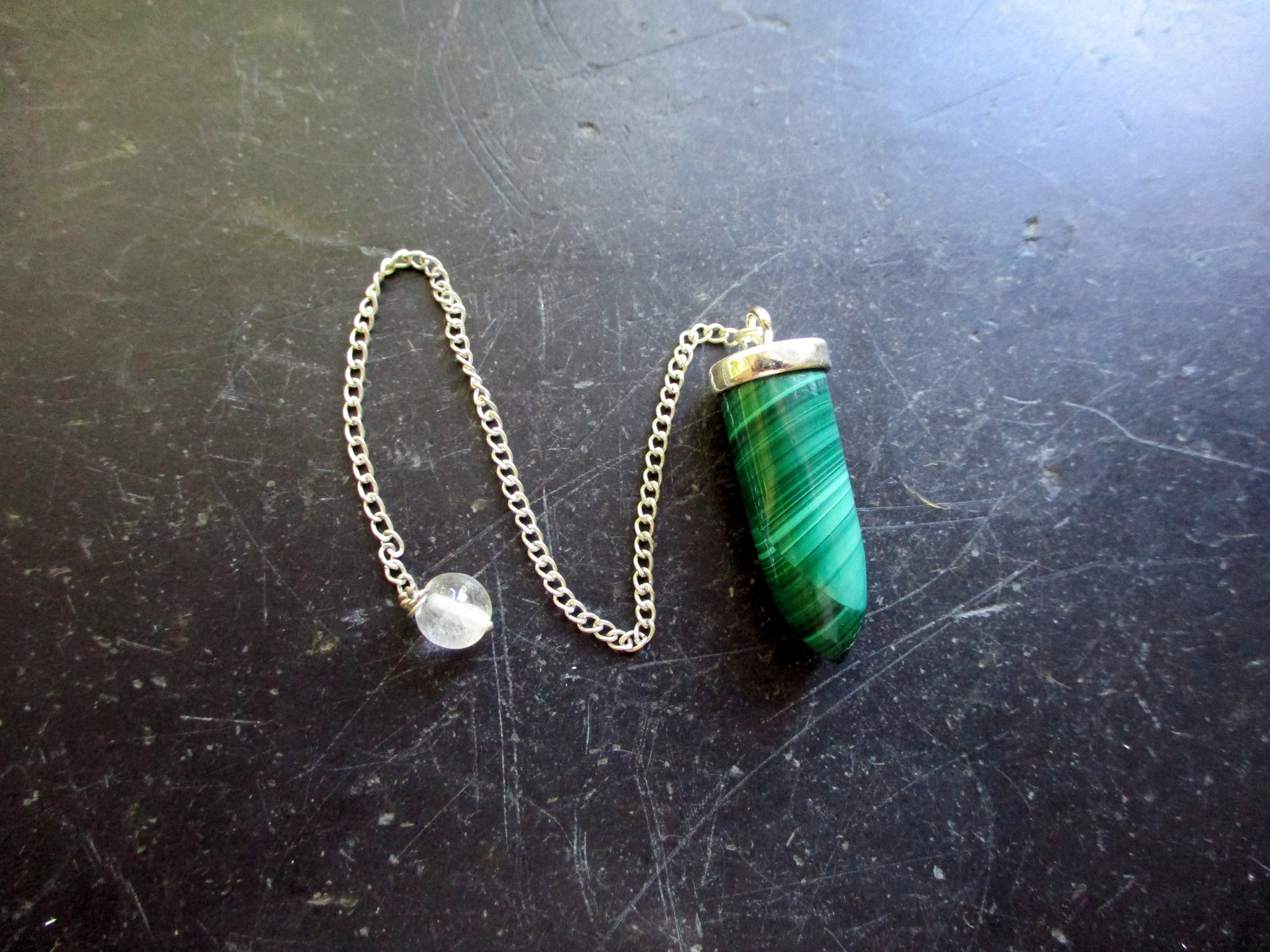 Messing, versilbert. Malachit soll Ruhe beim Pendel geben.