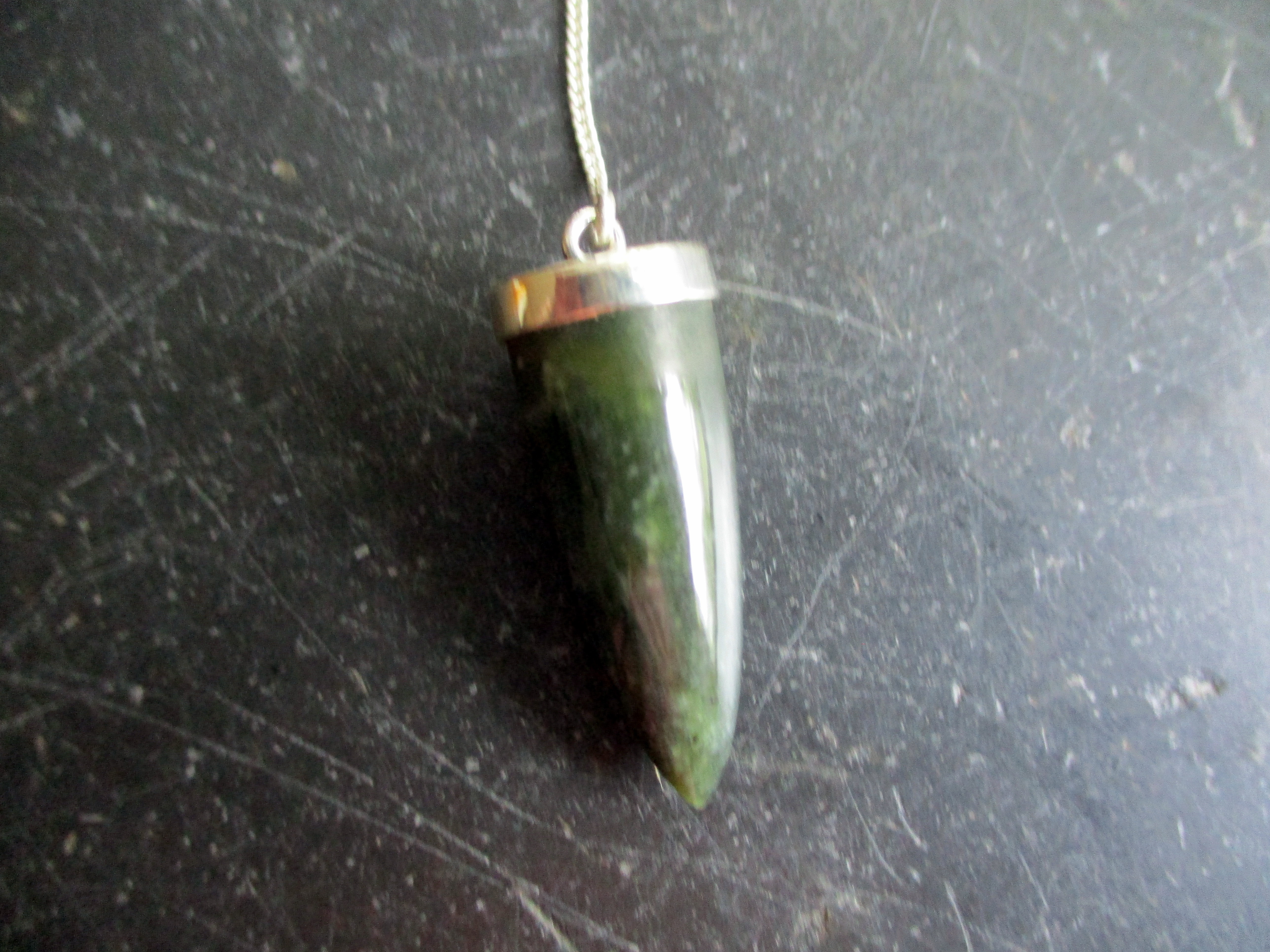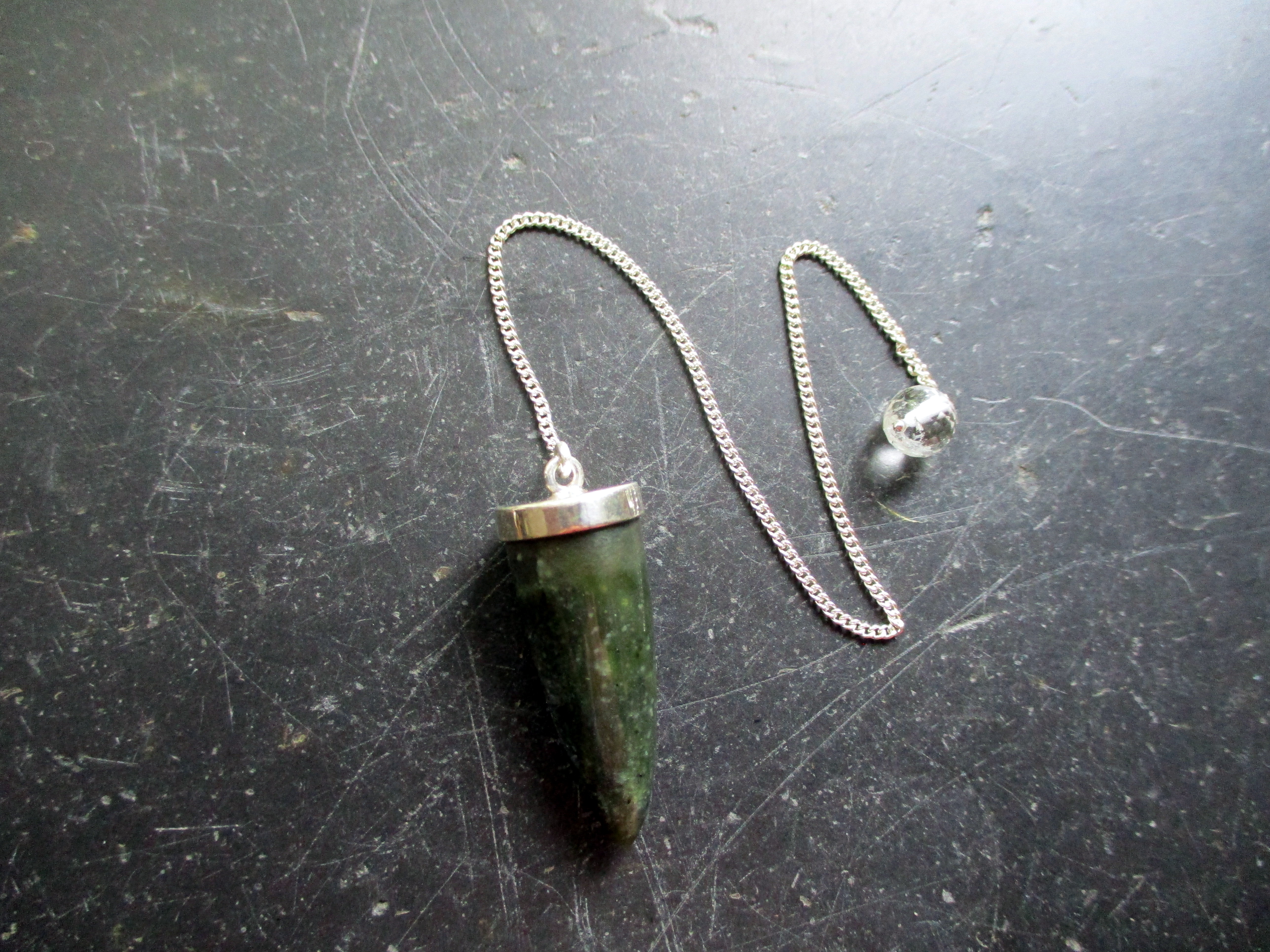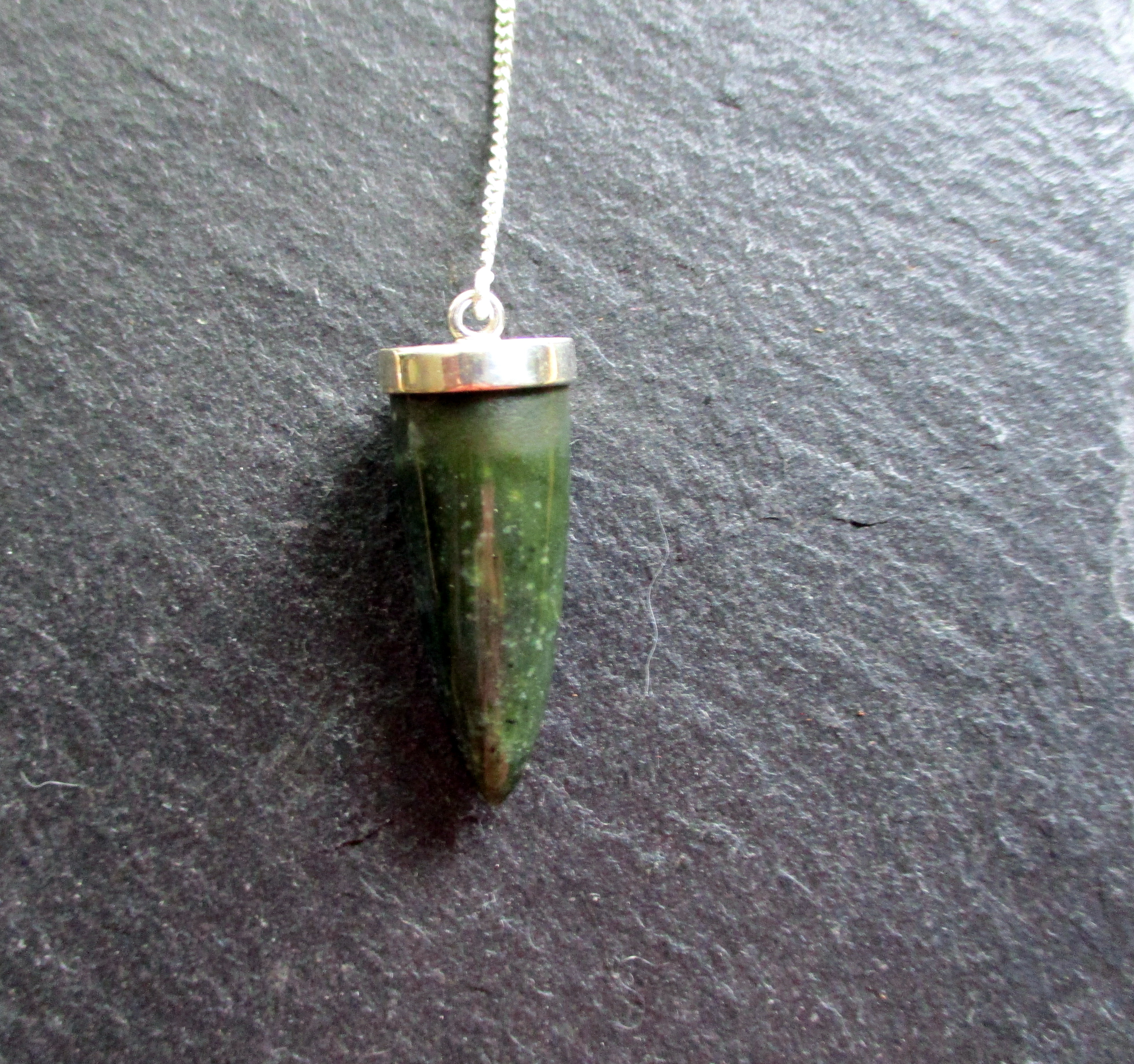 Aus dunkelgrüner Jade ist dieses Spitzpendel gemacht.