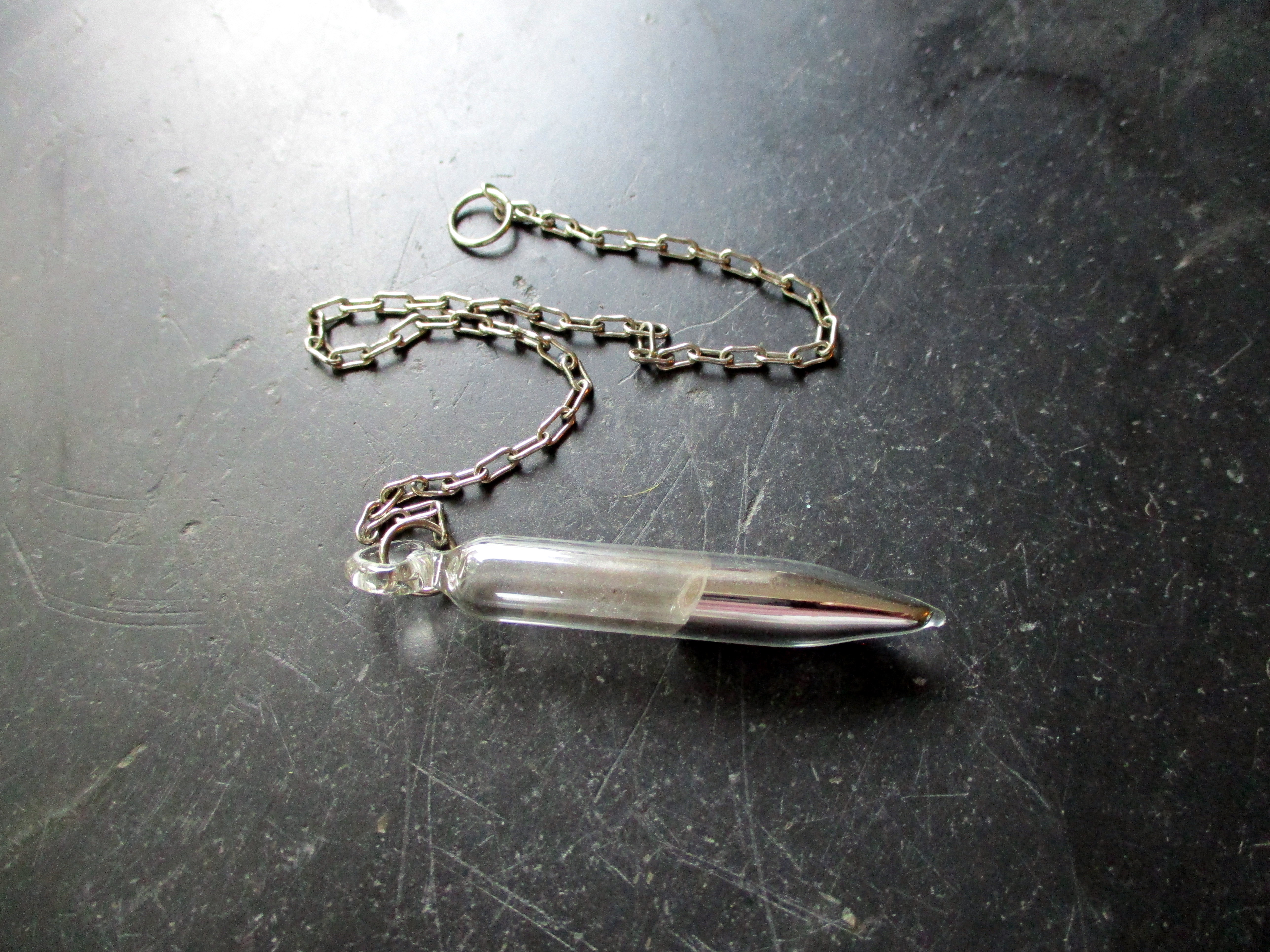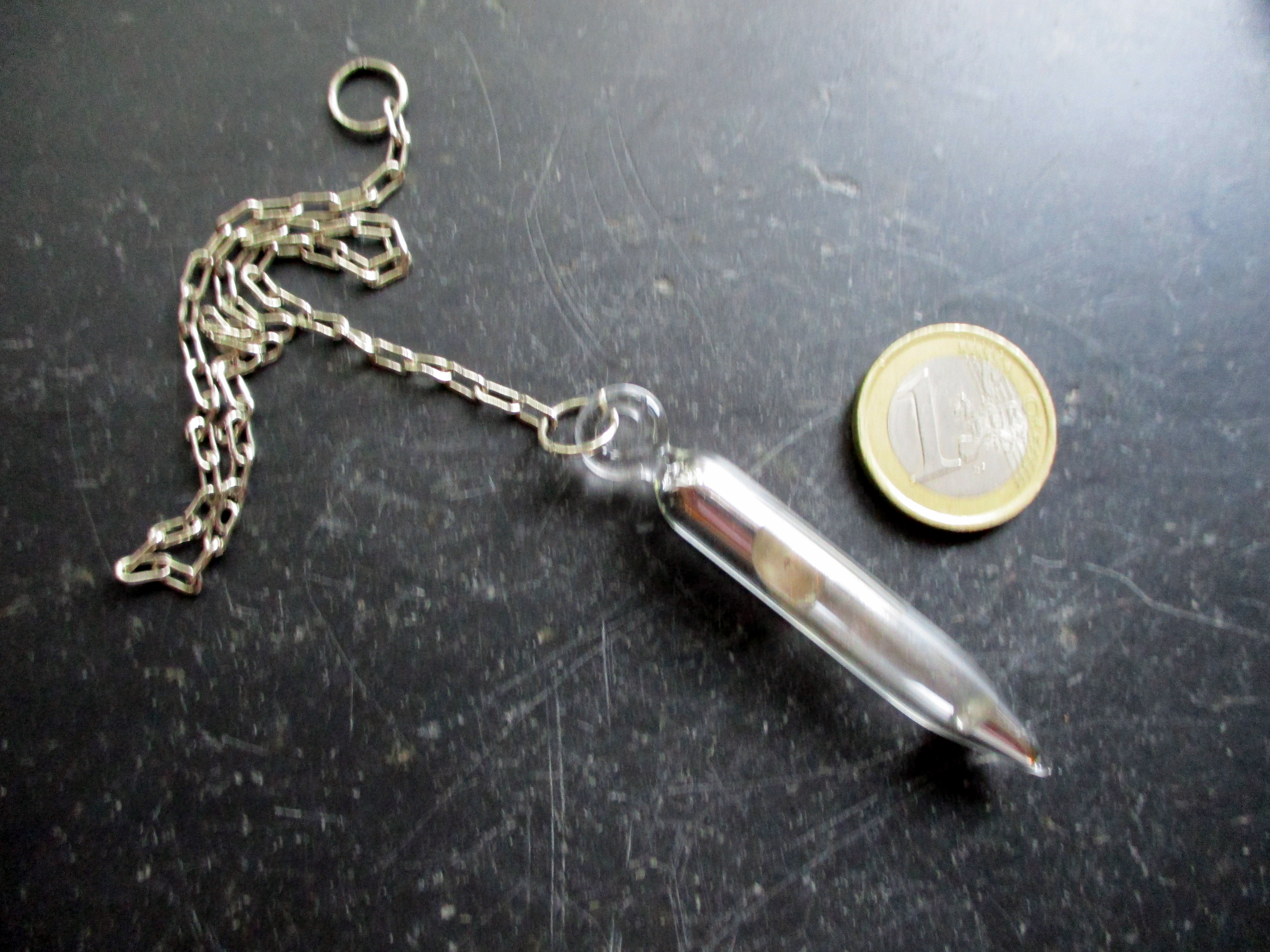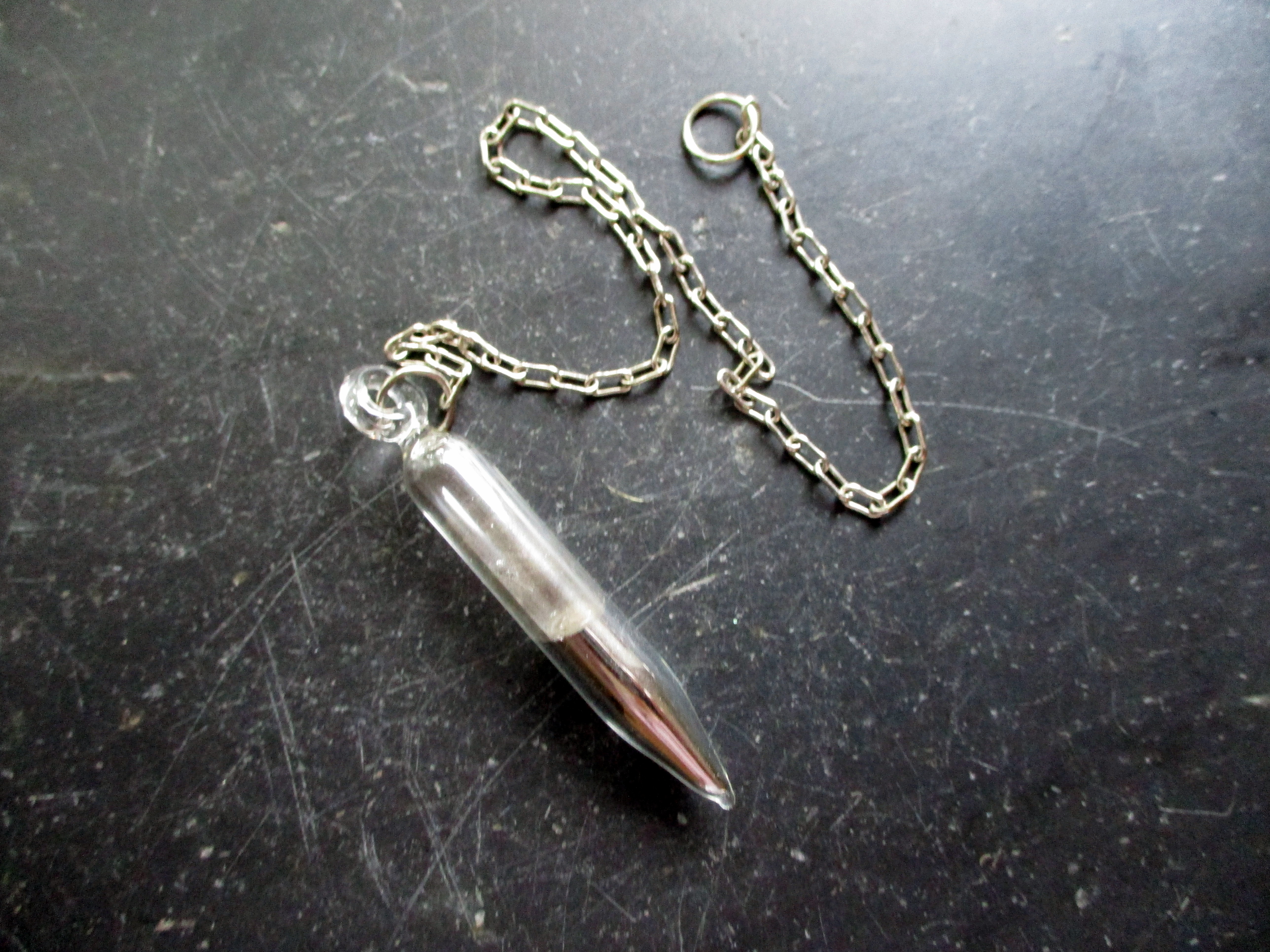 Ein Spitzpendel aus Glas, gefüllt mit Quecksilber.