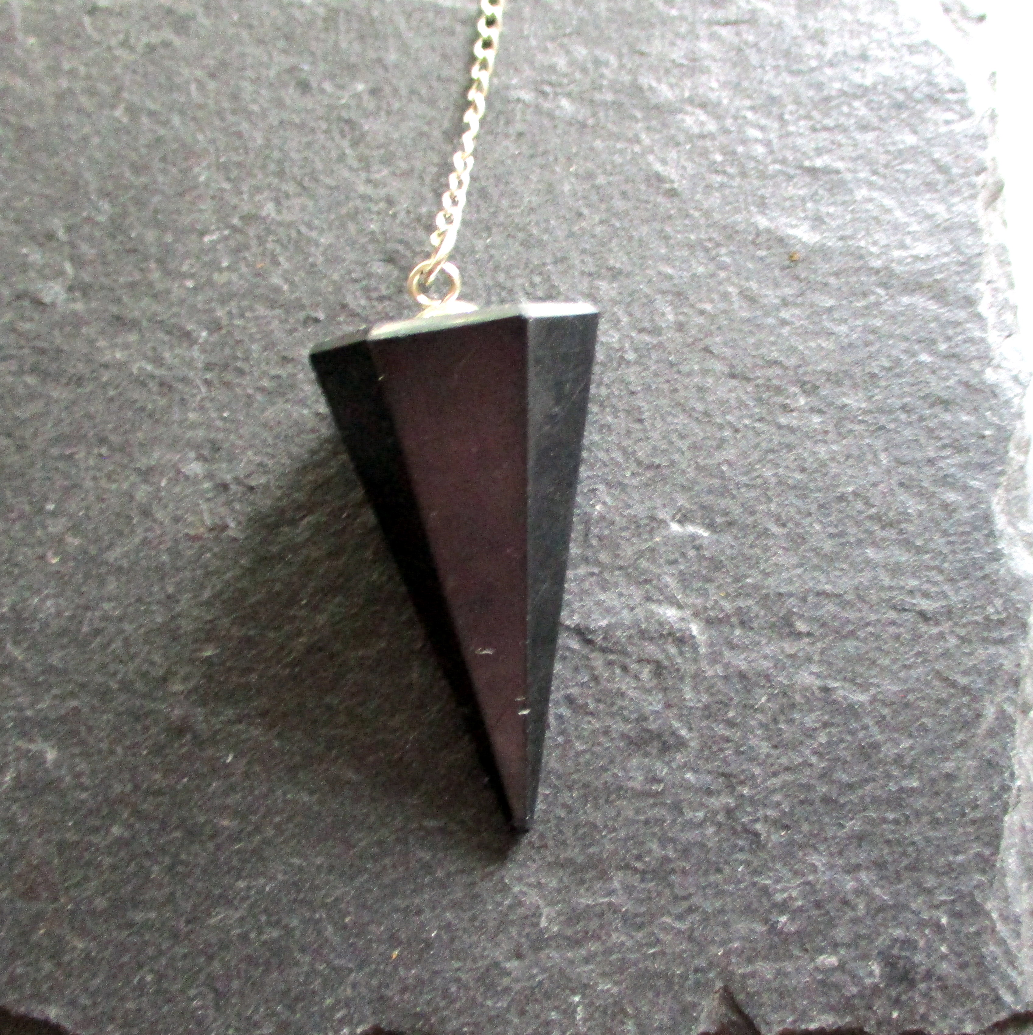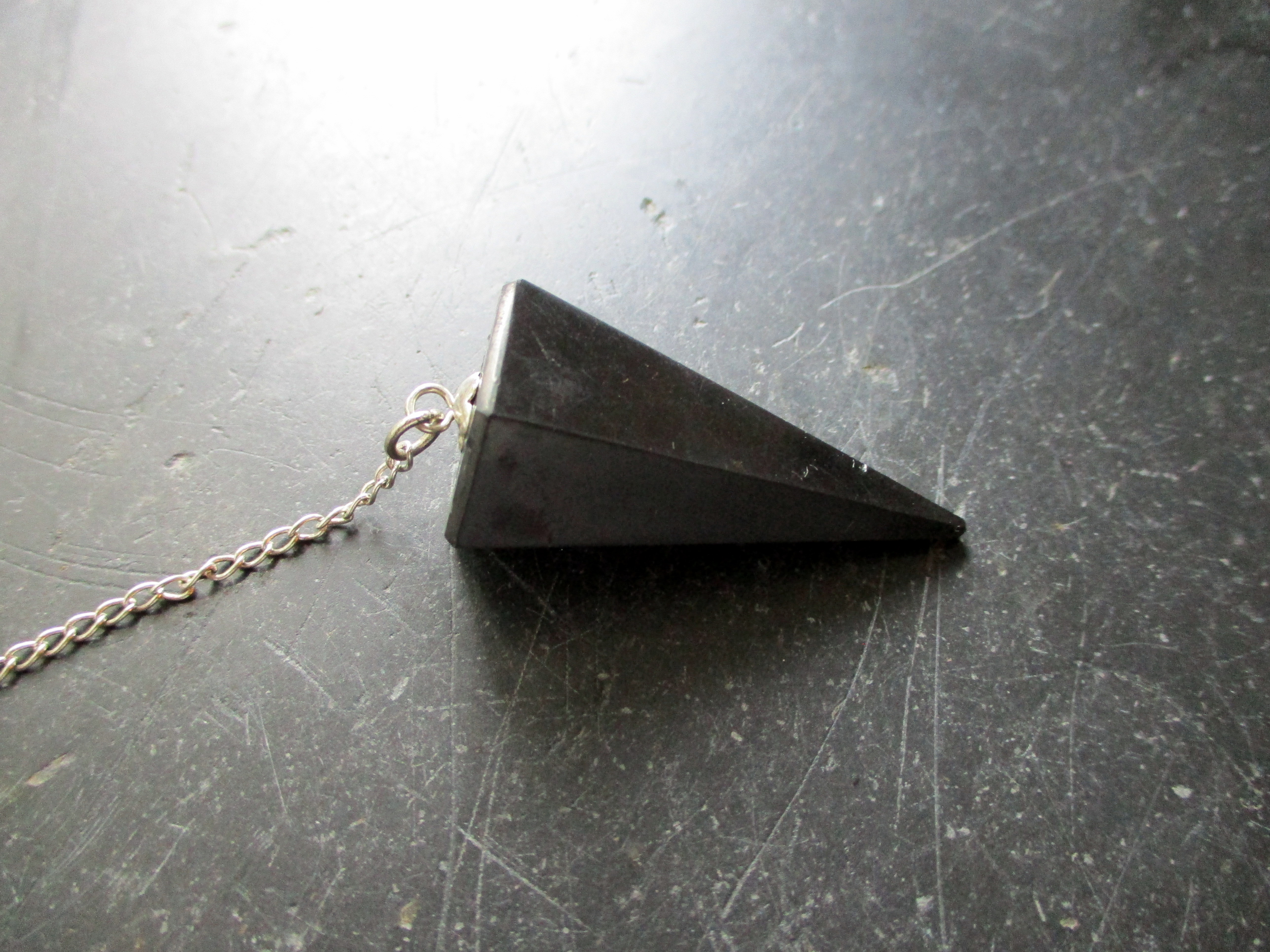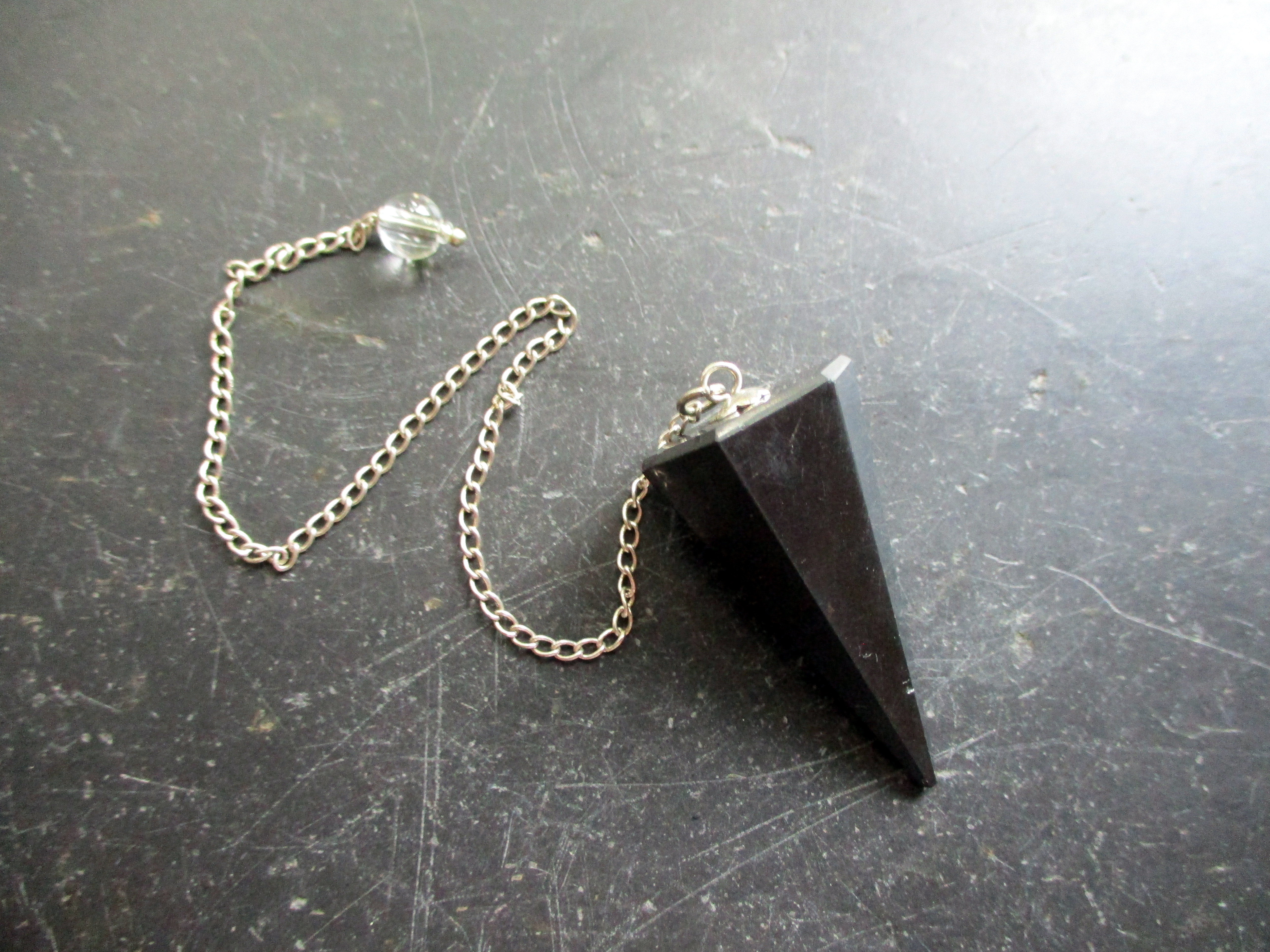 Das Pendel ist aus Schungit mit einer Schnur aus Metall.