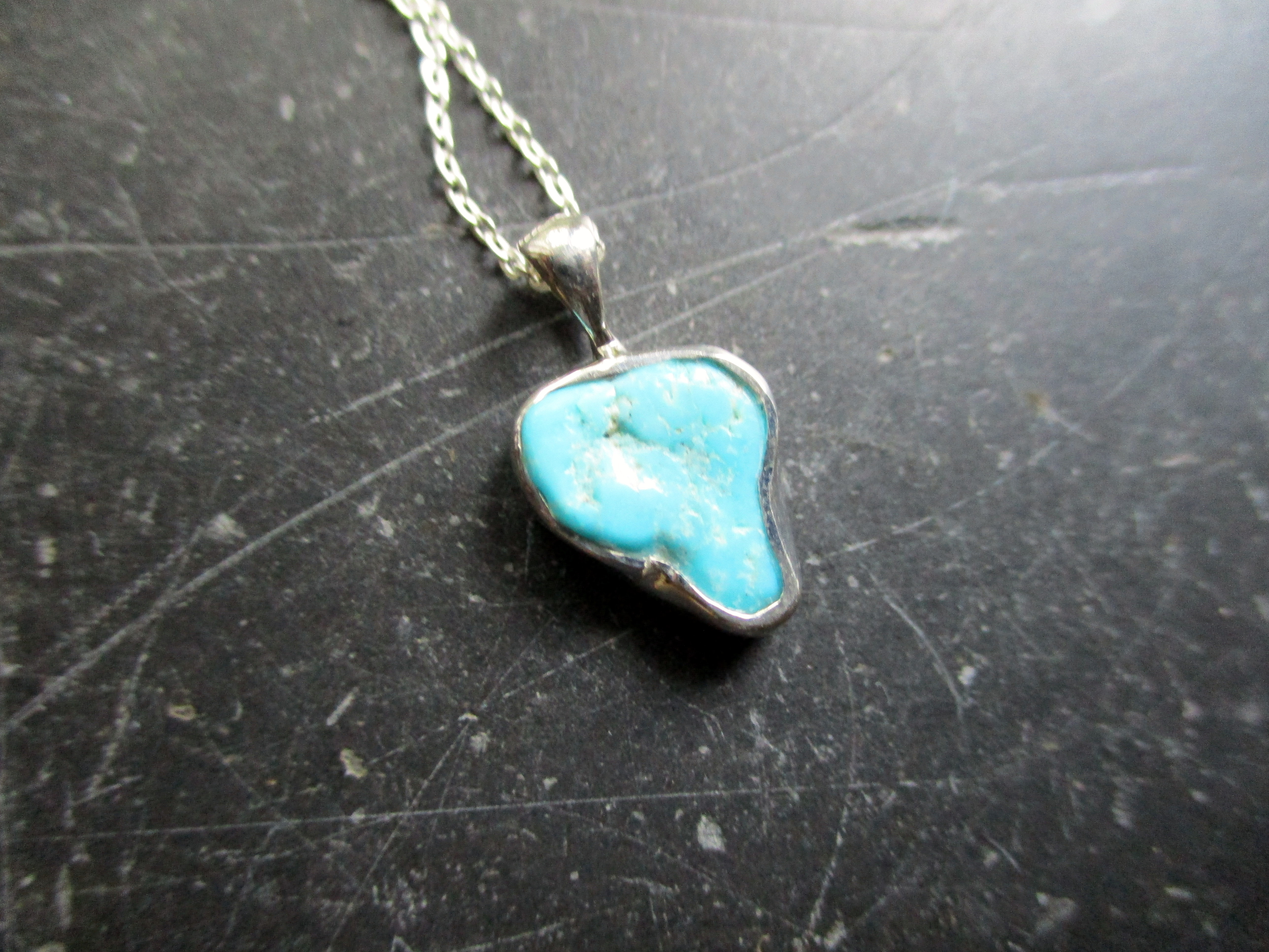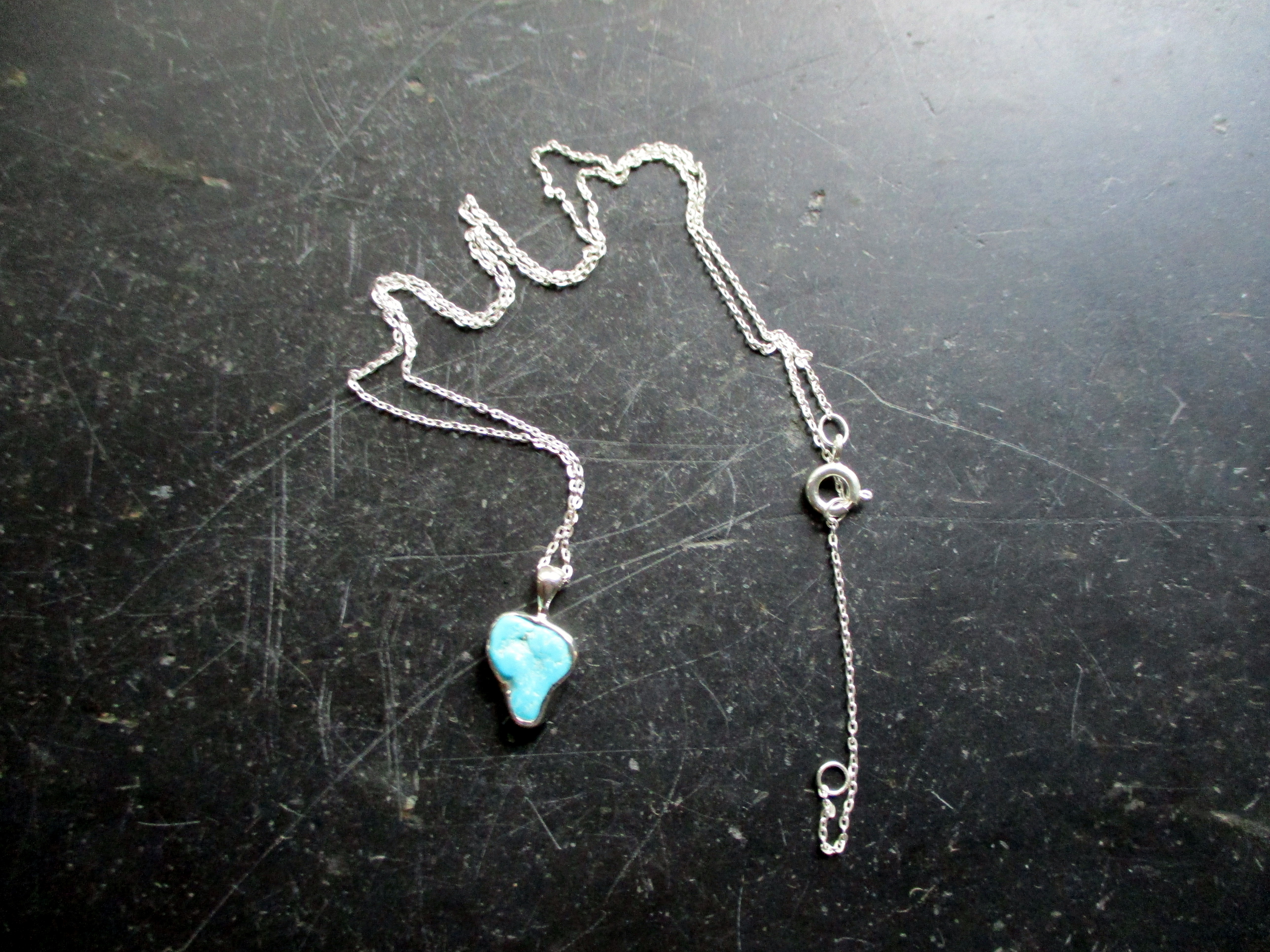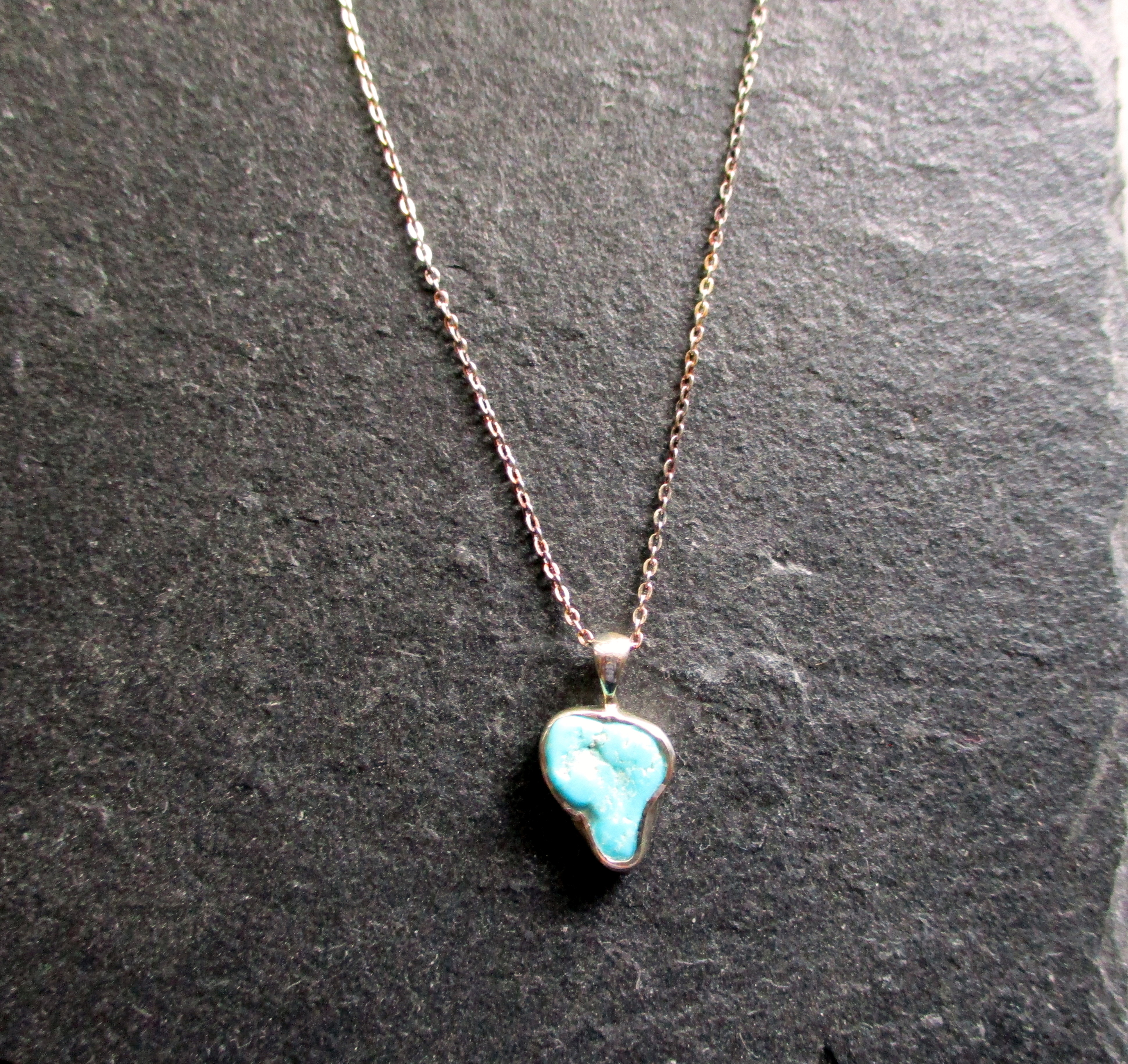 An der Kette hängt ein kleine Anhänger aus Türkis,