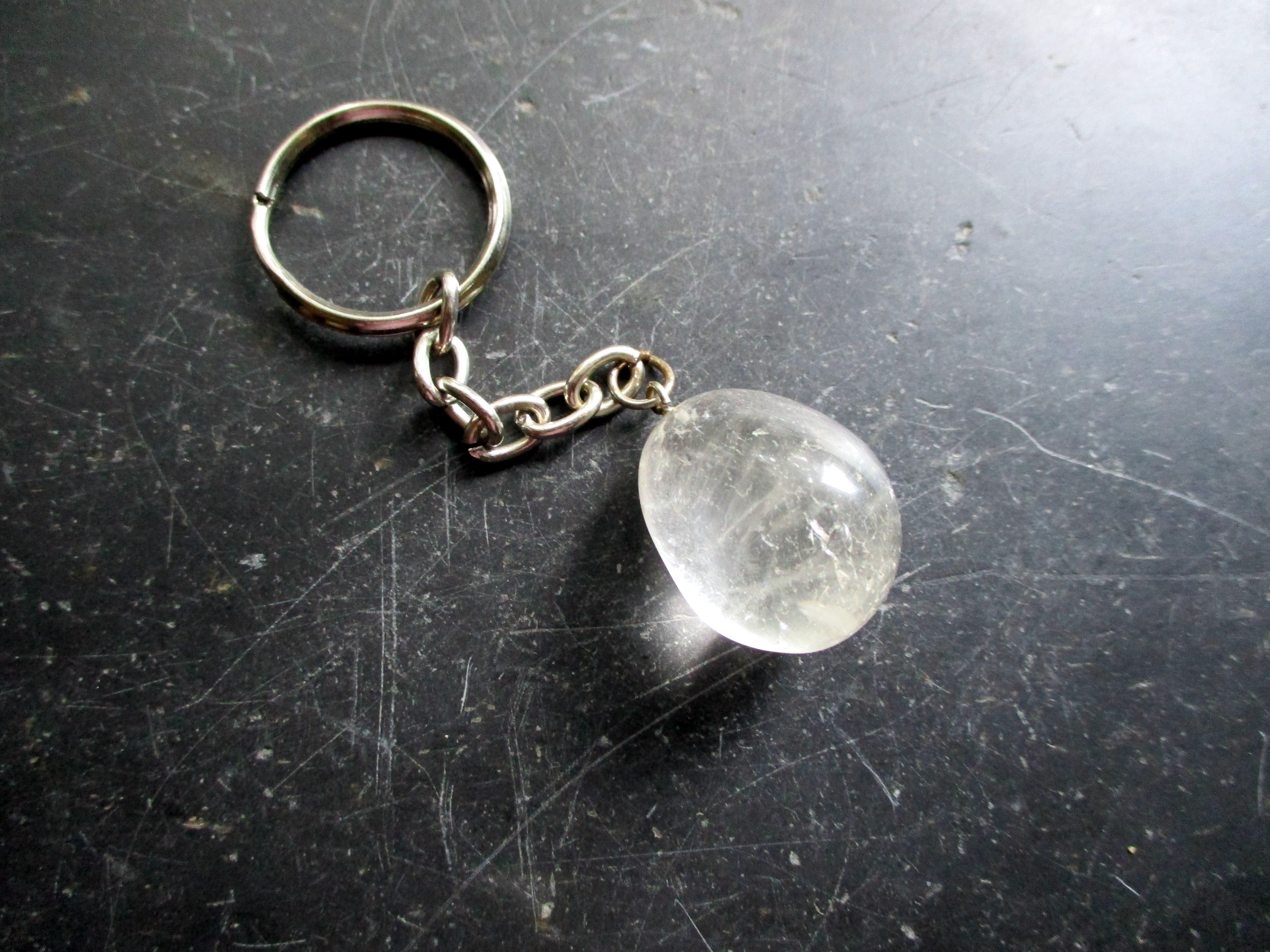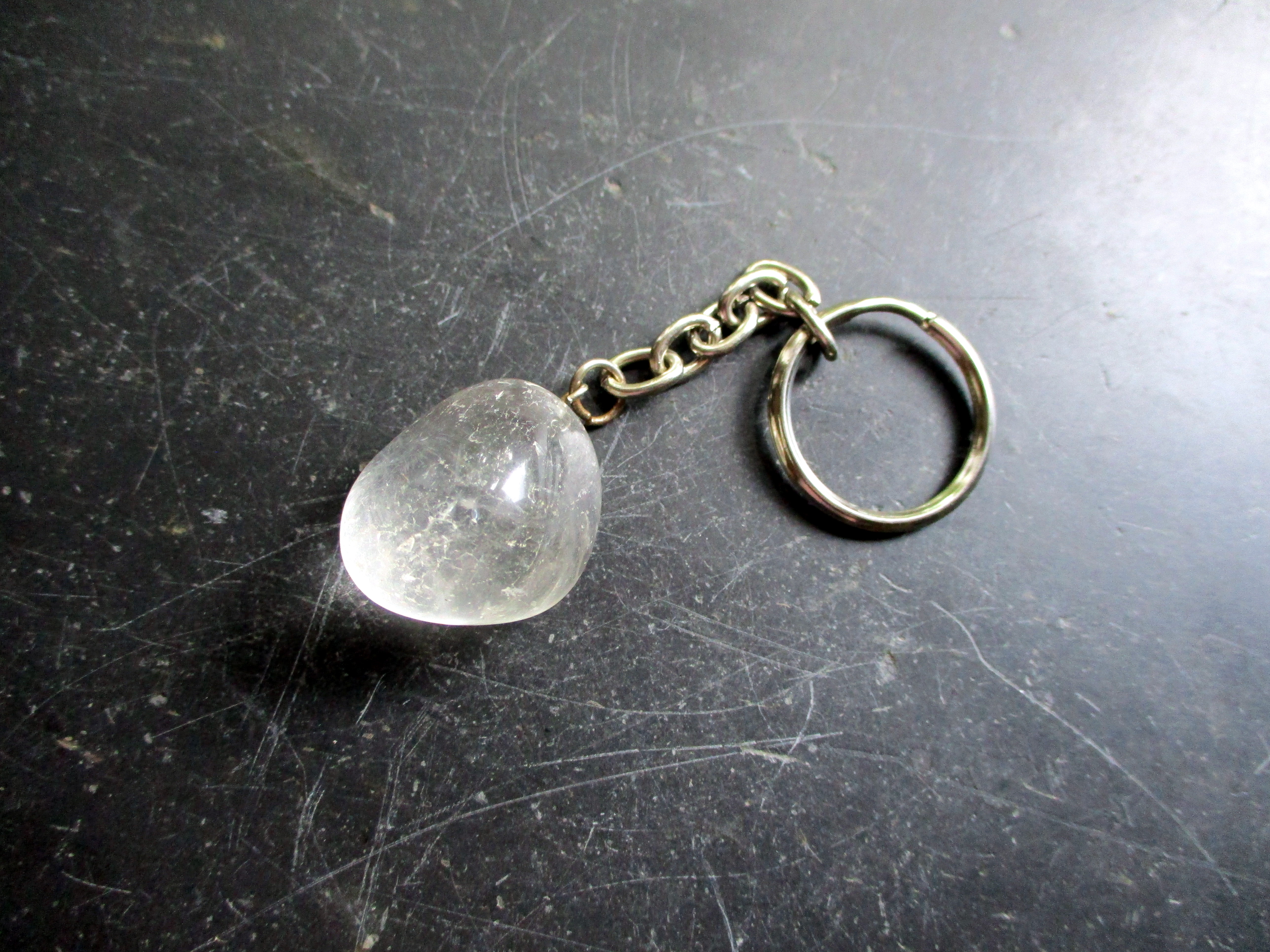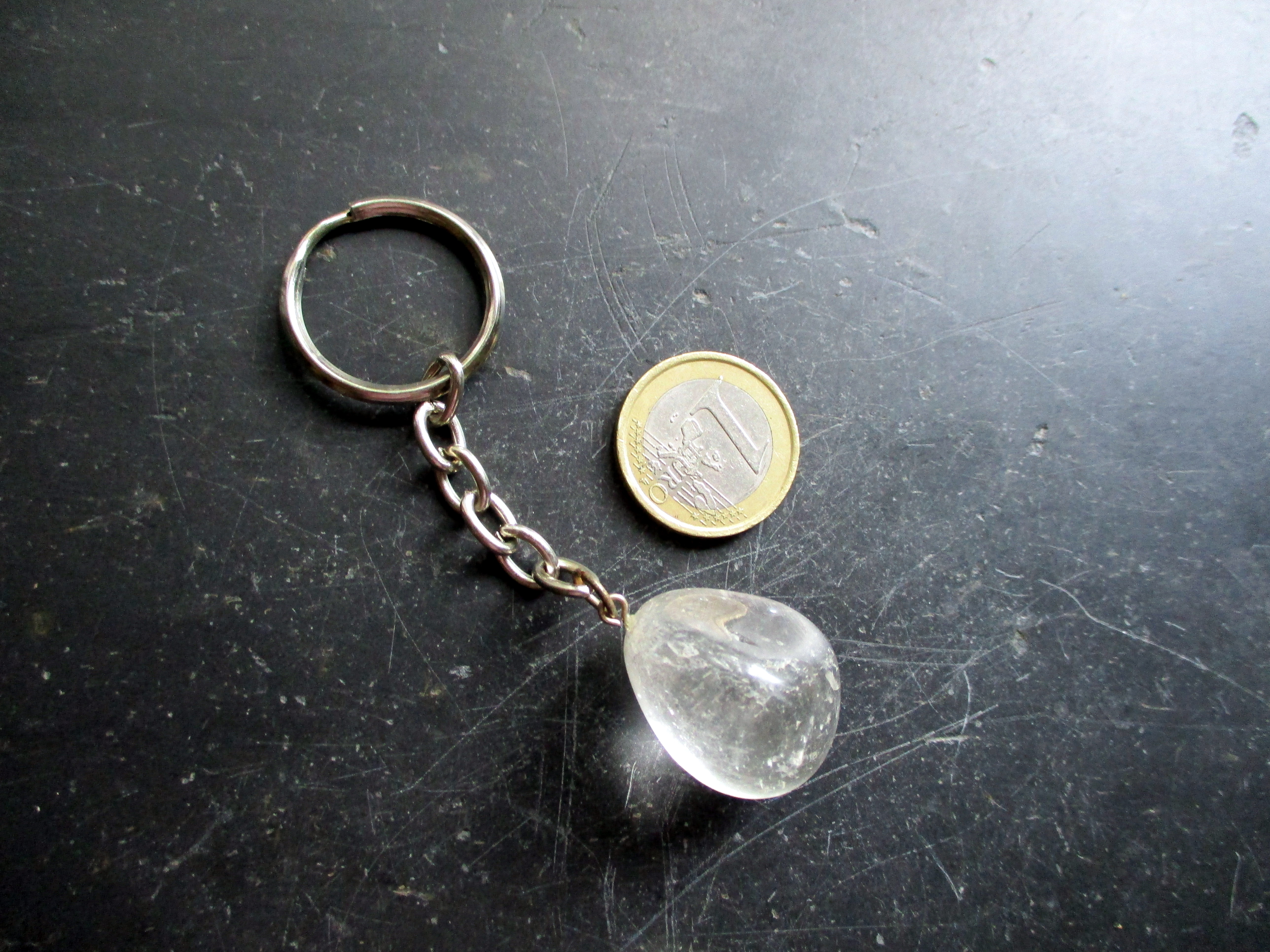 Ein Nugget aus Bergkristall hängt an diesem Schlüsselanhänger.