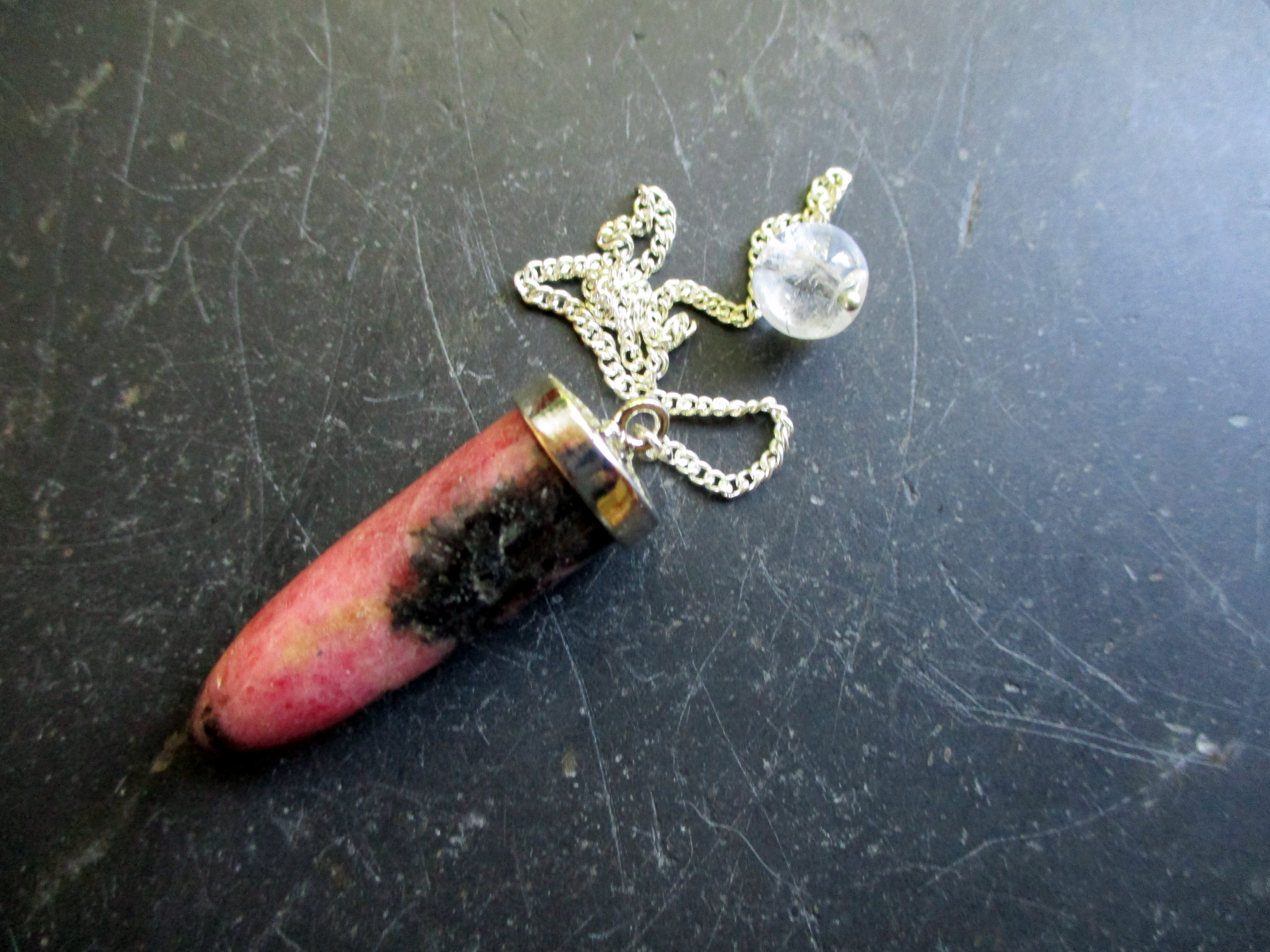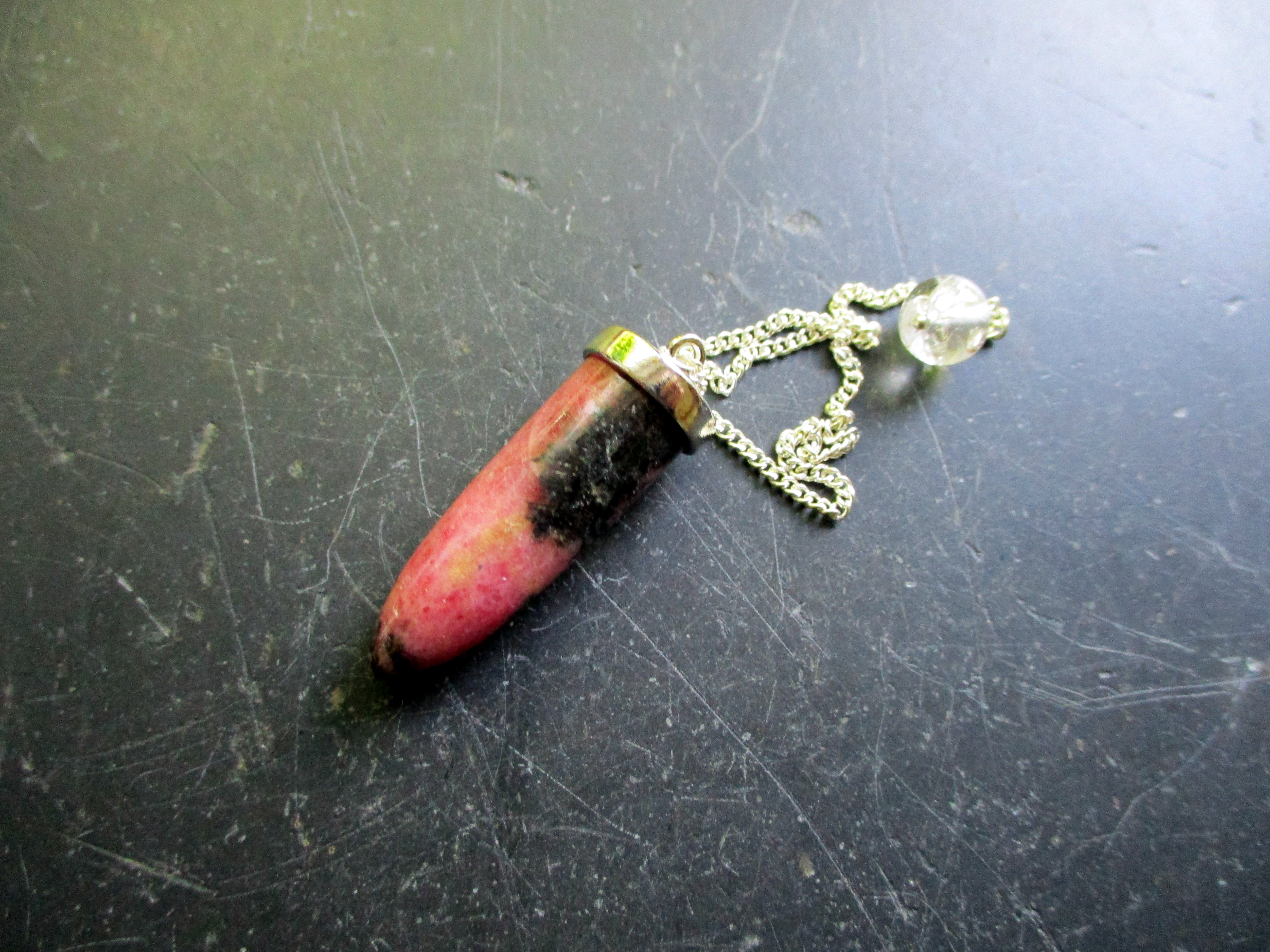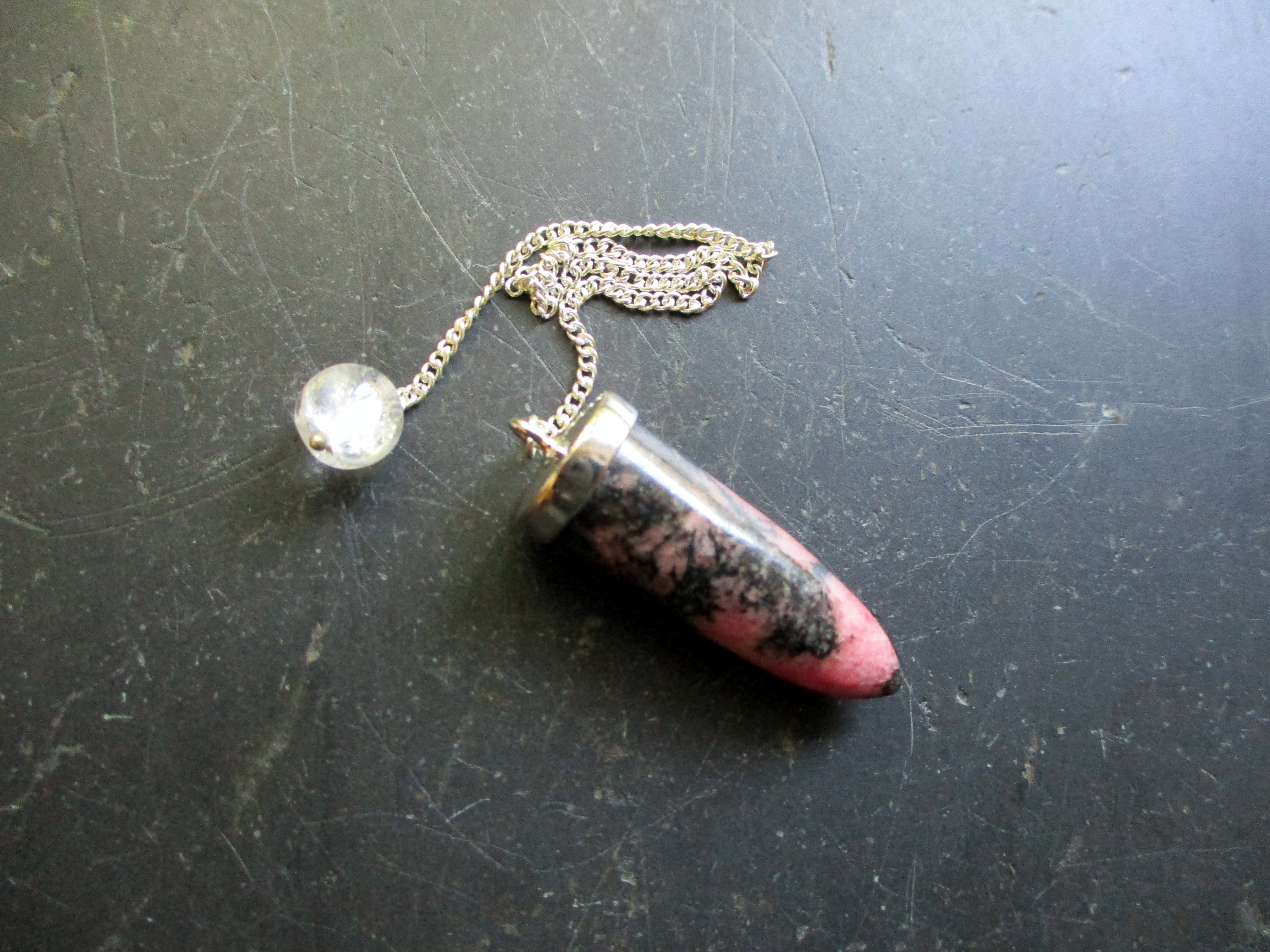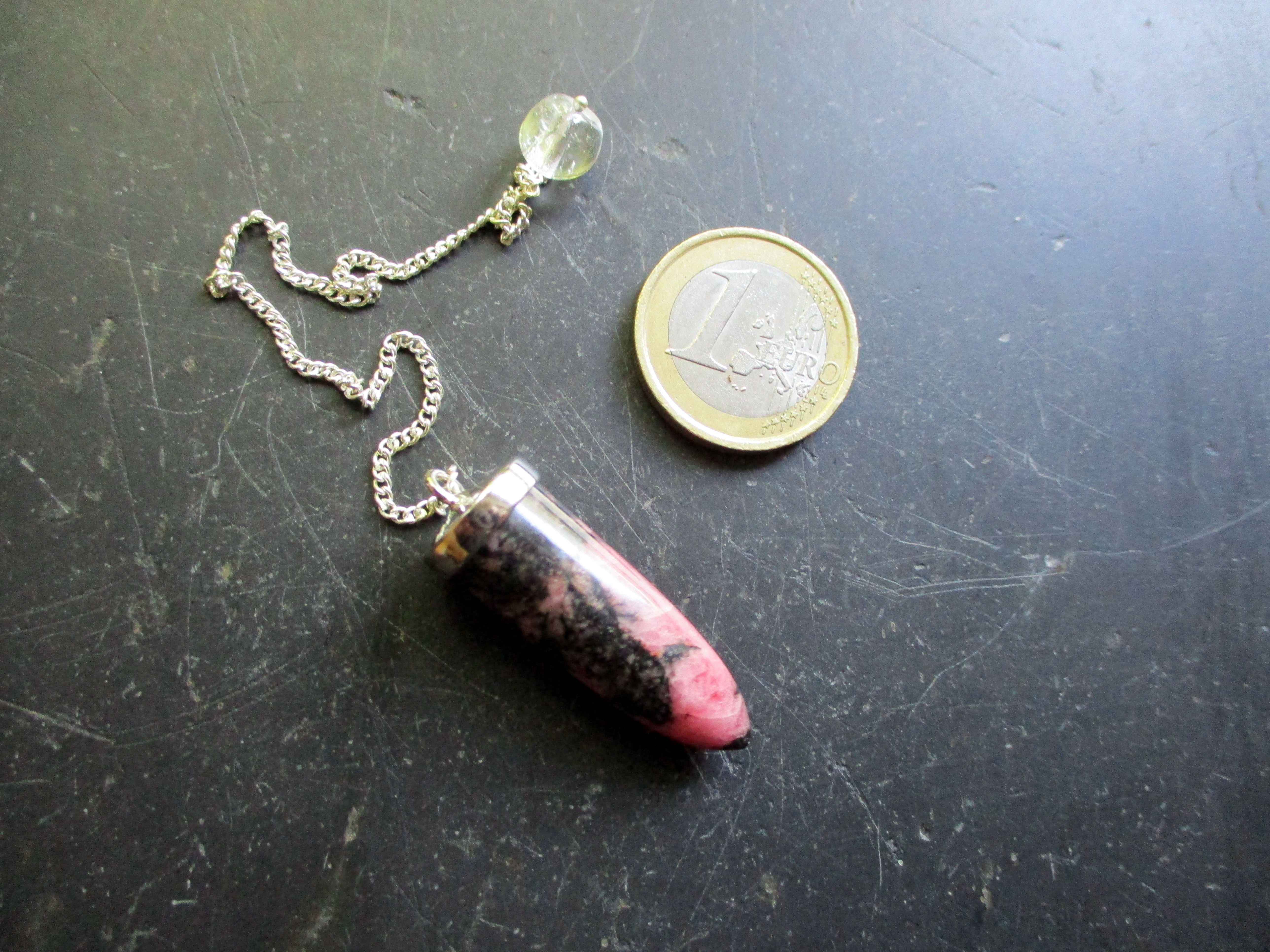 Pendel, Spitzpendel, Rhodonit, Messing, versilbert, Magie, Esoterik