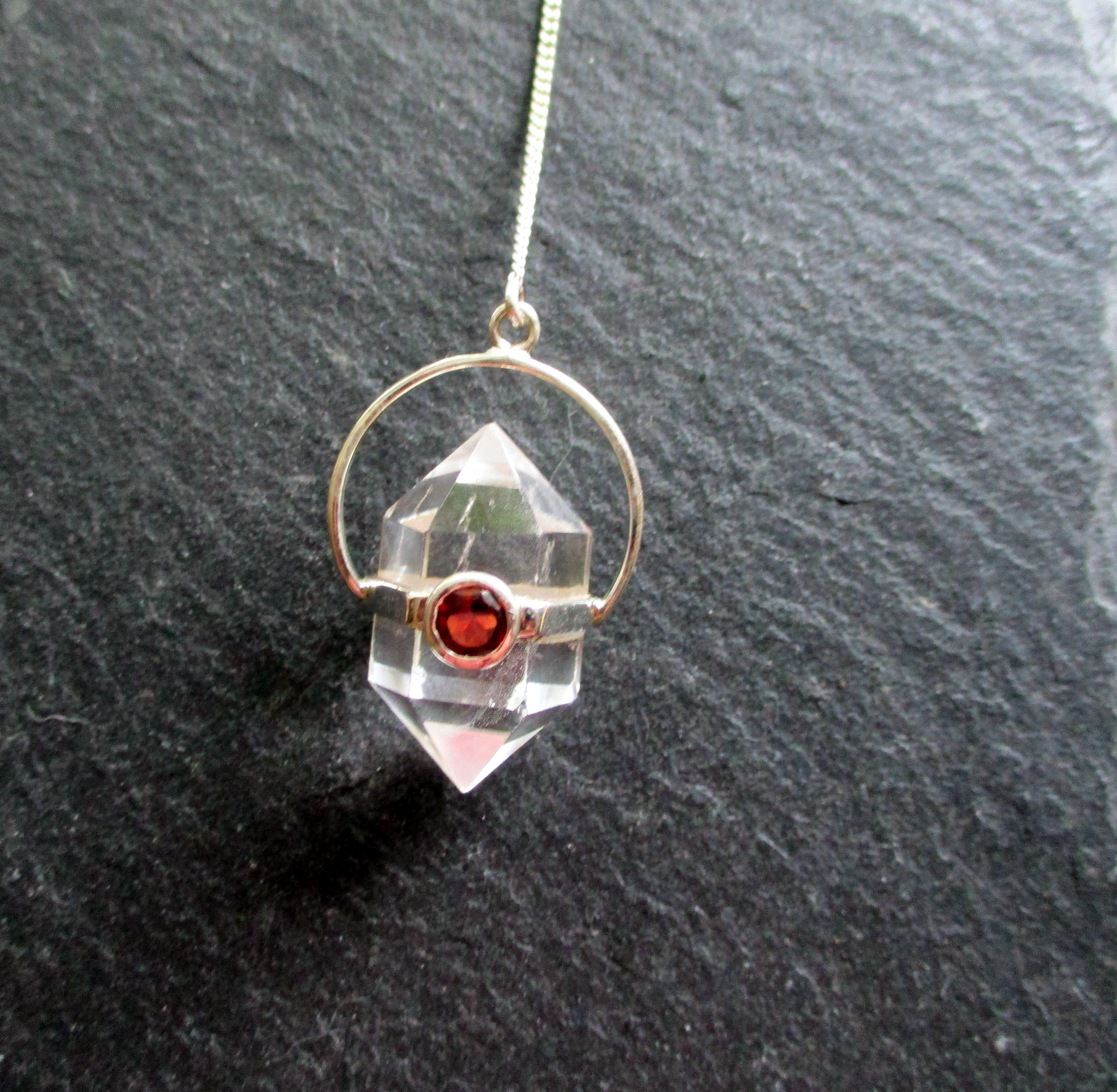 Pendel, Bergkristall Pendel, Doppelender, Silber, Granat, Schamane