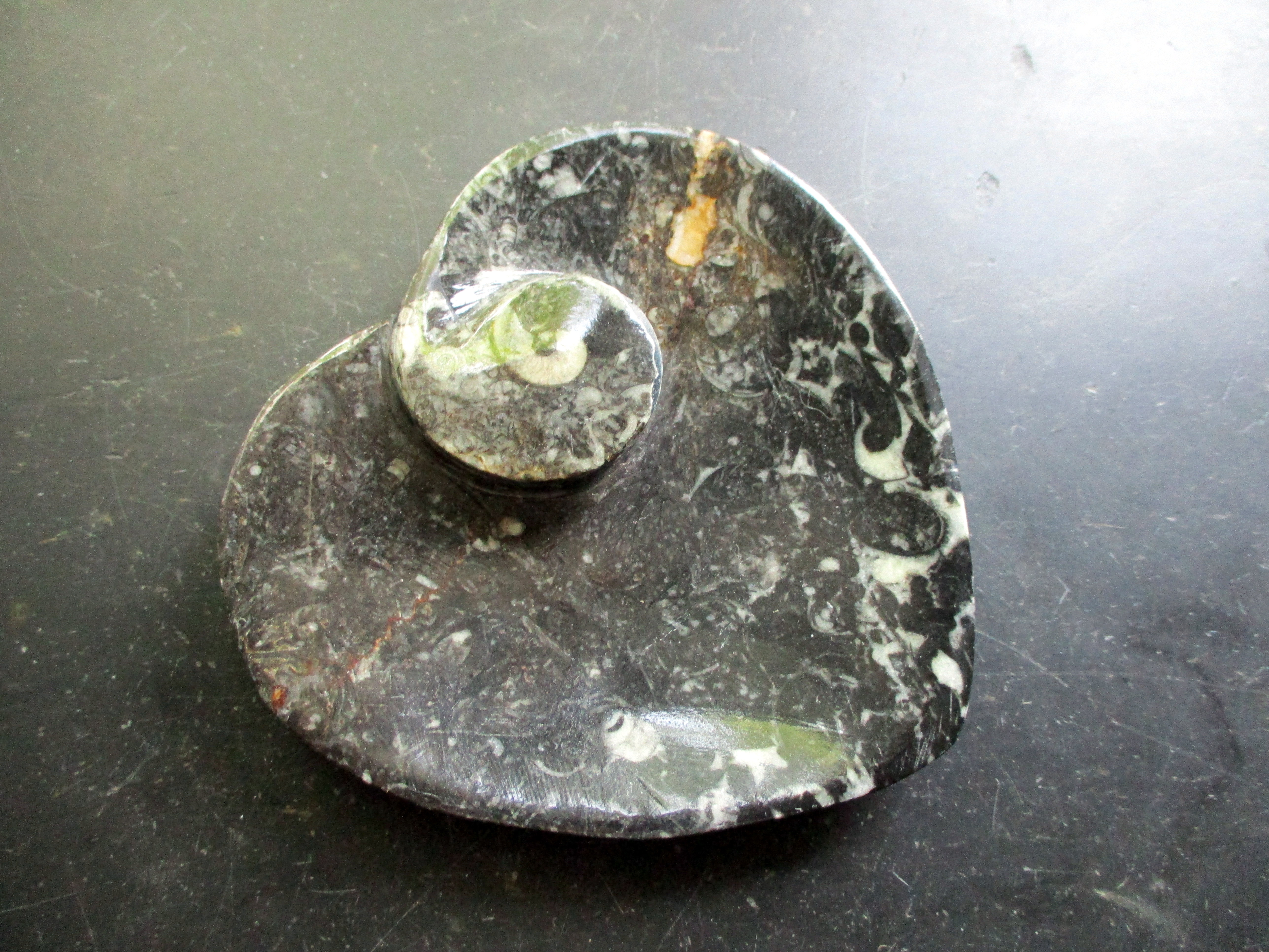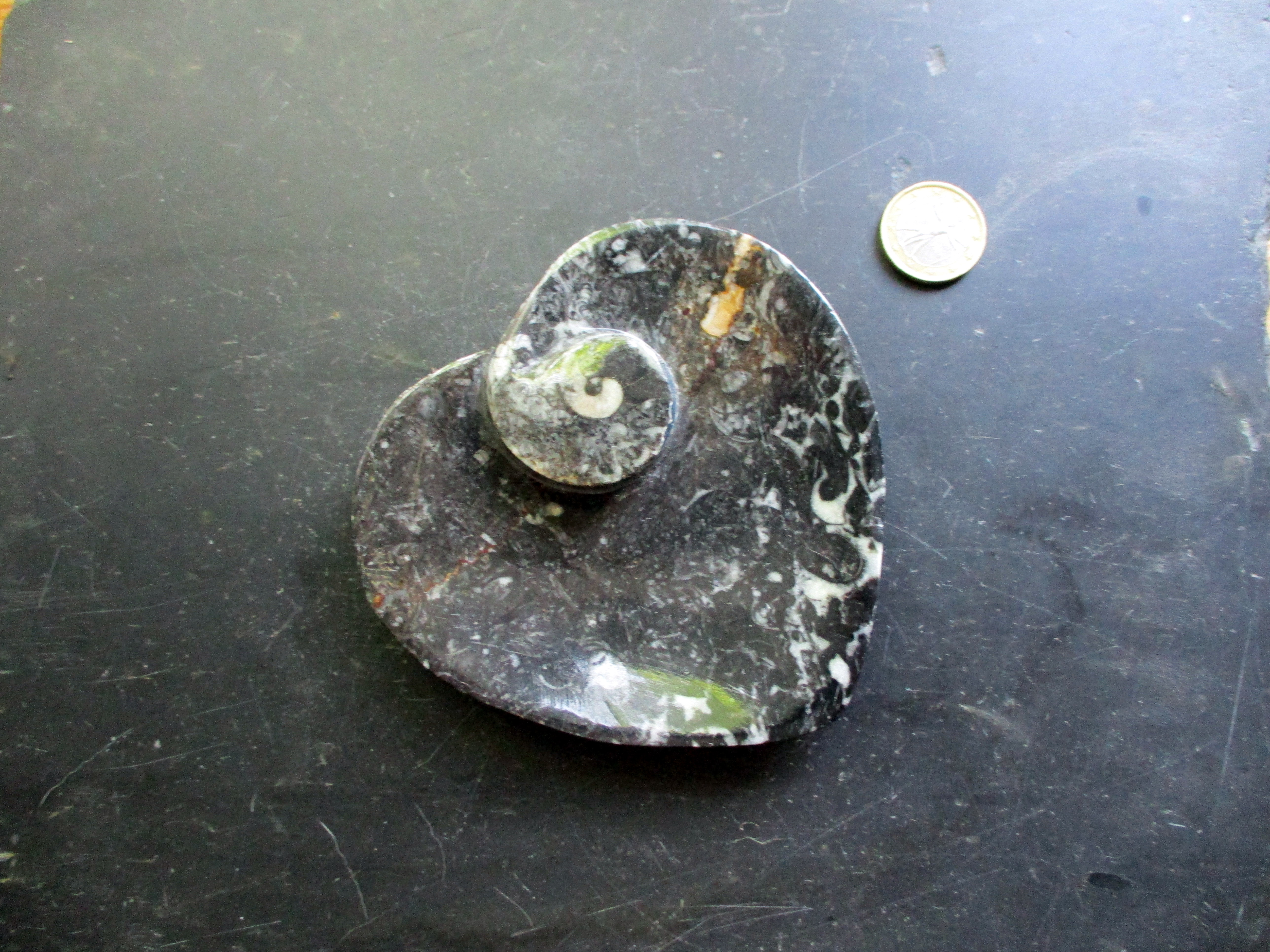 In Herzform ist diese Schale aus Orthoceras geschliffen.